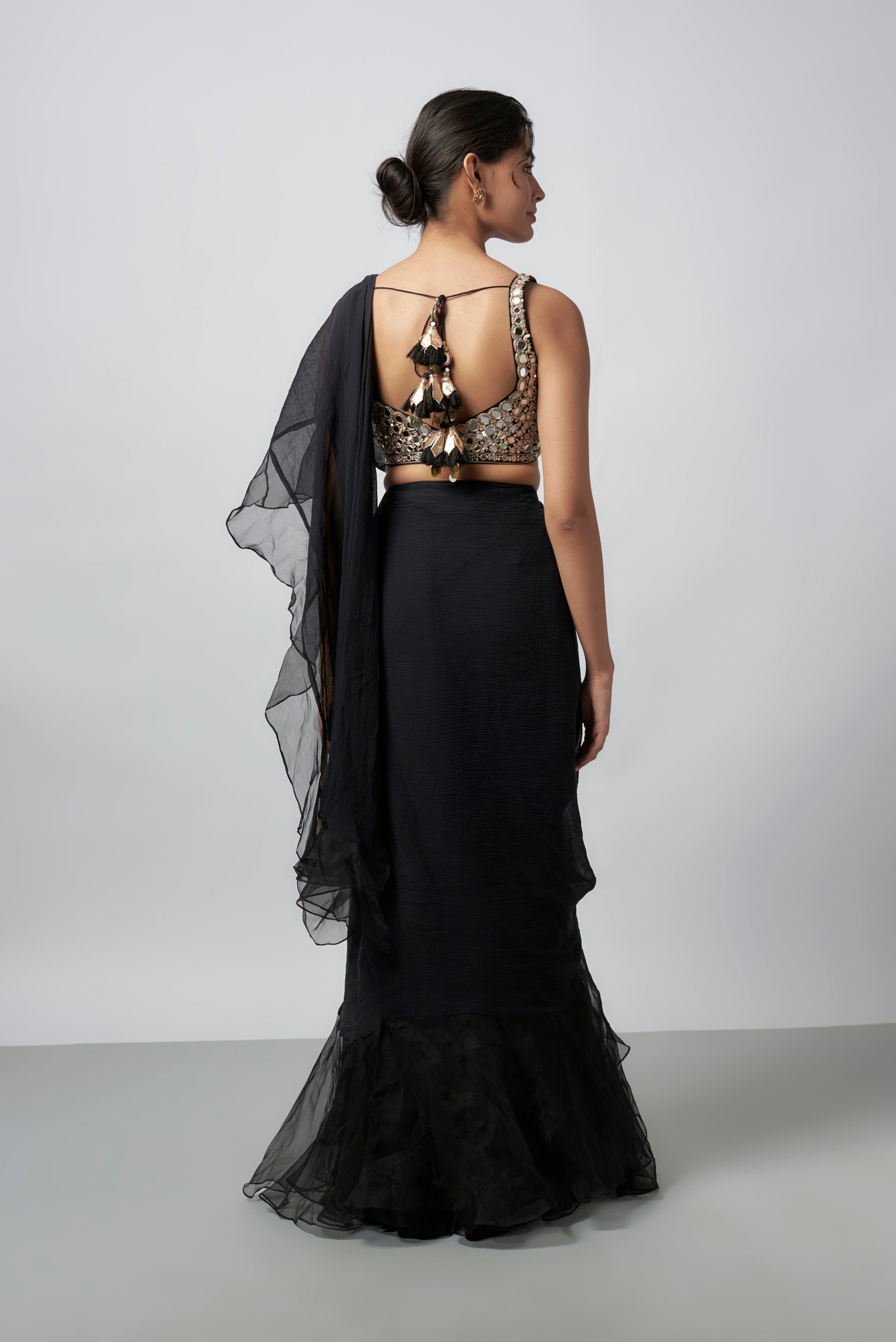 This Saree Features Cascading Layers Of Soft Ruffles, Creating A Dramatic And Fluid Silhouette. Paired With A Stunning Hand Embroidered, Mirror-Embellished Blouse The Outfit Blends Traditional Craftsmanship With Contemporary Design.