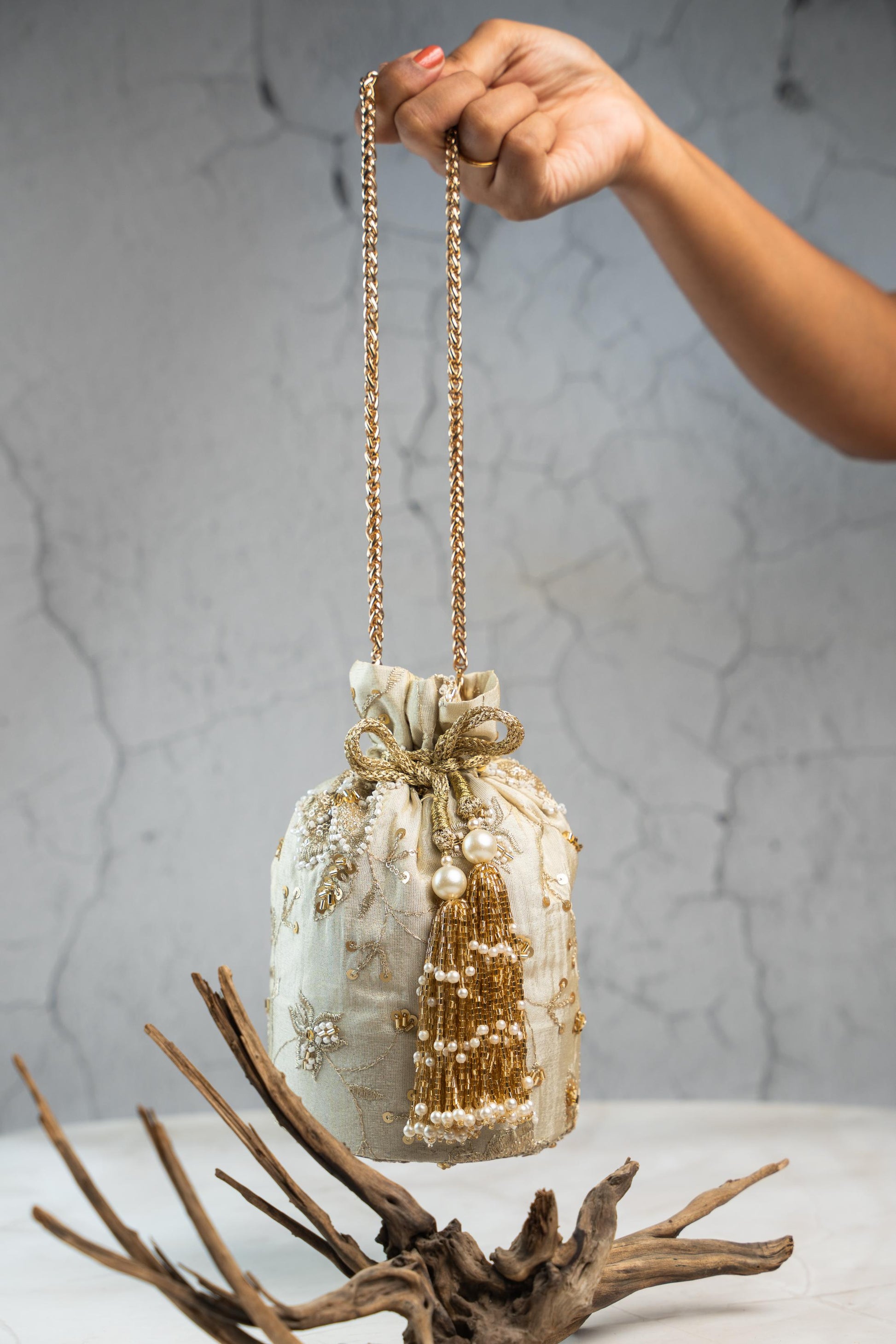Effortlessly Elegant, This Bucket-Shaped Bag Is Crafted In Soft Off-White And Cream Tones Using A Jute-Inspired Fabric That Adds Natural Texture And Charm. The Subtle Self-Colour Embroidery Is Beautifully Complemented By Delicate Sequin Work In Light Gold, Silver, And White Hues—Offering Just The Right Amount Of Shimmer. Lightweight And Refined, This Bag Embodies The Less Is More Philosophy, Making It A Graceful Choice For Day Functions, Festive Gatherings, Or Understated Evening Looks.