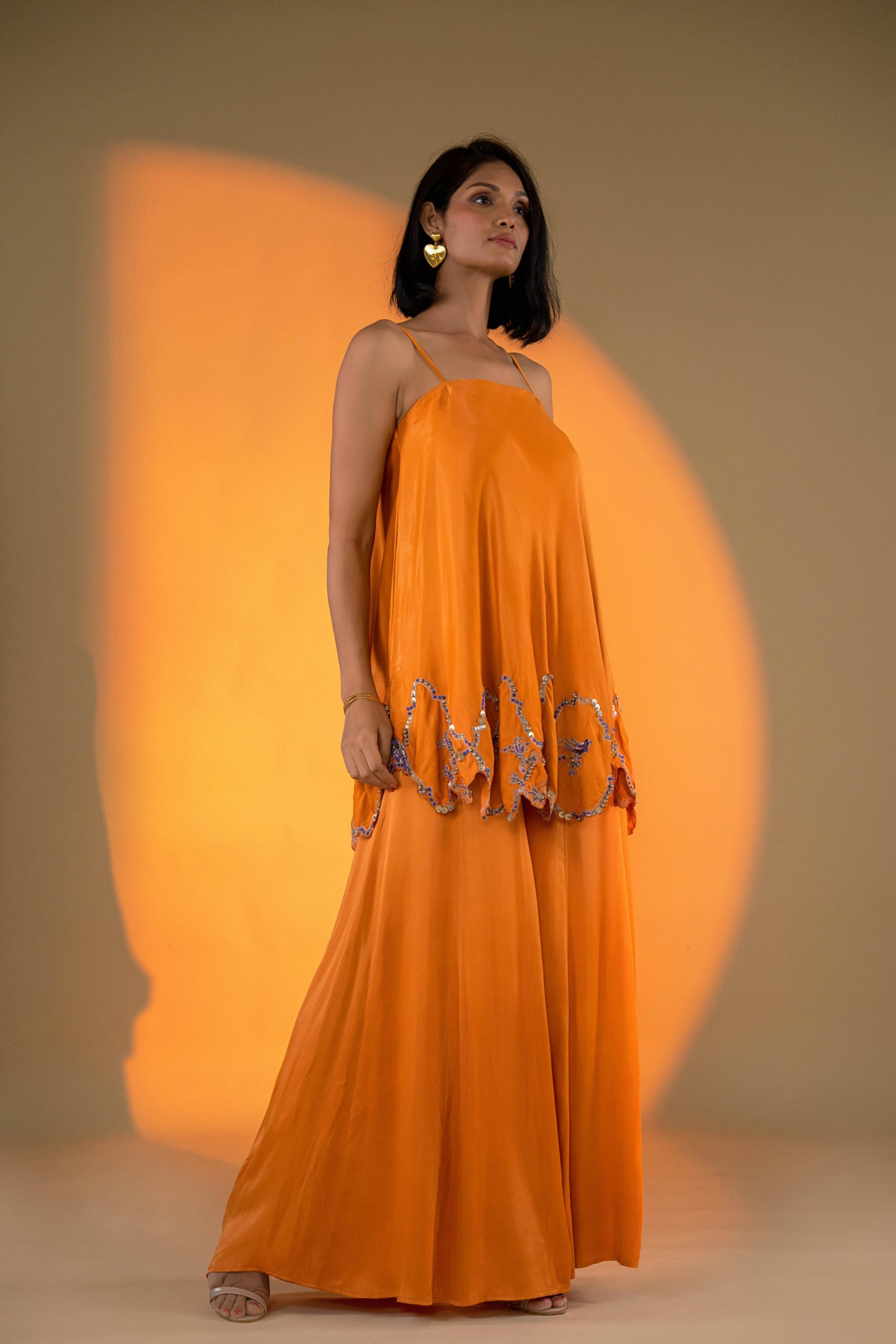 Add A Bold Touch To Your Wardrobe With This Rust Orange Kurta Set. The Kurta Features Cut Sleeves And Detailed Embroidery, Perfectly Paired With A Flowing Sharara. Ideal For Making A Striking And Elegant Statement At Any Event.