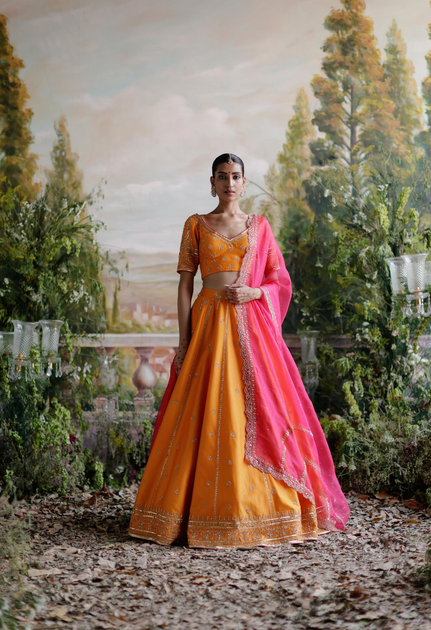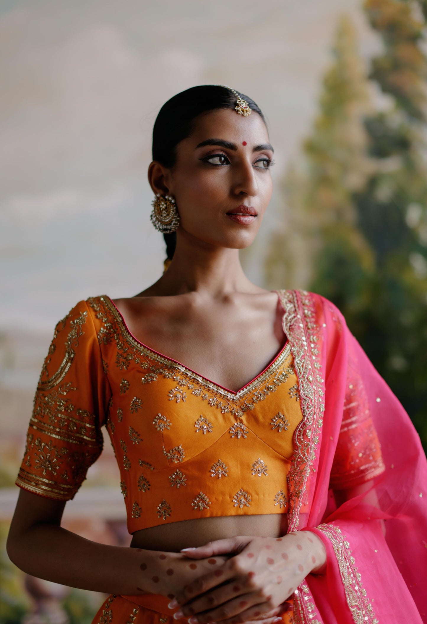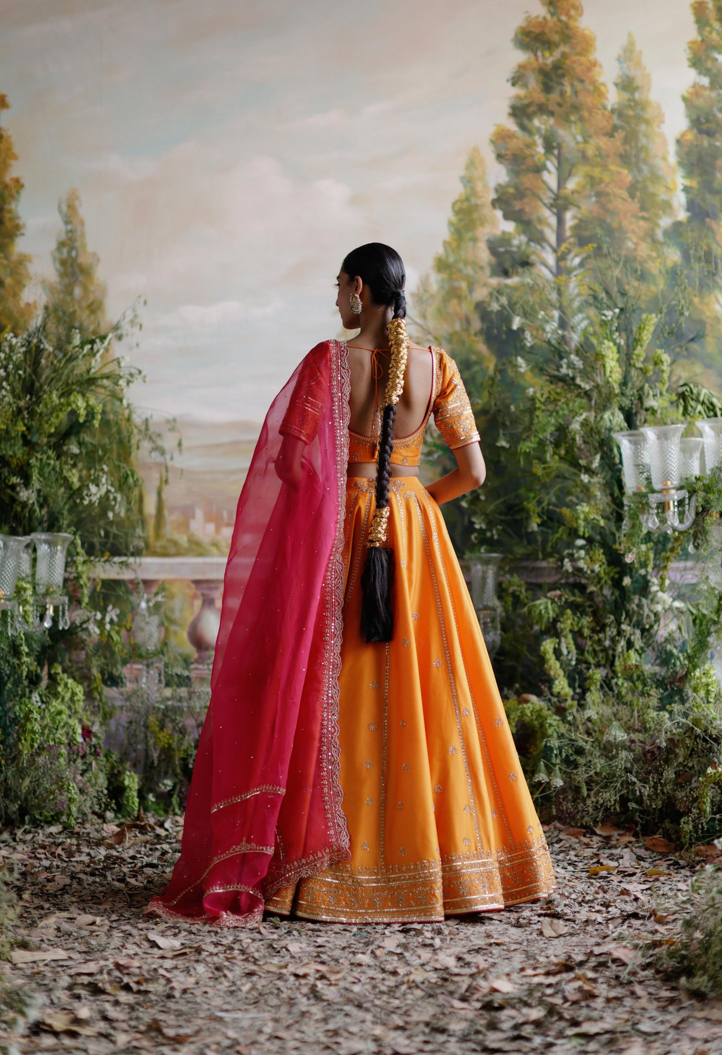 This Ensemble Is A Celebration Of Vibrant Hues And Traditional Charm, Designed To Make A Memorable Statement On Special Occasions. Adorned With Delicate Hand Embroidery And Antique Gold Dori, The Lehenga Pays Homage To The Rich Heritage Of Indian Craftsmanship. The Bold Orange Hue Exudes Energy And Charisma, Making It An Ideal Choice For A Range Of Celebrations. Whether You'Re Attending A Wedding, A Cultural Event, Or A Special Celebration, The Orange Lehenga Set Will Ensure You Shine With Vibrant Elegance And Timeless Allure.