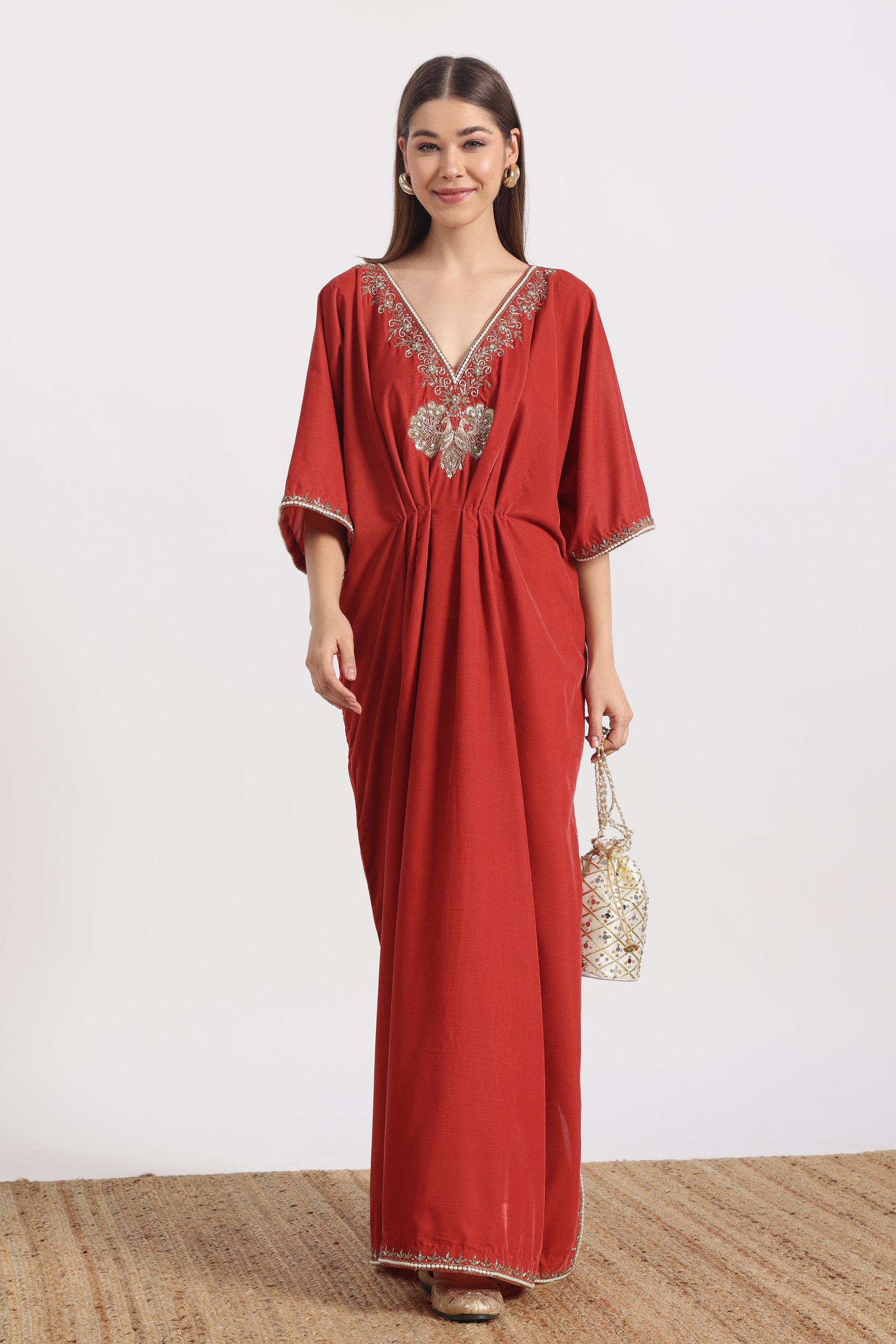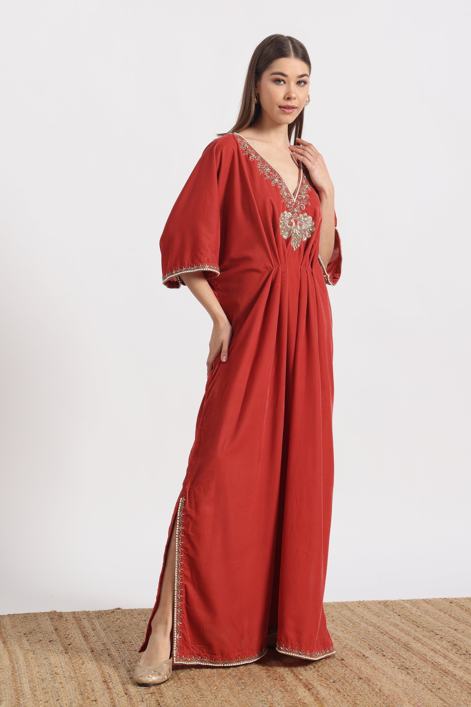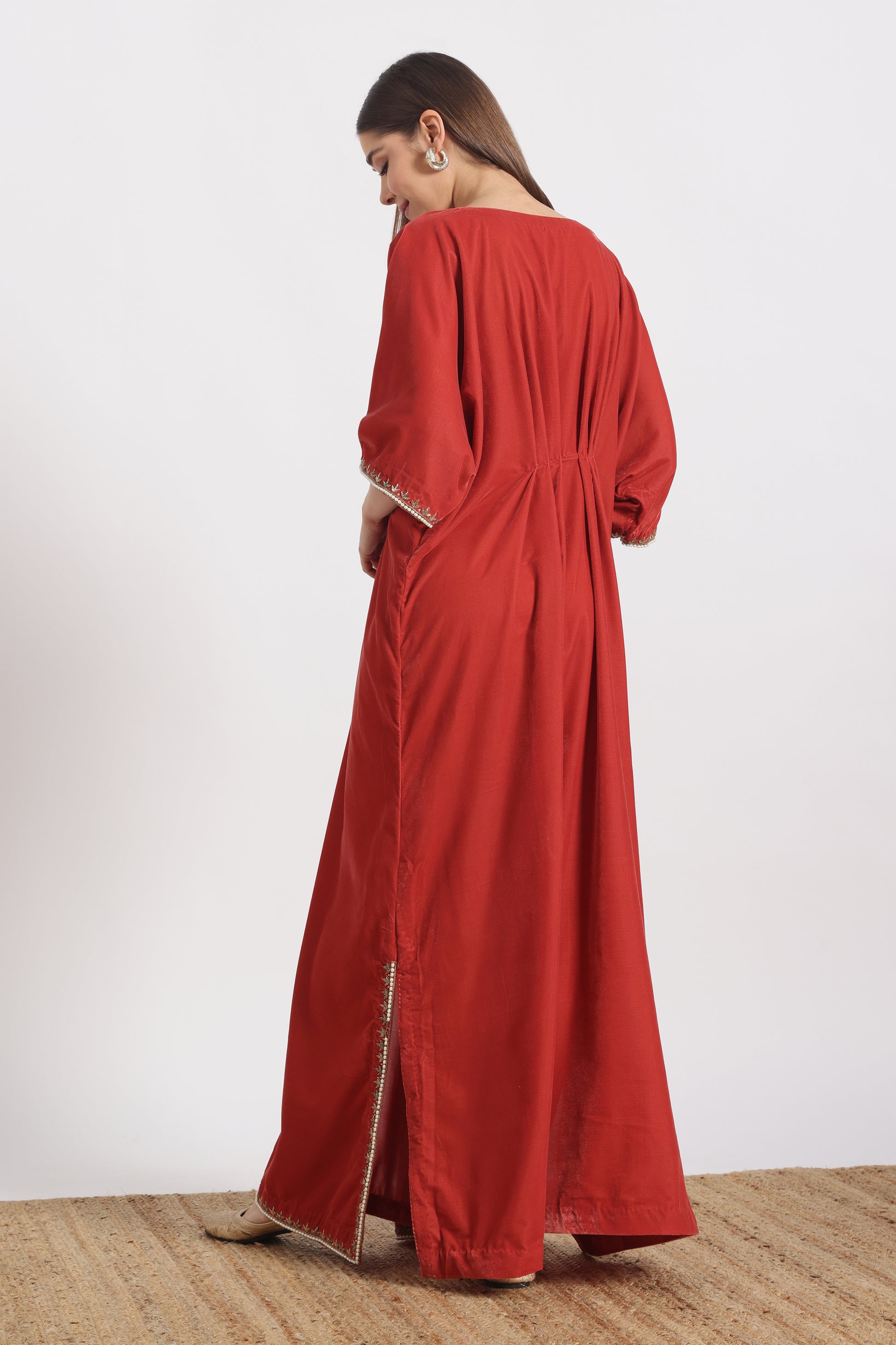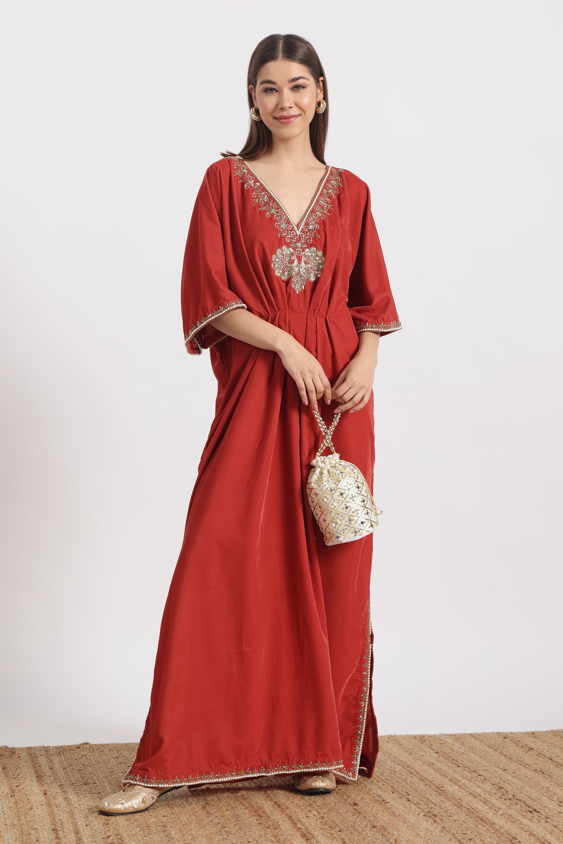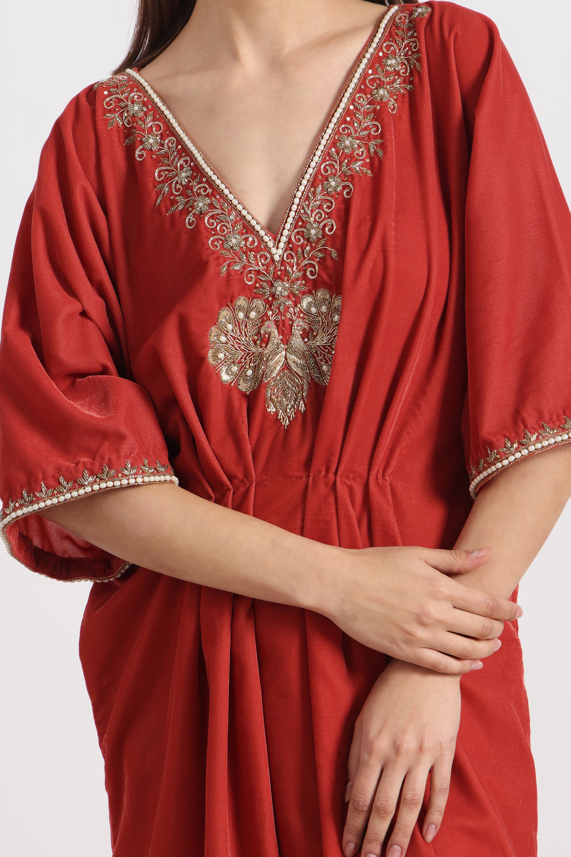 Peach Velvet Kaftan With Antique Gold Zari Embroidery And Pearl-Detailed Neckline. Features Twin Peacock Motifs And Gathered Pleats. Festive, Elegant, And Flattering For All Body Types.