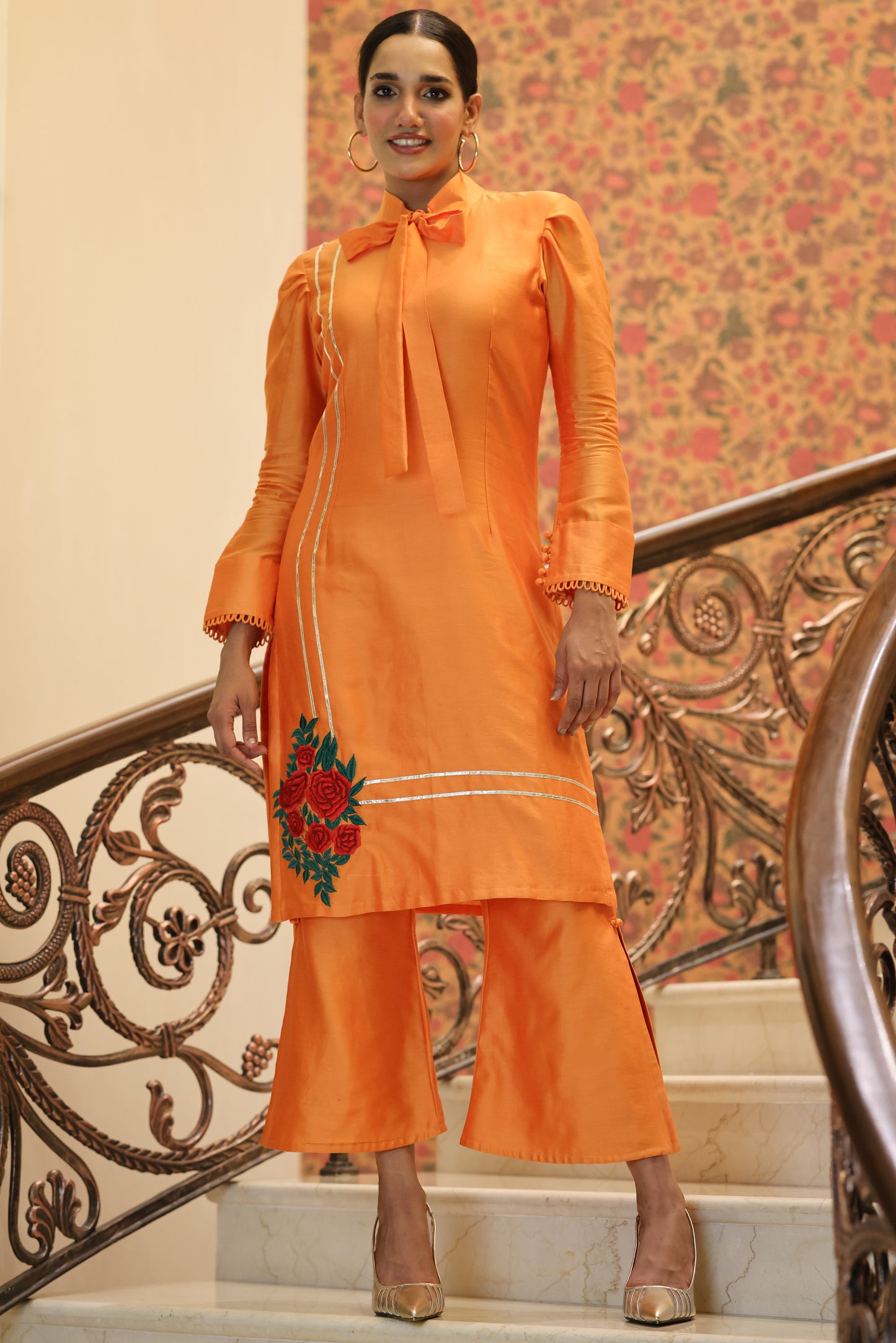 Orange High Collar And Tie-Neck Kurta Based On Chanderi Cotton Feature Finely Detailed Gota Work And Embroidery On Damaan And Loop Details On Sleeves.