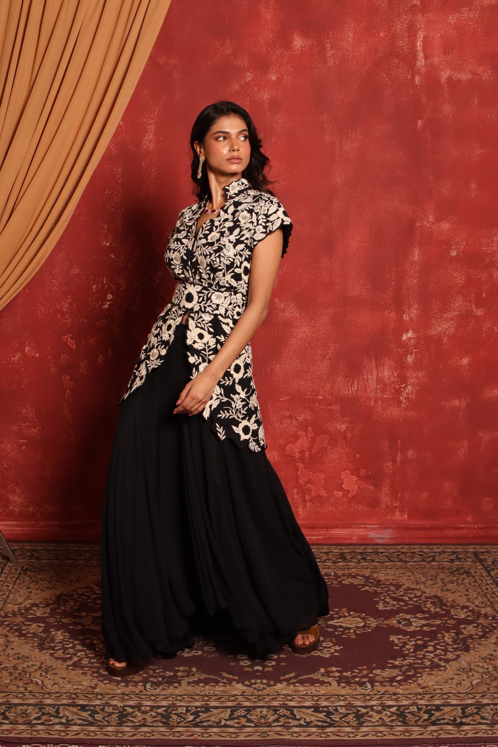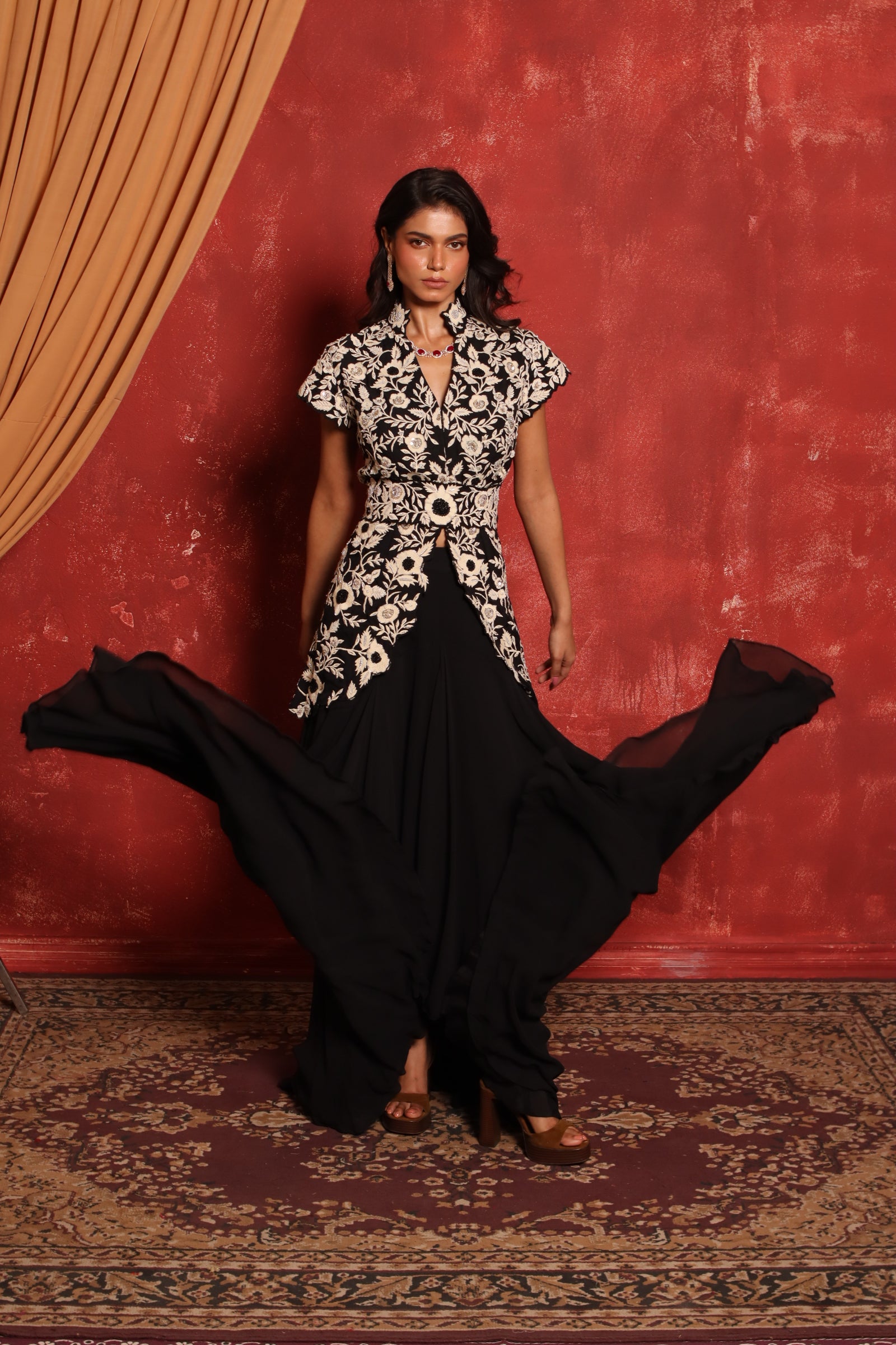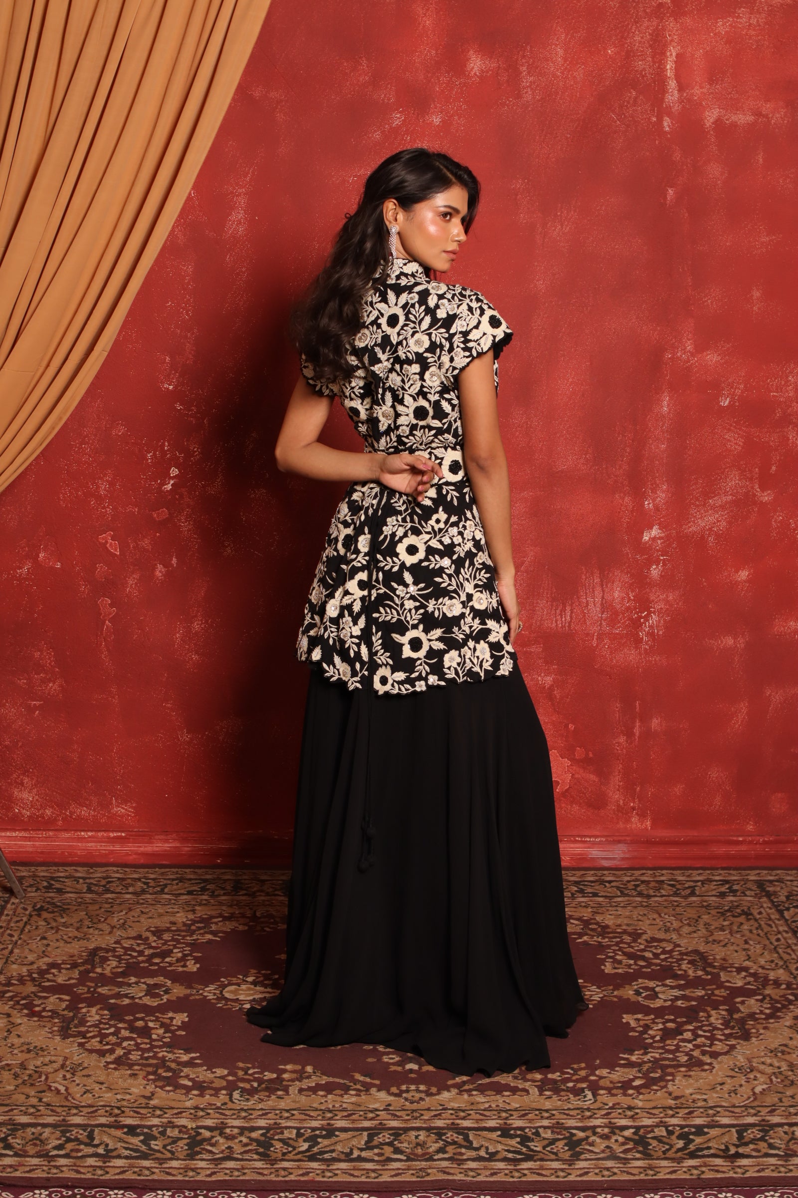 Where Glamour Meets Grace! Step Into A Realm Of Artistry With This Impeccably Crafted Asymmetrical Wonder. The Fluid Skirt & Artistically Enriched Jacket With A Belt Create A Seamless Fusion Of Contemporary Charm & Ageless Refinement, Ensuring You Stand Out At Any Occasion.