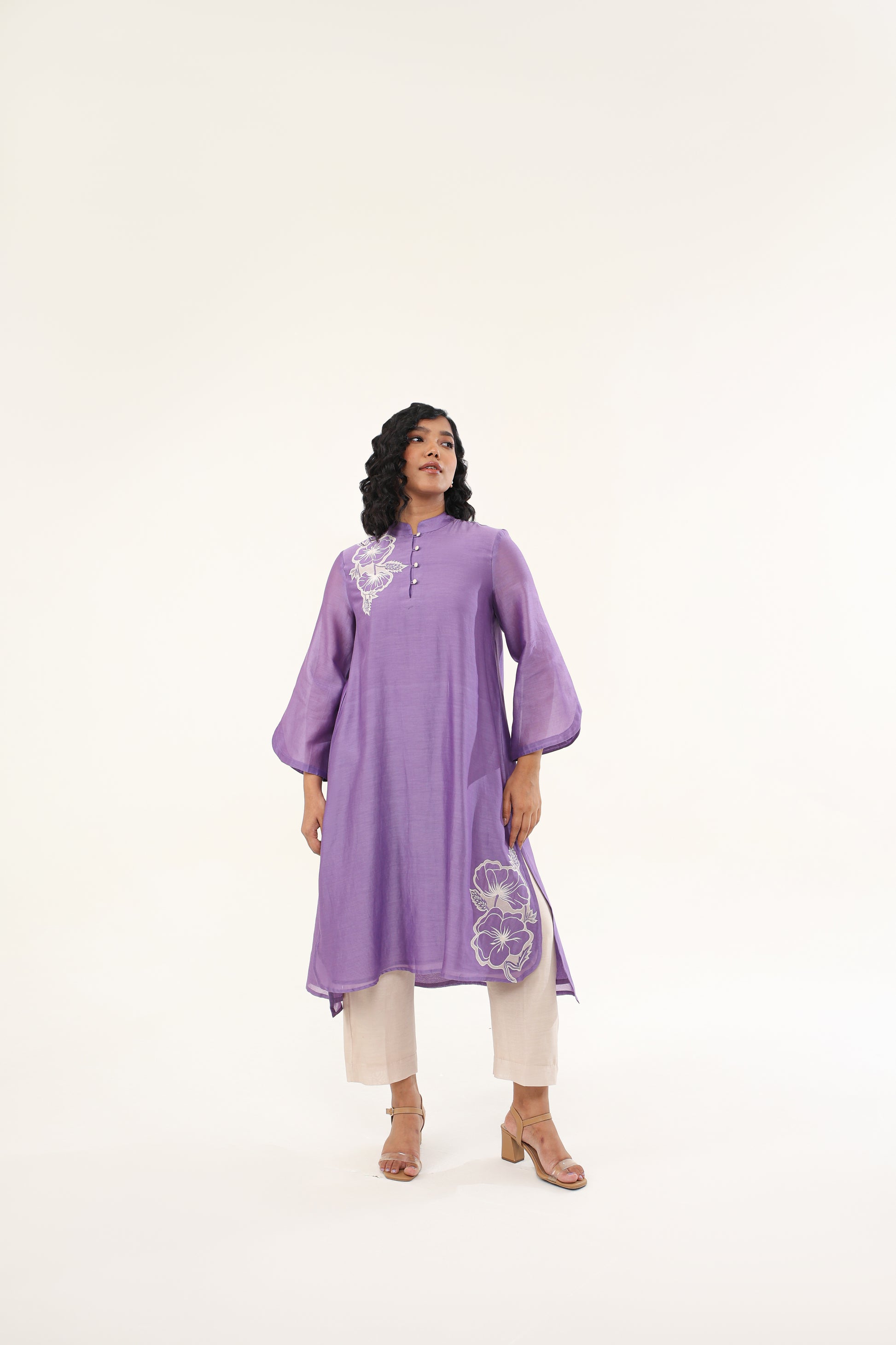 This Suit Set Is Adorned With Exquisite Threadwork And Appliqué On Both The Front And Back Panels, With Box Pleats At The Back For A Smart, Chic Look. Paired With Contrasting Off-White Pants Featuring Convenient Pockets, This Ensemble Offers Both Elegance And Style.
