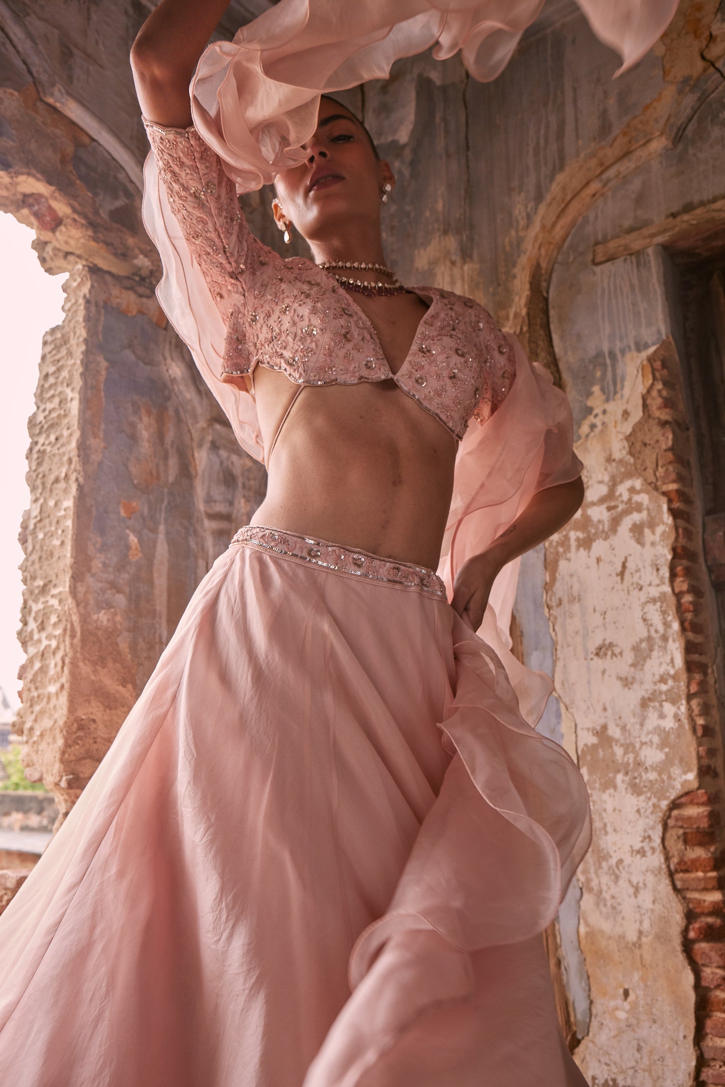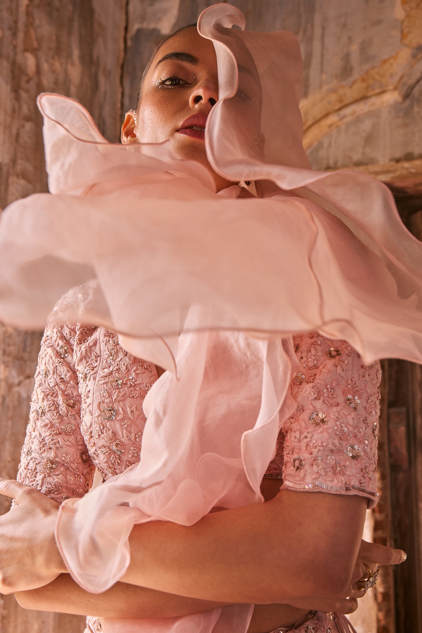 To Complete This Ensemble, A Ruffled Dupatta Is Paired With It, Creating A Romantic And Fashionable Contrast. A Plain Potli Bag Is Included, Enhancing The Overall Appeal And Completeness Of The Outfit. The Blush Pink Organza Lehenga By Label Mayaa Is A Perfect Choice For A Modern Yet Timeless Look, Making It Suitable For A Variety Of Occasions, From Weddings To Festive Celebrations.