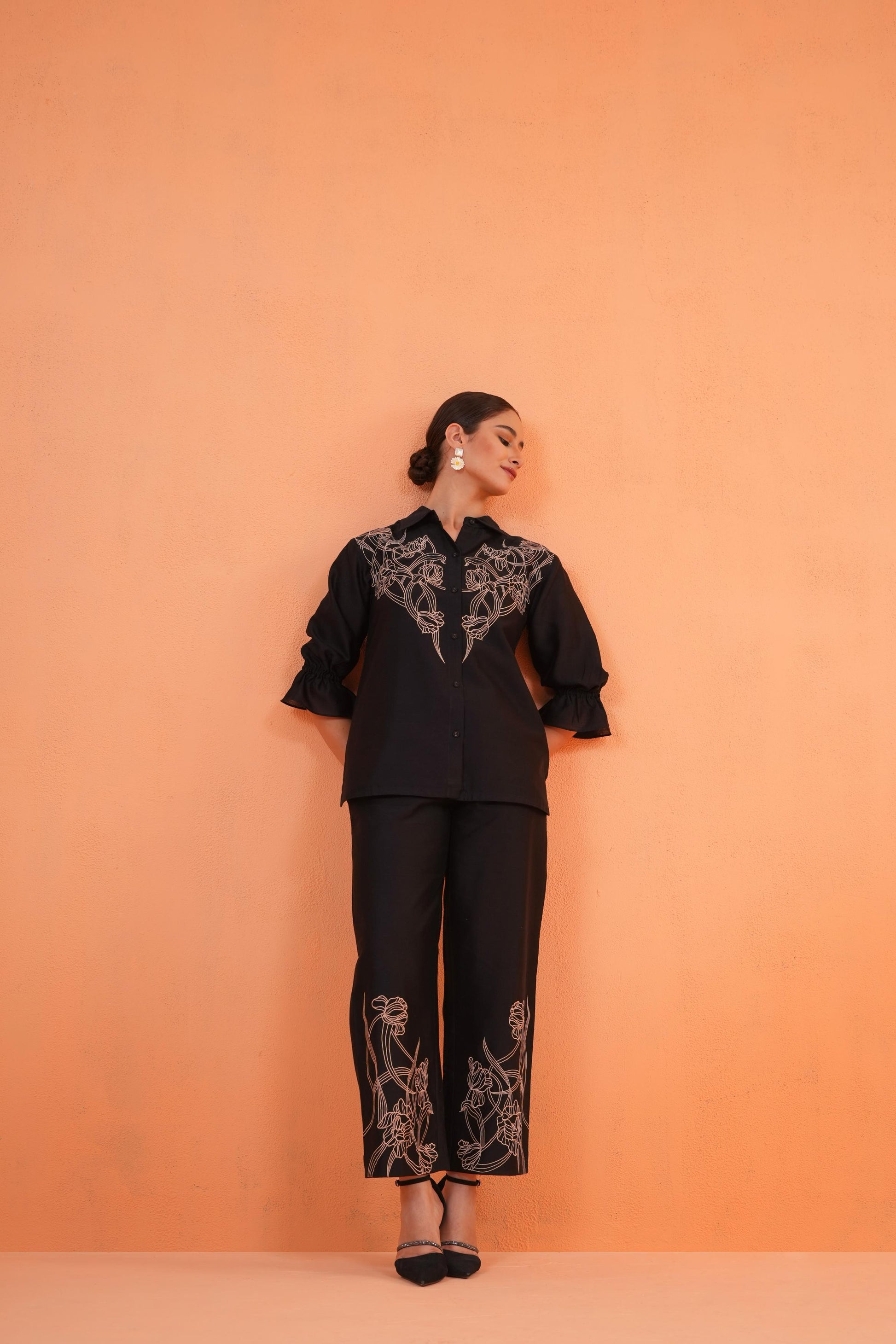 Black Chanderi Silk Co-Ord Set Highlighted With Contrast Resham Thread Embroidery, Styled With Intricately Embroidered Pants.
