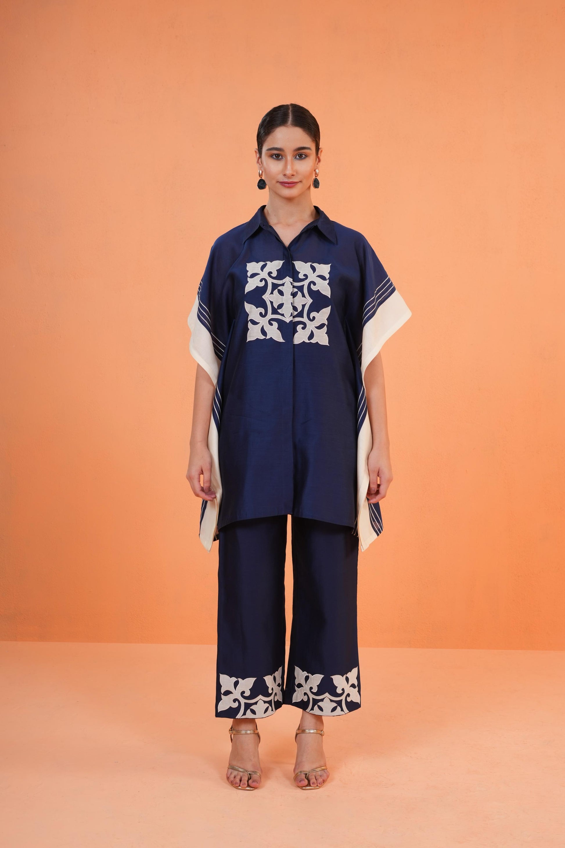Blue And Ivory Chanderi Silk Kaftan-Styled Tunic Set, With Intricate Appliqué And Resham Embroidery Paired With Coordinated Pants.
