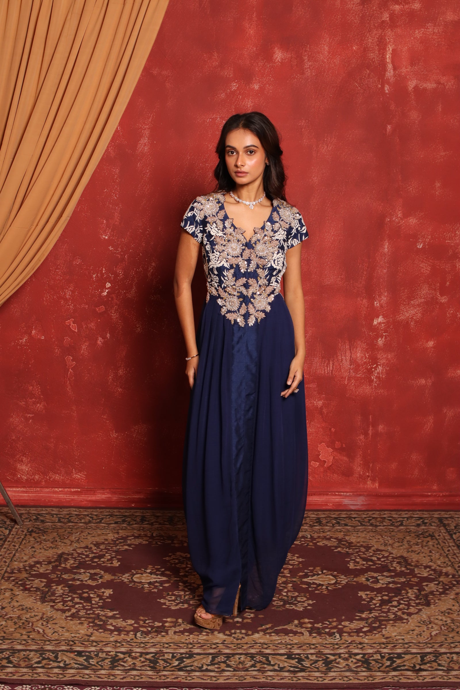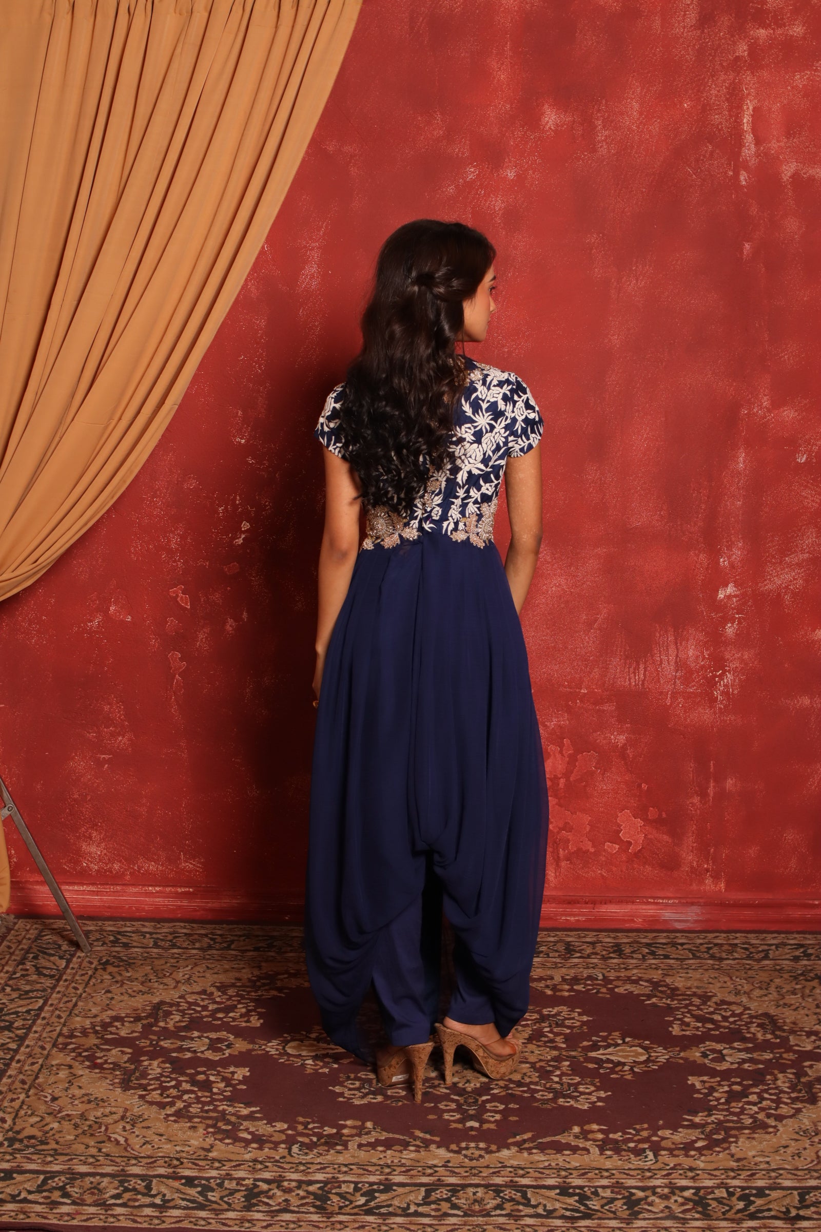 Navy Blue Tunic & Pants Set! The Intricately Embroidered Yoke, Featuring 3D Cut Flowers Adds A Touch Of Luxury While The Flowing Cowl Back Adds A Touch Of Drama. Paired With Straight Pants For A Complete Look You'll Love.