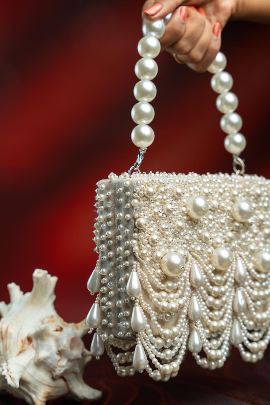 An Incredible Off White Box Clutch Decorated With Pearl Scallops N Tassels All Over Making It A Convenient And Fashionable Addition To Any Outfit.