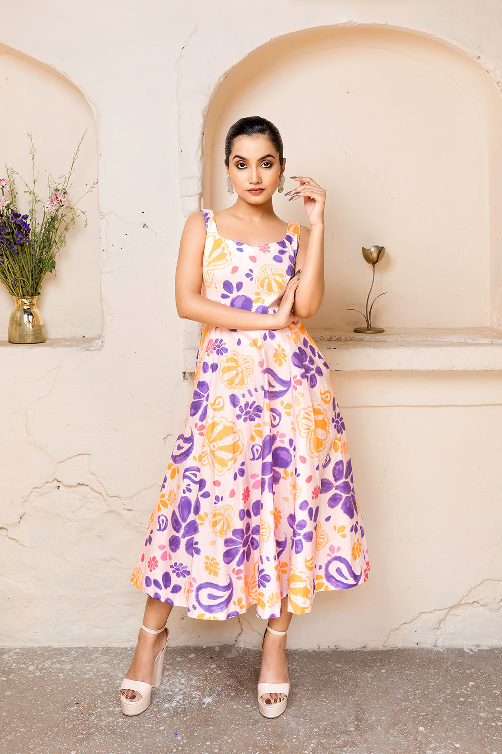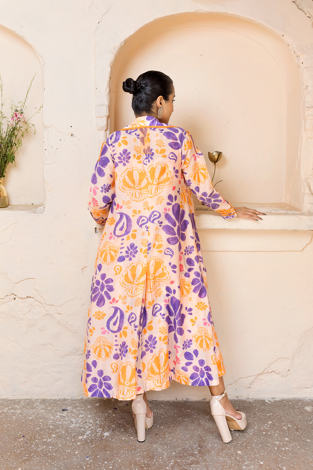 This Scoop Neckline Printed Flared Dress Pairs Elegantly With A Cotton Silk Shrug Jacket, Featuring Contrasting Pipings And Intricate Thread Stitch Details. Inspired By Paisley And Floral Motifs From 'Mata Ni Pachedi' Painting, This Versatile Ensemble Can Be Worn Together Or Separately.