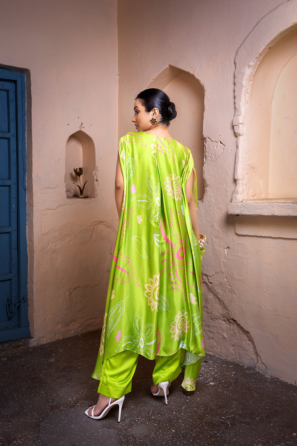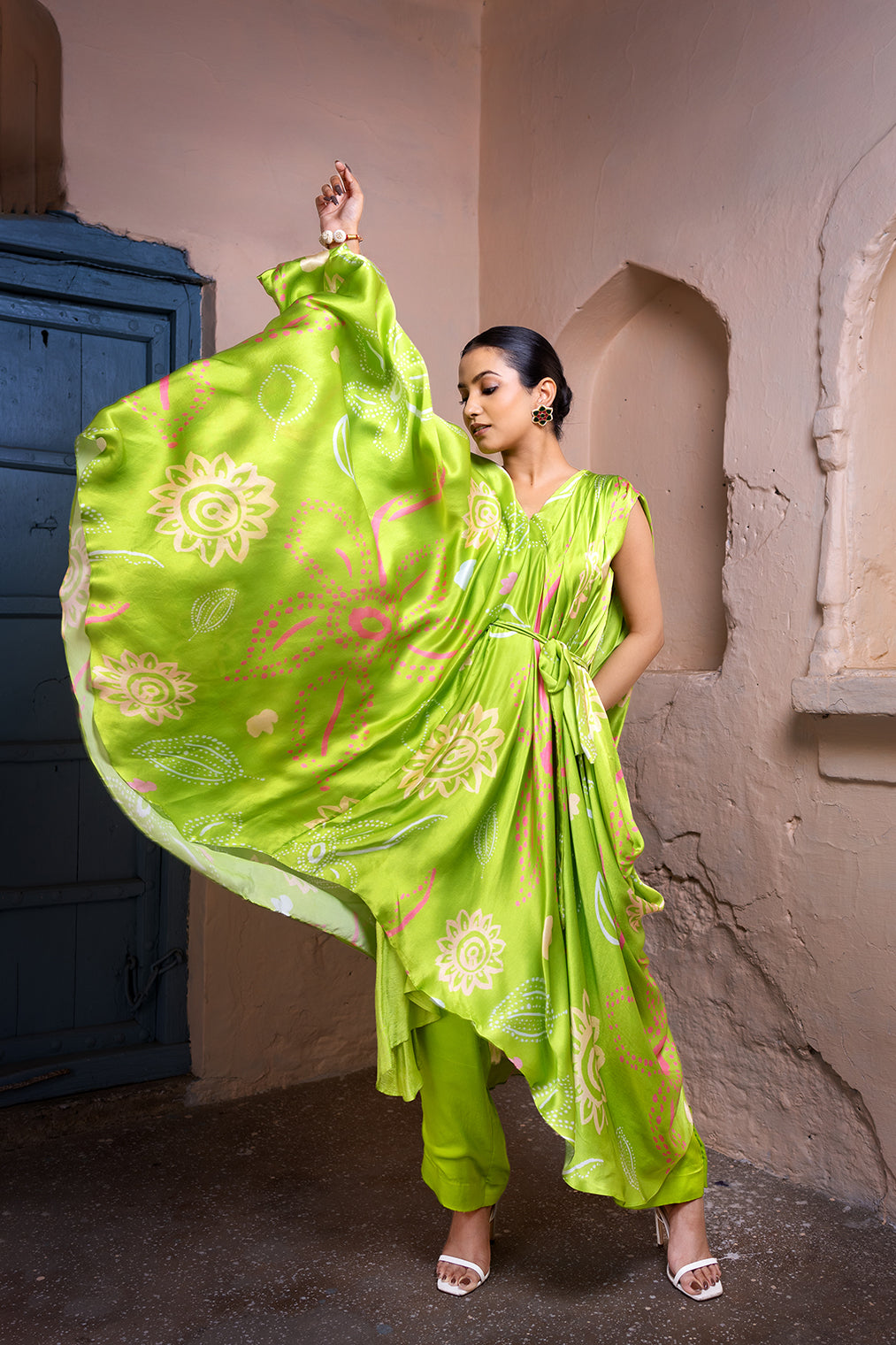 Floral Printed, Draped Asymmetric Tunic Teamed With Pants, Features A Stylish Tie-Up Belt. Inspired By 'Mata Ni Pachedi' Painting Floral Motifs.