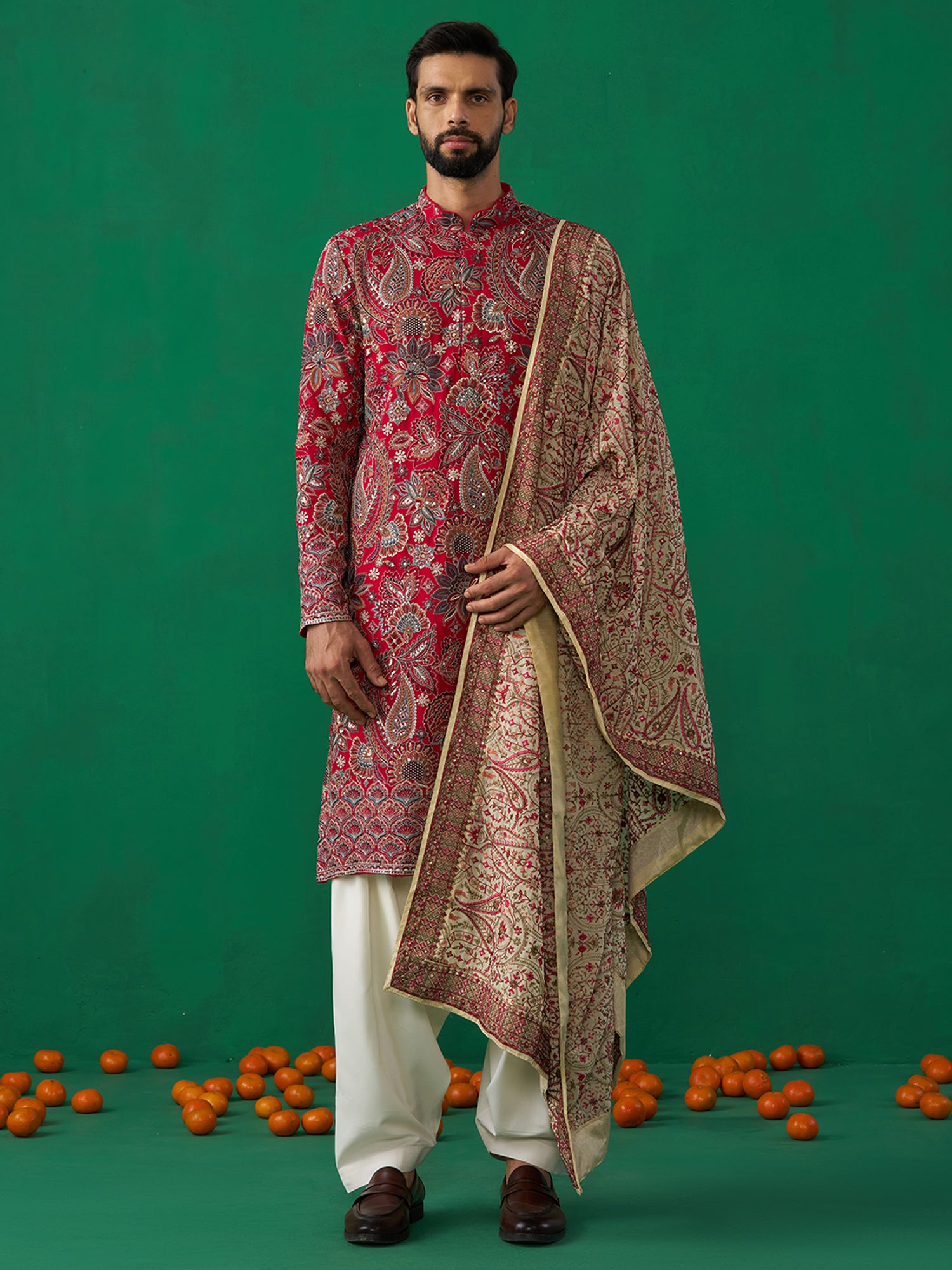 This Kurta Set Is Suitable For Festive And Wedding Wear. It Features A Long-Sleeved Kurta With A Dense, All-Over Pattern Of Floral And Paisley Embroidery. The Detailed Embroidery Covers The Entire Garment, Including The Sleeves And Hemline. The Set Includes A Contrasting Dupatta With A Wide, Ornate Border Of Intricate Embroidery And Patiyala Trousers, Which Are Wide At The Top And Gathered At The Ankles, Creating A Pleated, Draped Effect.