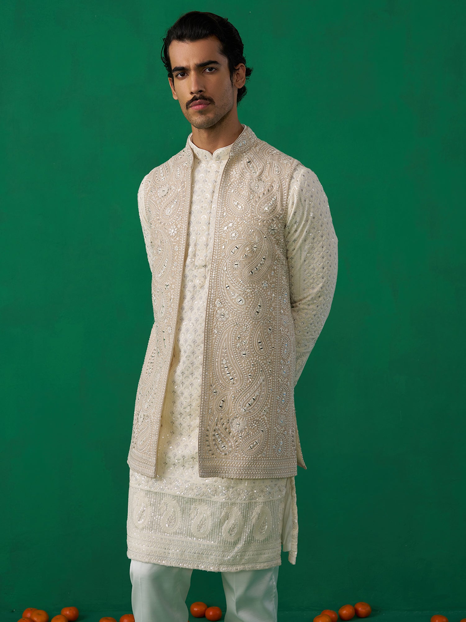 The Outfit Consists Of A Long Kurta With An Embroidered Repeating Pattern. The Kurta Is Paired With Crisp Trousers. Over The Kurta, A Short, Sleeveless Jacket Is Worn, Adorned With Paisely Embroidery.