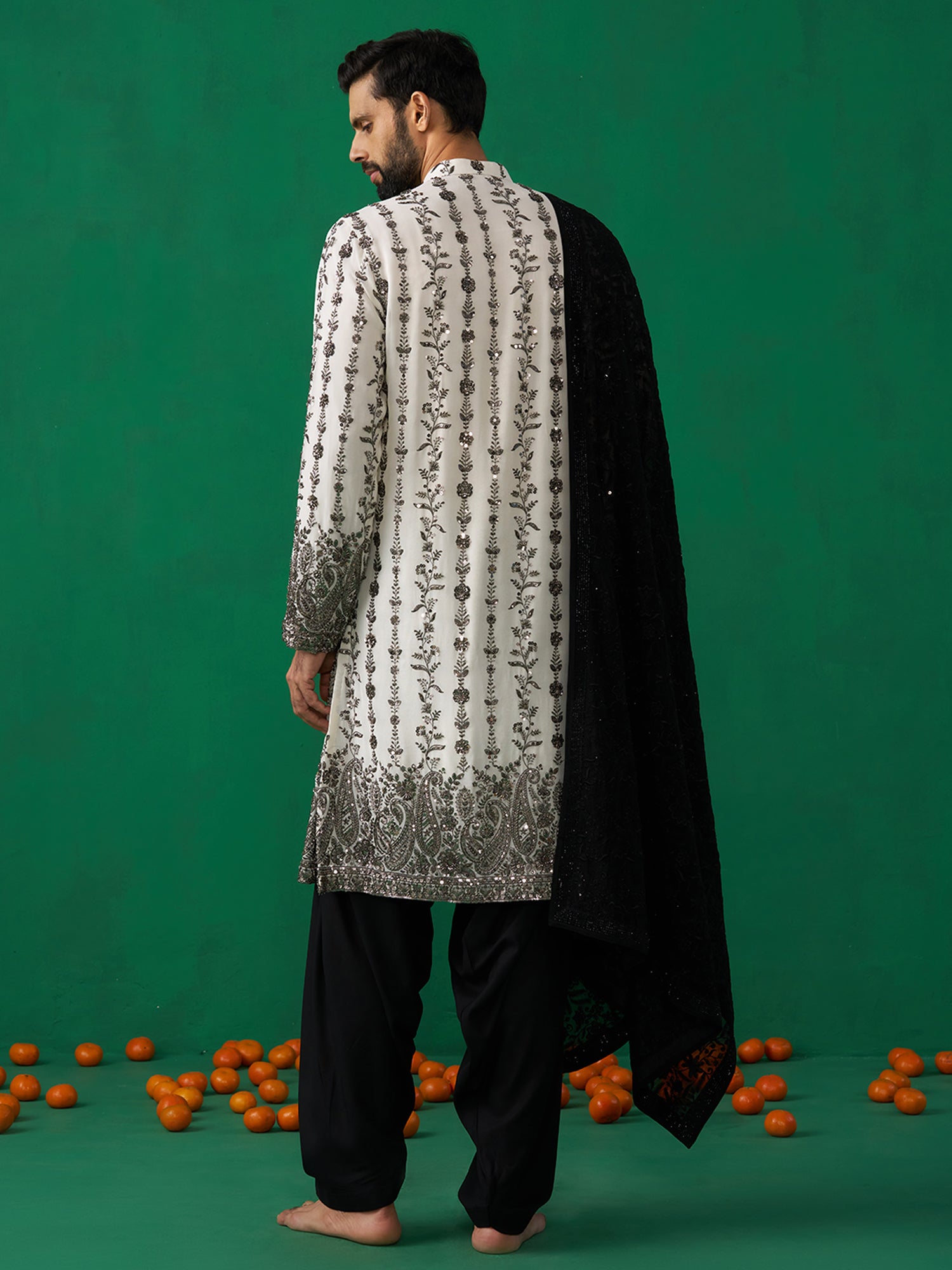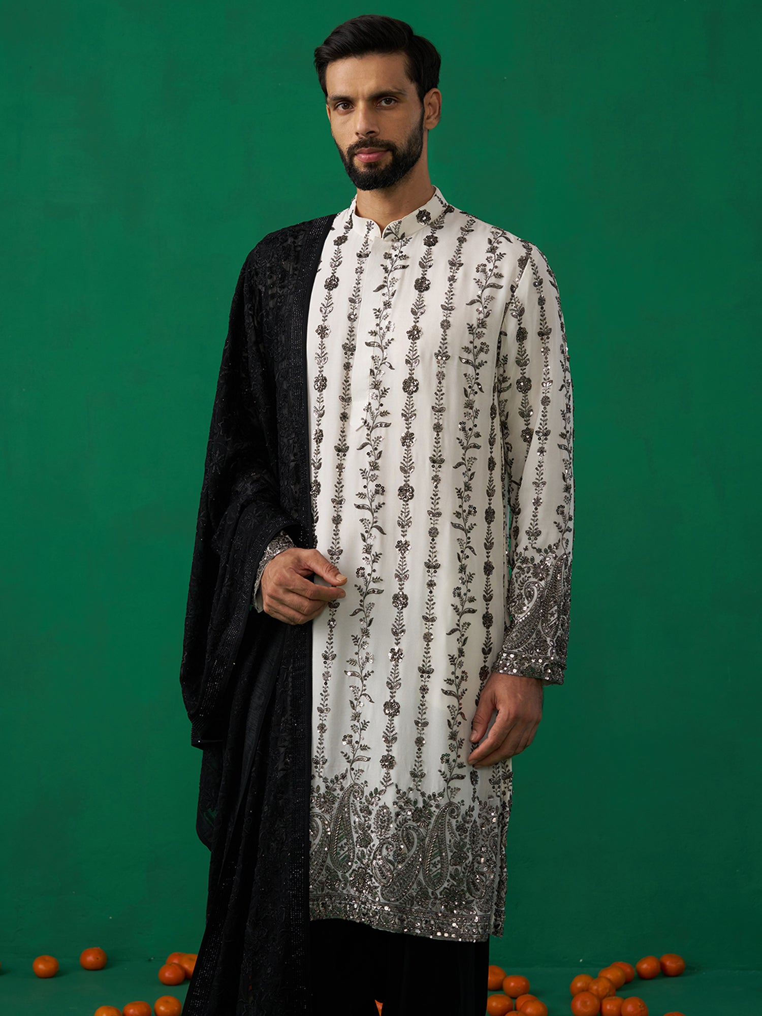 This Ensemble Features A Straight-Cut Kurta Detailed With Vertical Embroidered Patterns And An Ornate, Heavily Worked Border Along The Hem And Sleeves. It Is Paired With Loose, Draped Bottoms That Lend A Relaxed Yet Traditional Silhouette. The Look Is Completed With A Contrasting Heavy Dupatta, Richly Textured And Adding Depth To The Outfit. The Set Combines Refined Embroidery With A Regal Presence, Making It Ideal For Festive Or Ceremonial Occasions.