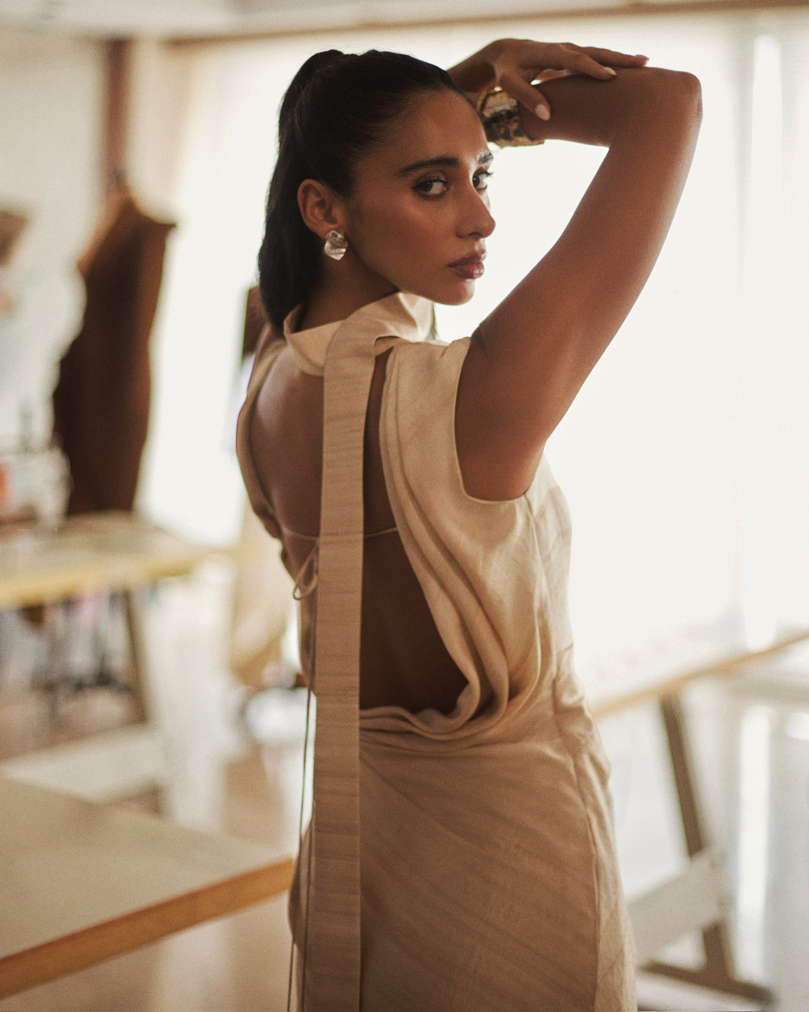 The Back Is Equally Captivating, Featuring Graceful Cowl And Pleat Detailing That Drapes Beautifully Along The Contours Of Your Back. Soft, Fluid, And Sophisticated, The Dress Is Secured With A Back Tie-Up Finished With A Curation Of Mother Of Pearl Tassels.