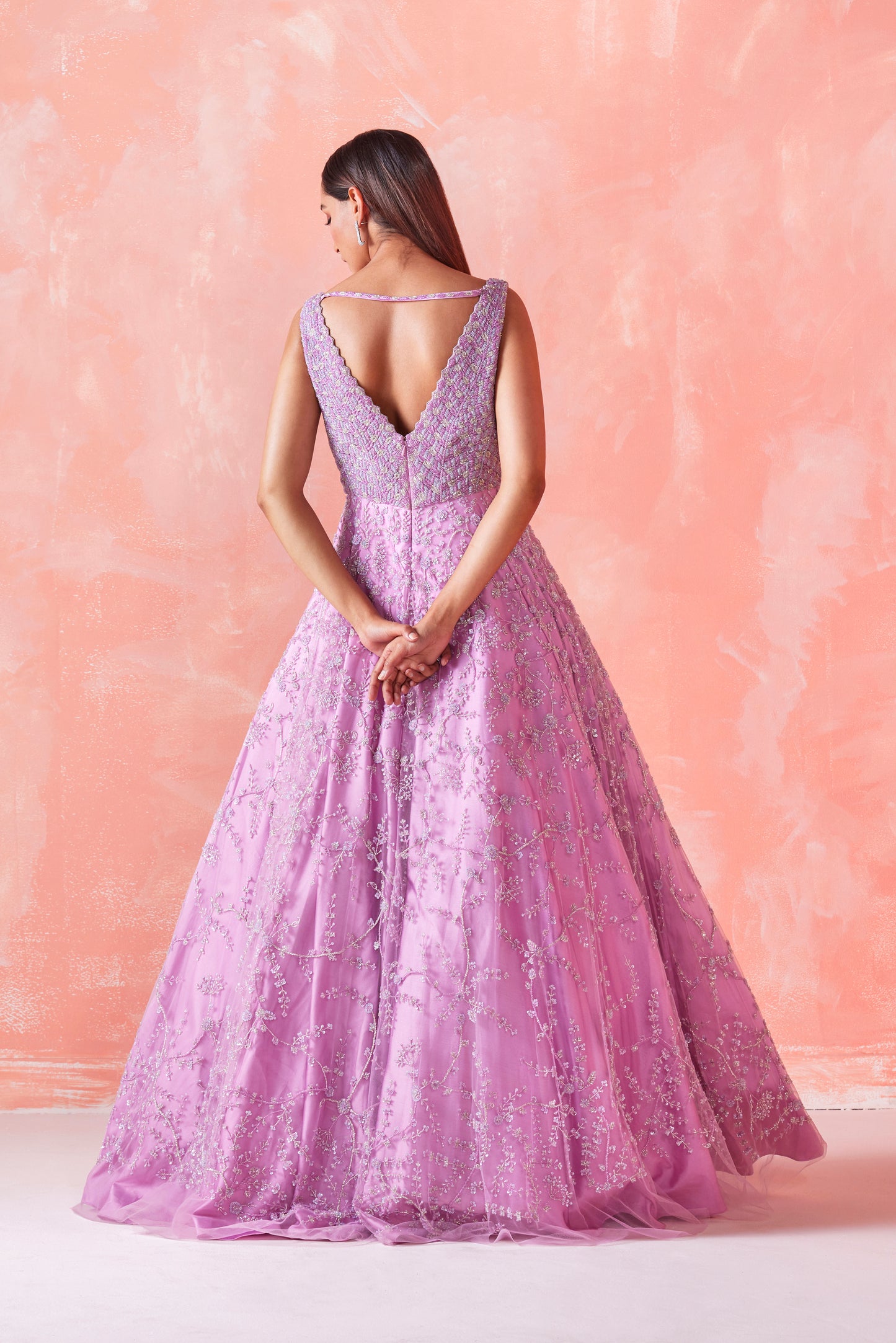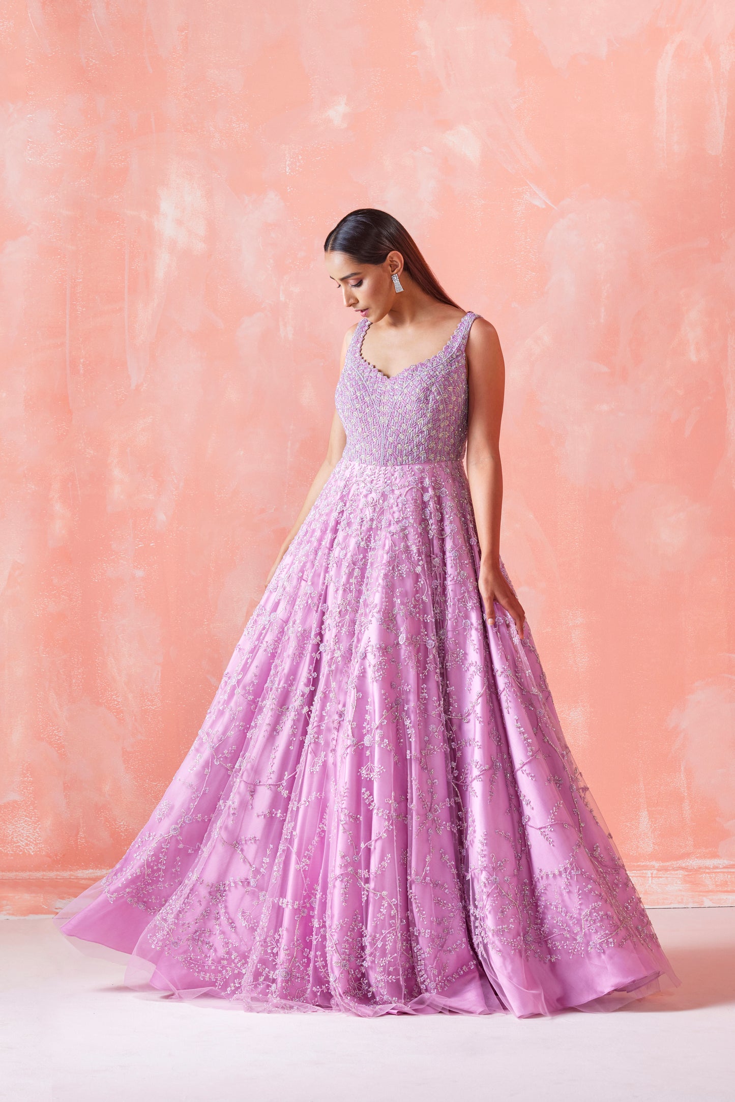 Pastel Pink Gown Based On Net Adorns Intricately Woven Silver Sequins And Beads Embroidery.Colour: Pastel Pink