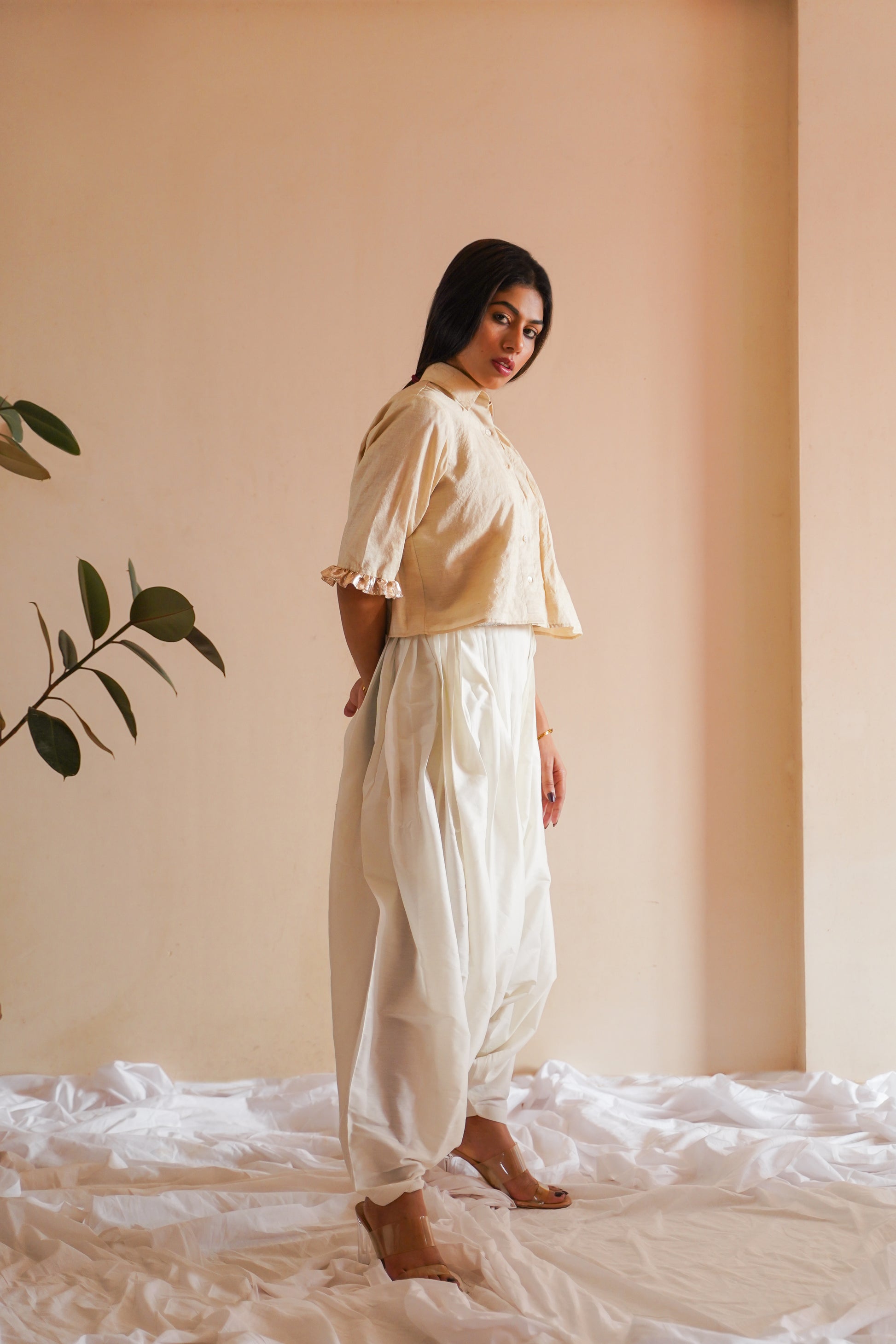 Beige Tussar Silk Boxy, One Side Pleated Shirt, With Ivory Cotton Silk Patiala Pants.
