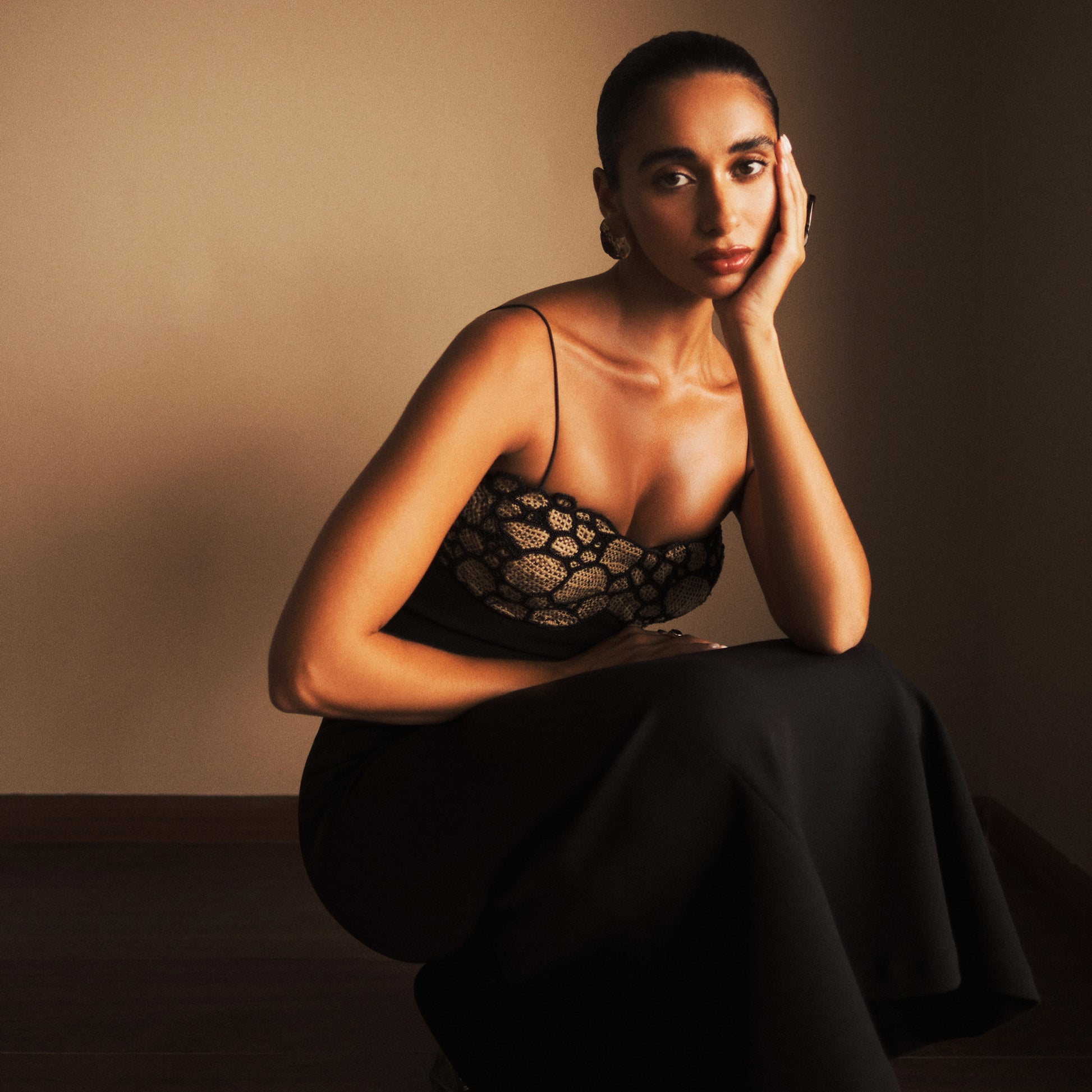 The Paula Dress Combines Elegance With Artistry, Featuring A Sleek Midi Length Skirt And A Striking Bustier Bodice. Crafted From Woven Fabric With Checkered Detailing And Contrasting Colours, This Dress Is Embellished With Seafoam-Inspired Embroidery In Bold Black, That Adds To Its Distinctive Nature.