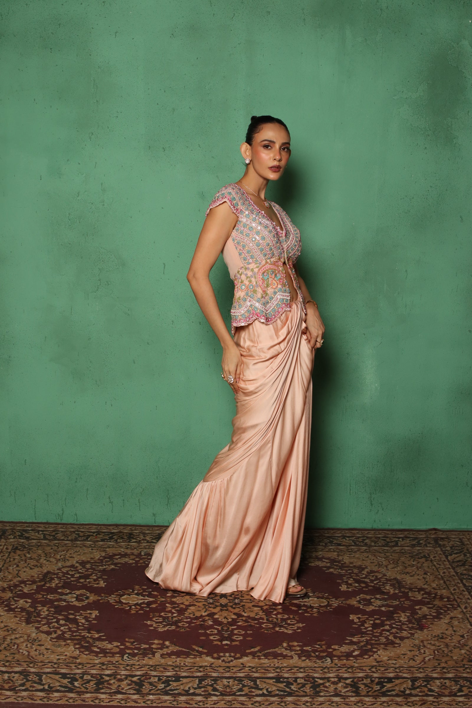 Indo-Western Chic! A Detailed Glimpse At The Elaborate Bead & Thread Work Of This Exquisite Jacket. Paired With A Gracefully Draped Skirt For A Look That's Both Contemporary And Everlasting.