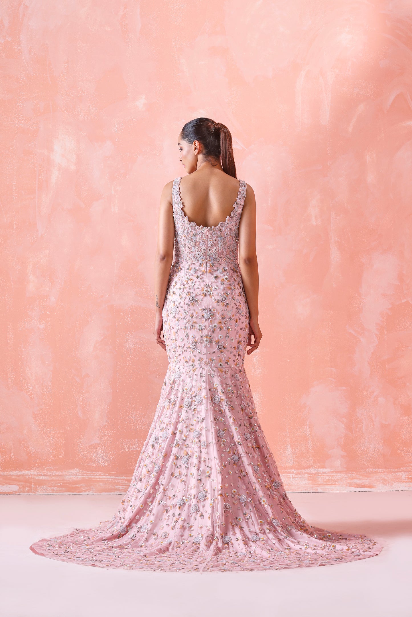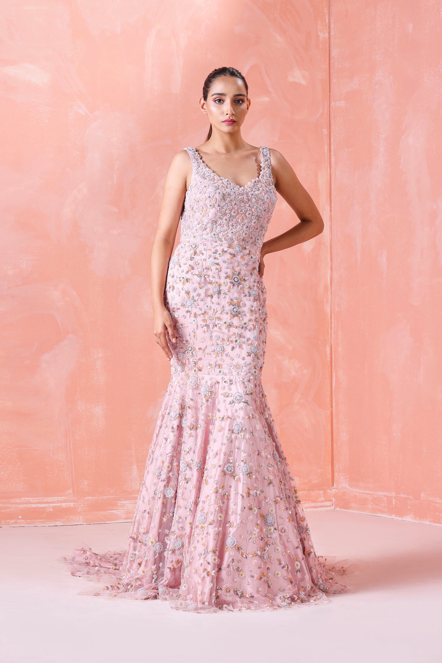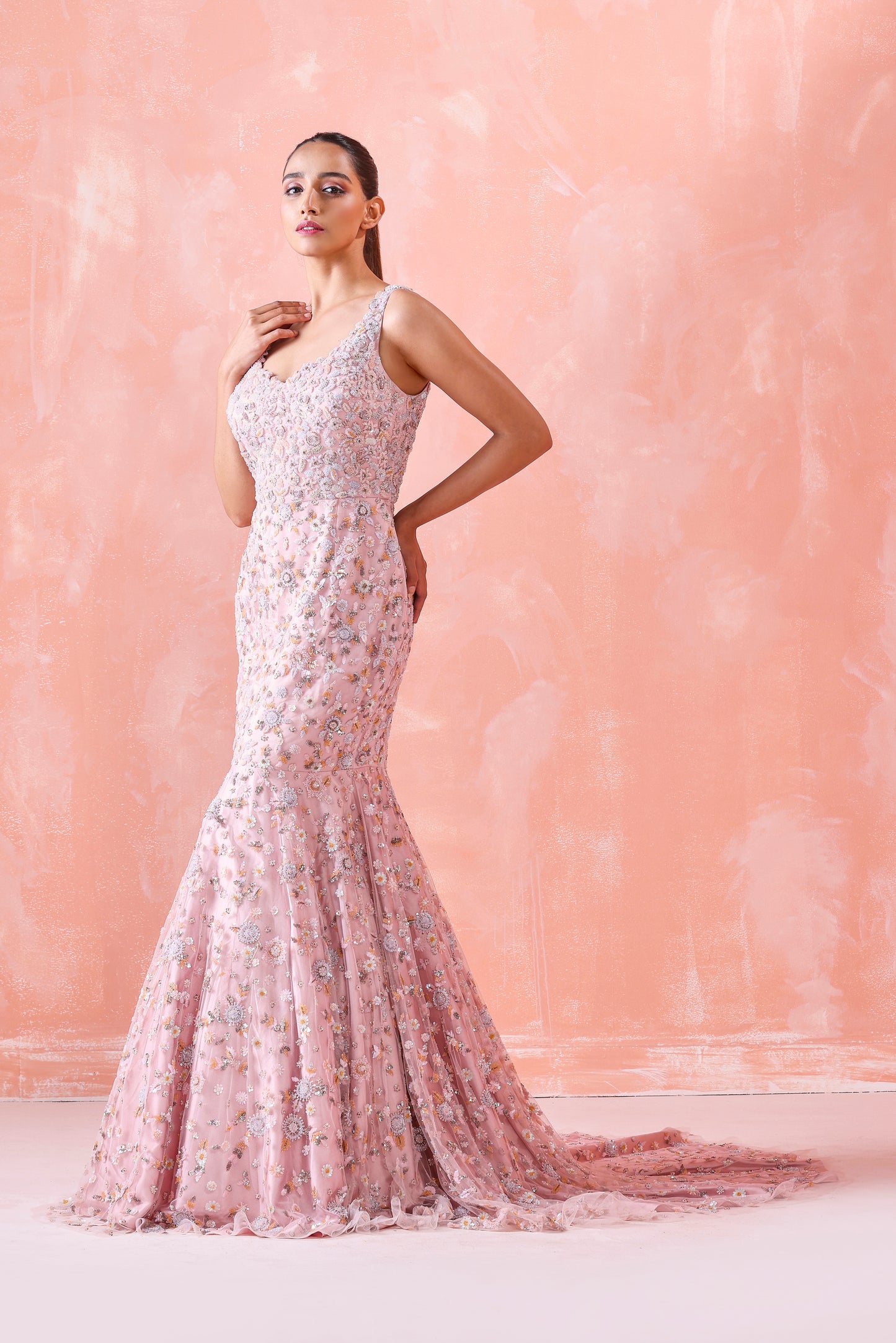 Peach Mermaid Gown Exquisitely Woven On Net Adorns Pastel Sequins And Finely Detailed Bead Embroidery.