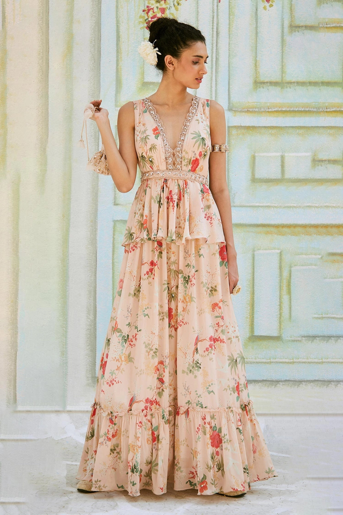 Peach Peplum Gown Featuring Floral Print, Tiered Pattern & Embroidered Neckline With A Finely Embellished Belt.
