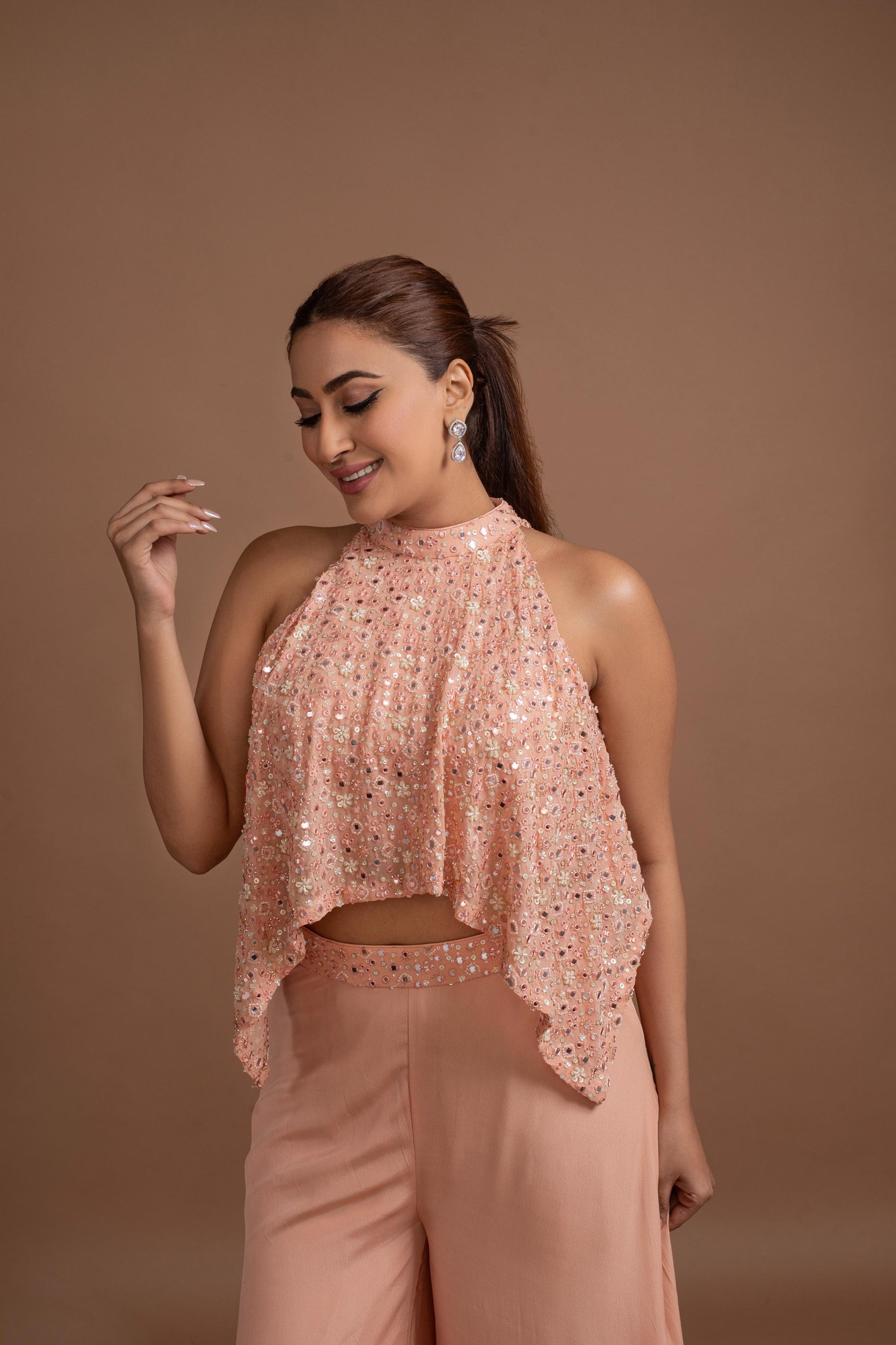 Peach High Neck Collar Blouse With Crepe Flared Drape Pant.