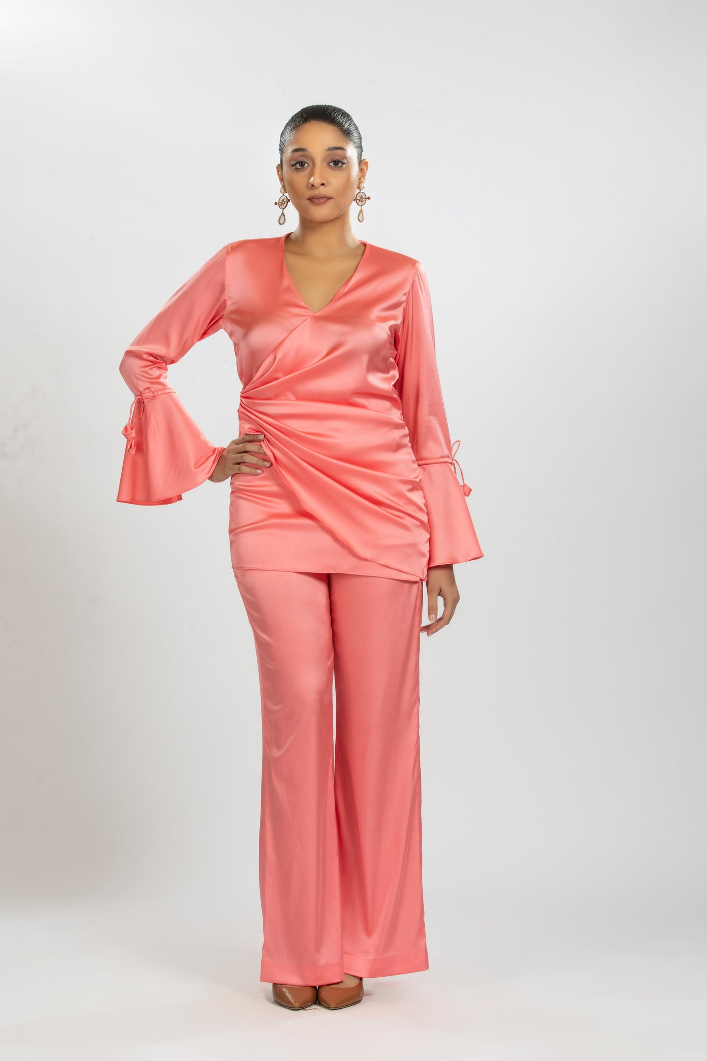 This Peach Satin Cord Set Features A Tunic With Full Sleeves, Flared Cuffs, And A One-Sided Drape, Paired With Matching Trousers. It Combines Classic Sophistication With A Modern Twist, Perfect For Formal And Semi-Formal Occasions.