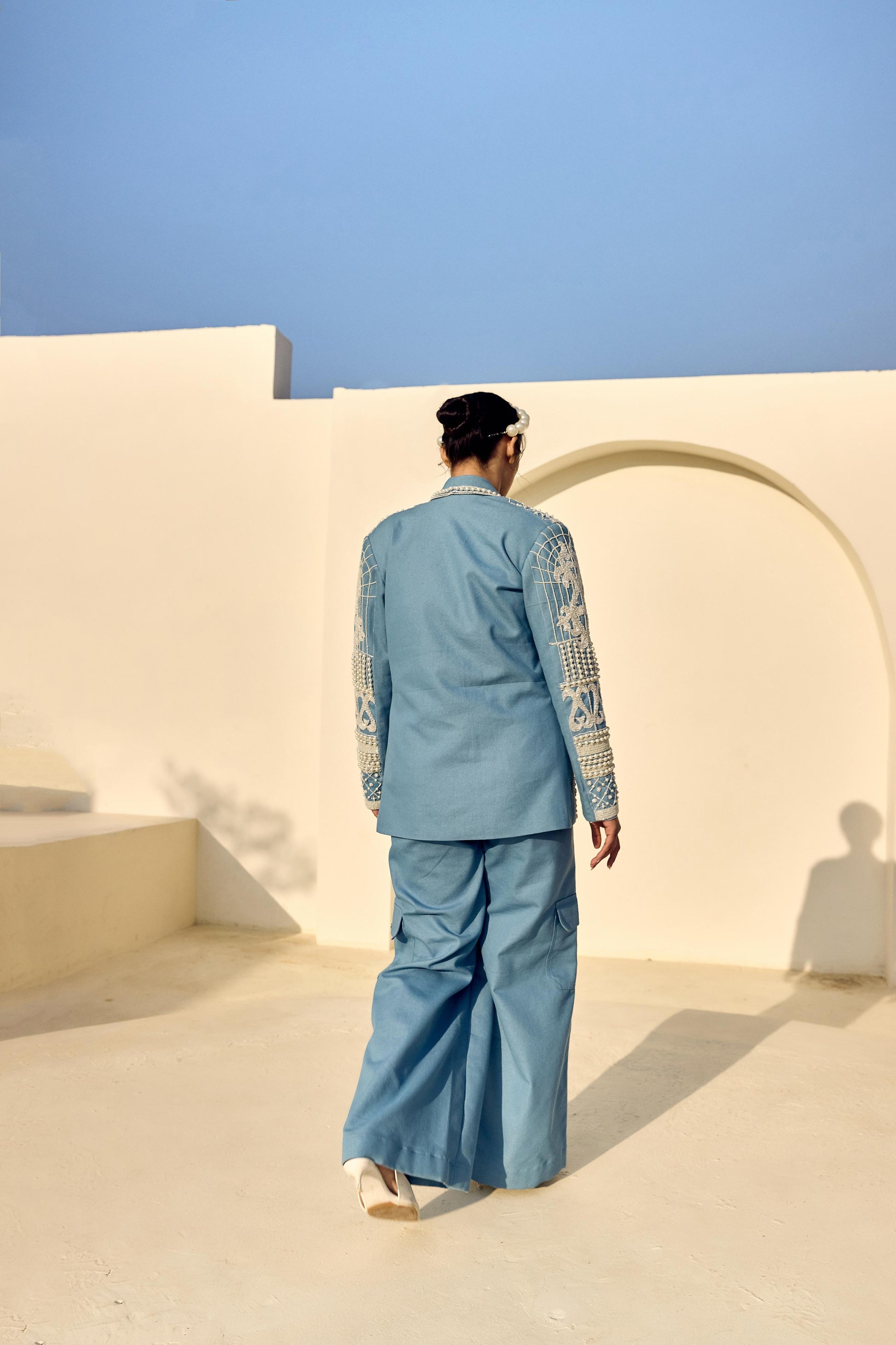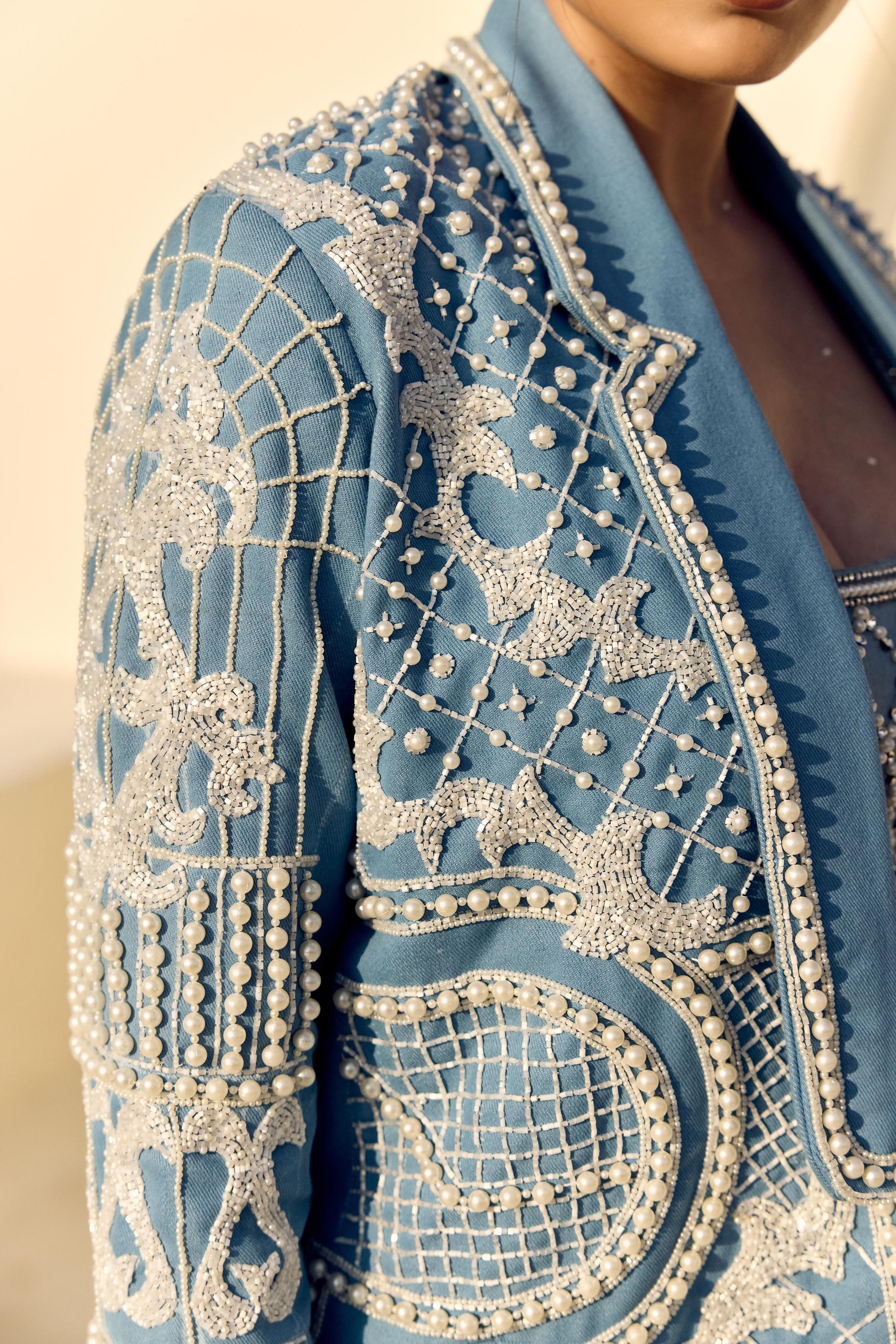 Its Featured Denim Blazer Embellished With Different Size Of Pearls Cutdana With Denim Tube Top Embellished With Swarovski Work Sequence Work And Denim Cargo Pants.