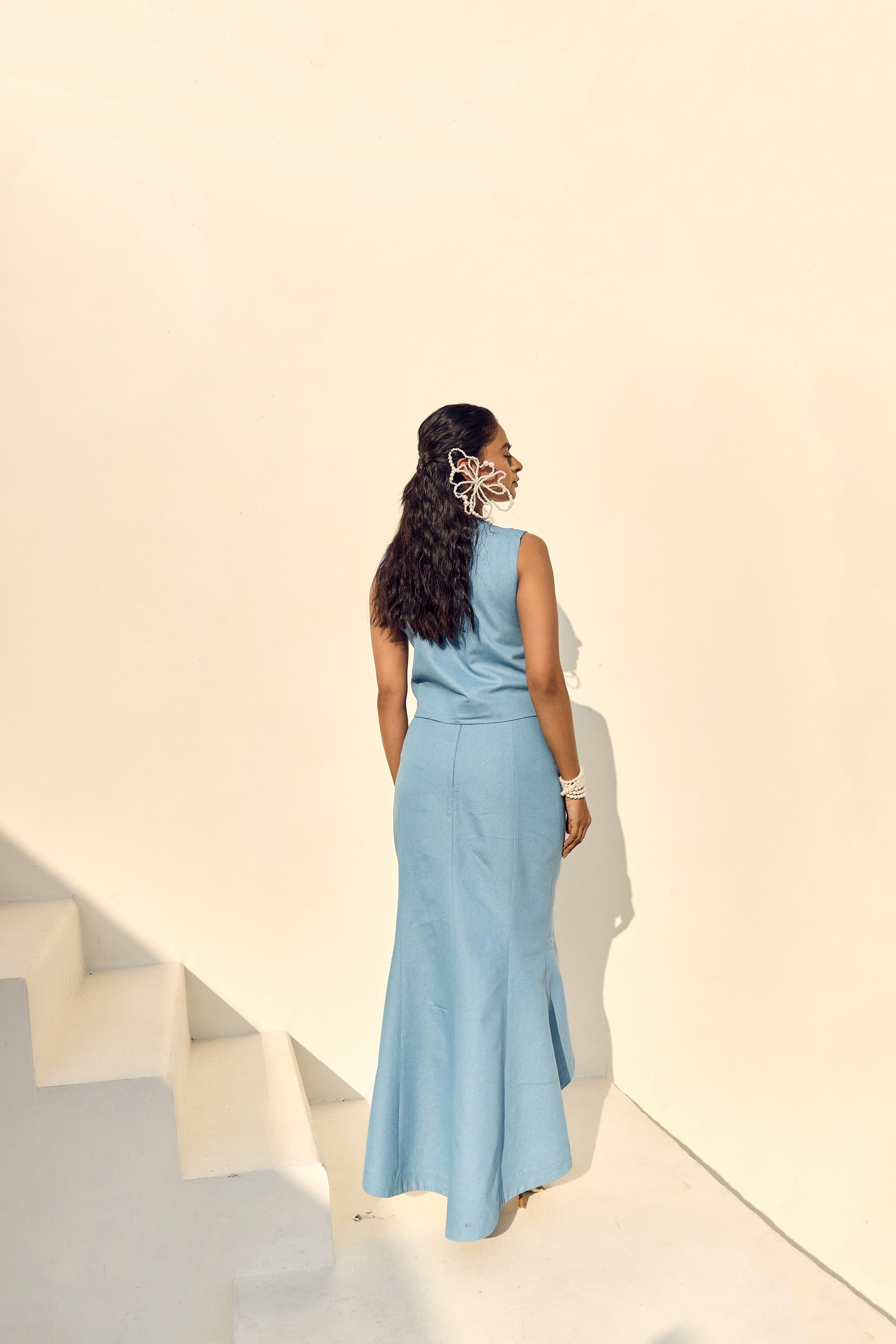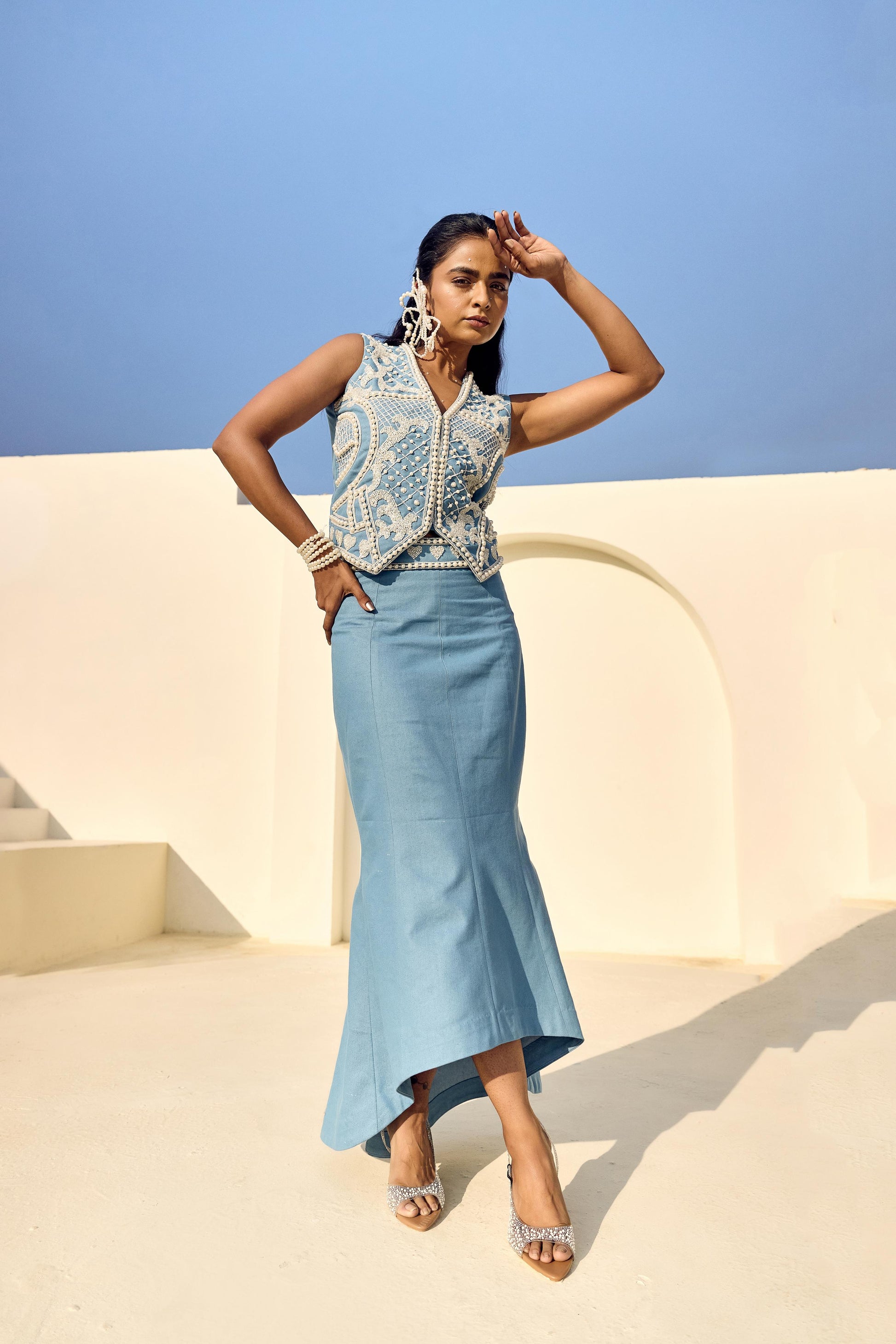 PEARL DENIM WAIST COAT WITH DENIM HIGH LOW SKIRT
