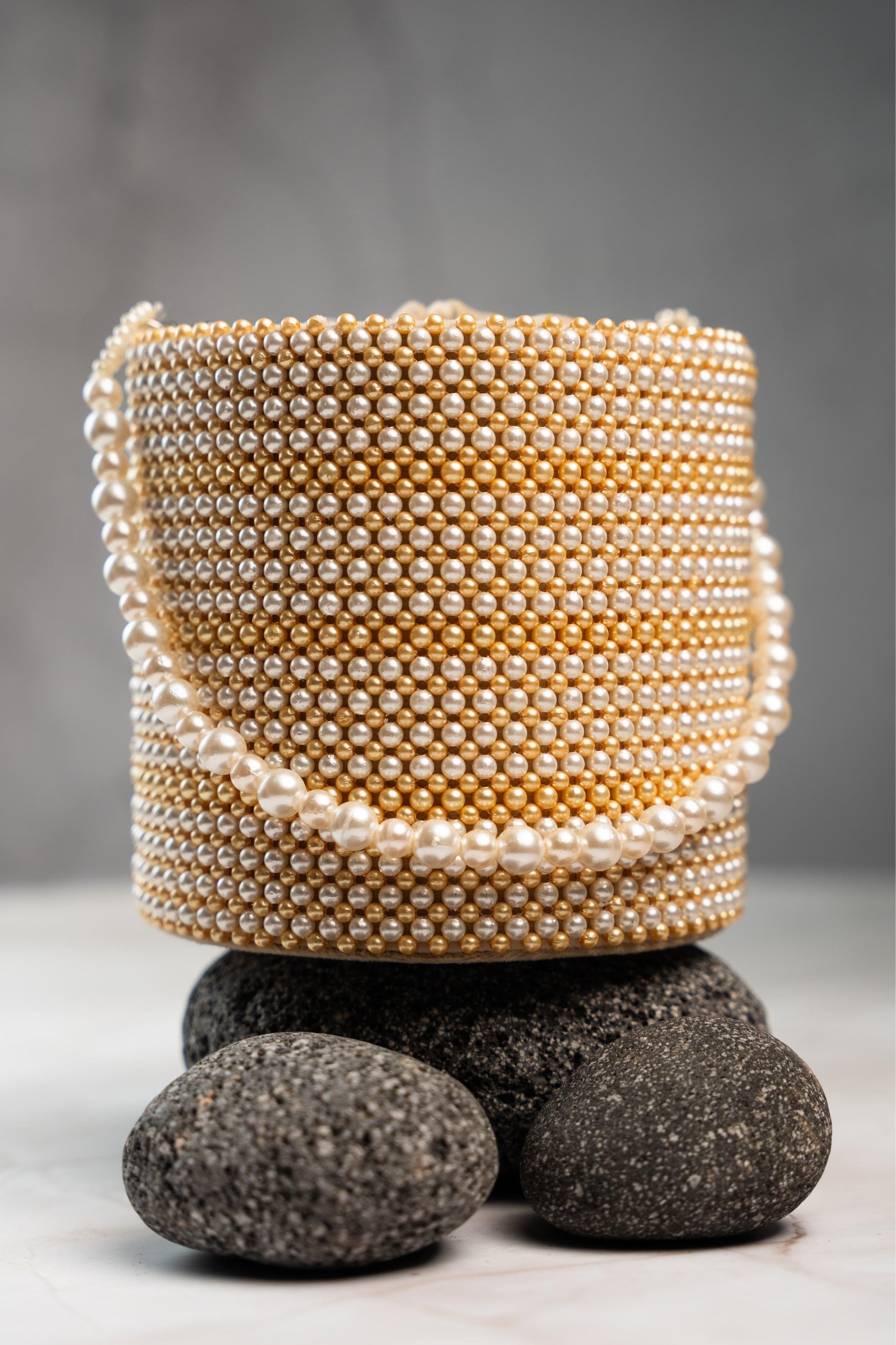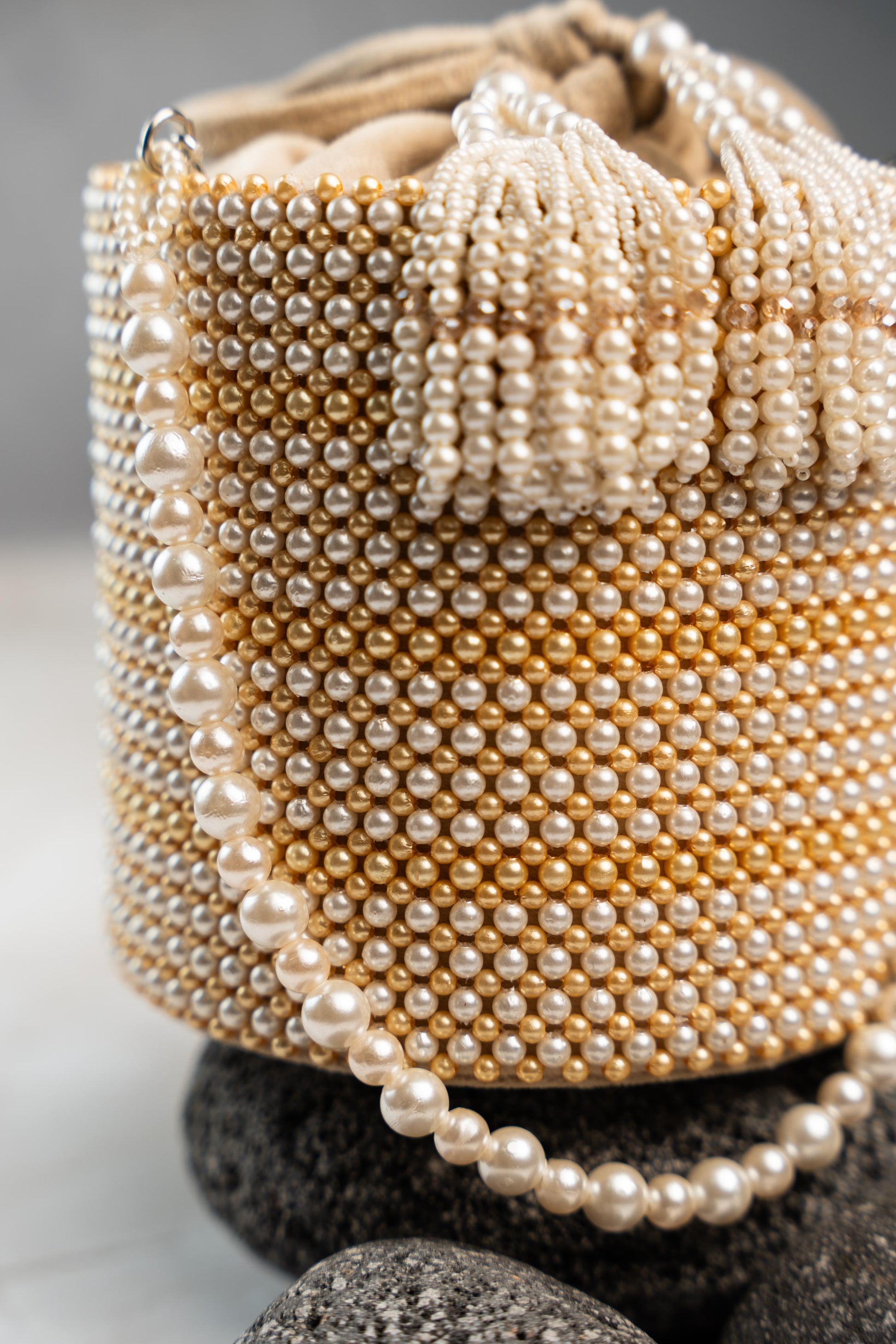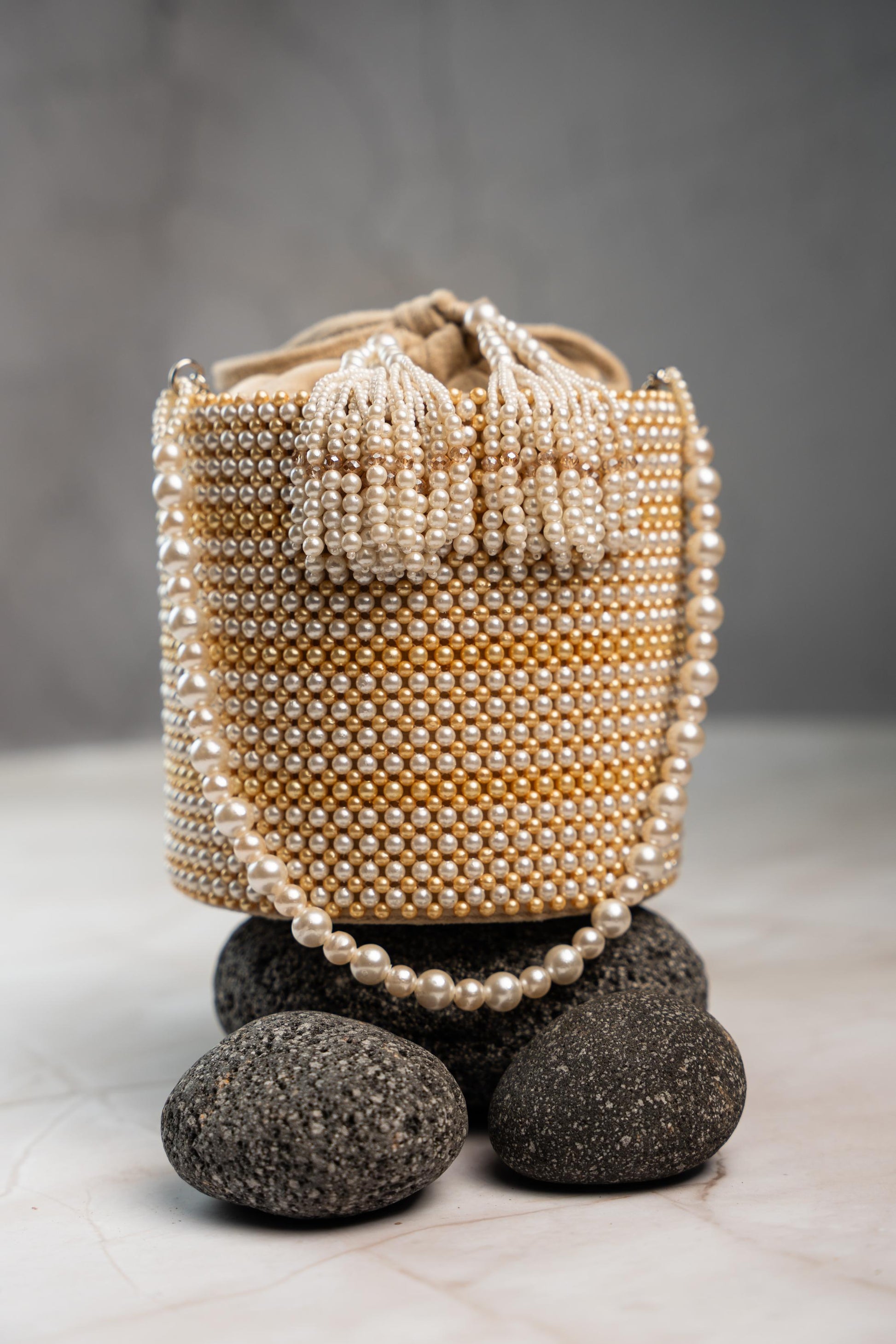 A Sleek Cylindrical Accessory Featuring A Stunning Mix Of Shimmering Gold Beads And Intricate Pearl Work In A Lustrous Off White Hue. Perfect For Adding A Touch Of Glamour To Any Special Occasion, This Potli Blends Traditional Craftsmanship With A Modern, Eye-Catching Design.