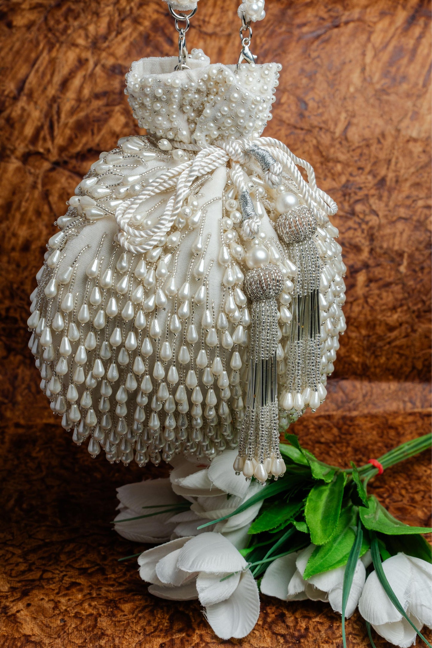 An Exquisite Fusion Of Tradition And Elegance. This Potli Features A Captivating Mix Of Pearl Tassels, Delicate Beads, And Detailed Pearl Work In A White Palette. Accented With Luxurious Pearl Finishing , This Potli Is Designed To Add A Touch Of Sparkle And Sophistication To Any Special Occasion.