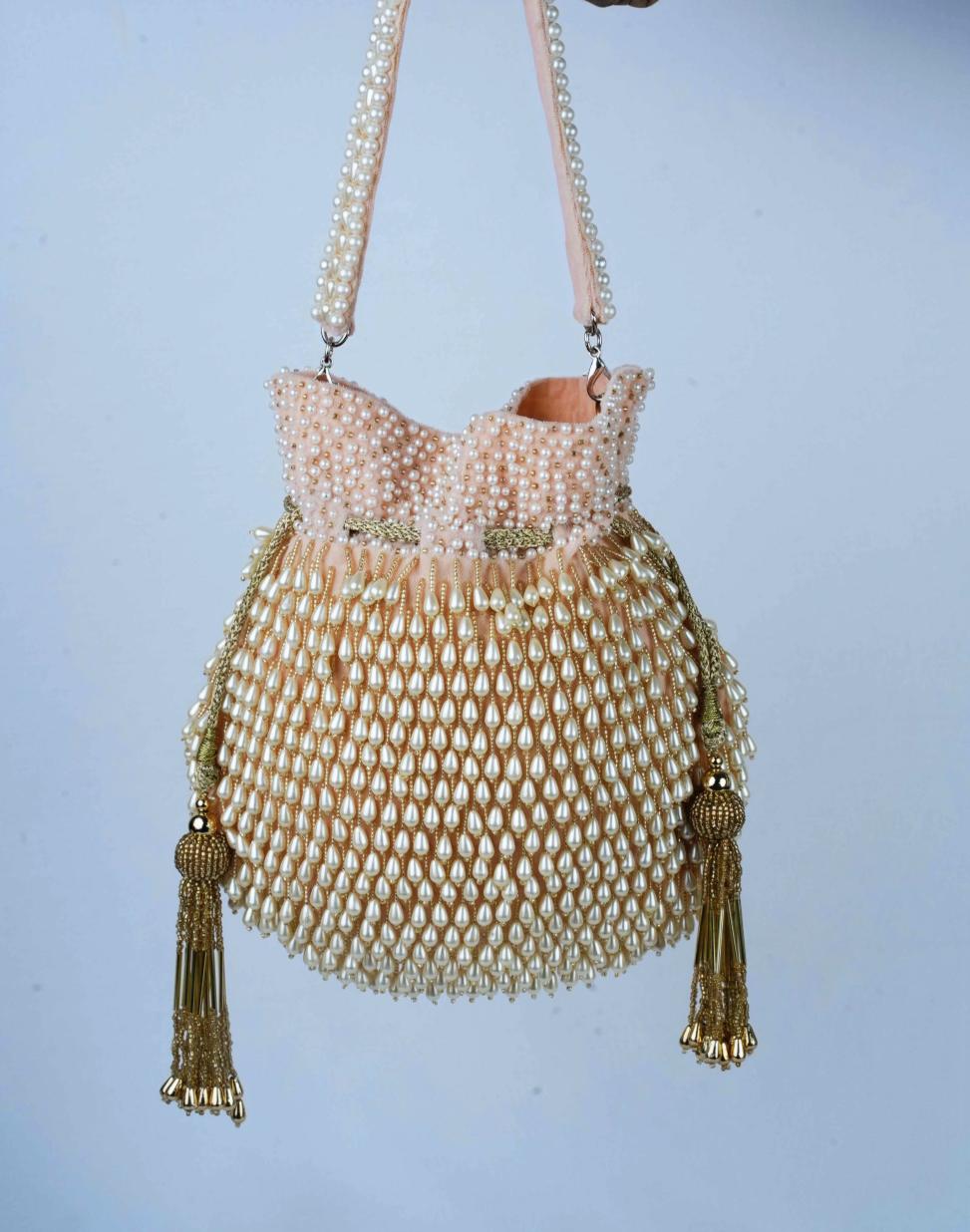 An Exquisite Fusion Of Tradition And Elegance. This Potli Features A Captivating Mix Of Pearl Tassels, Delicate Beads, And Detailed Pearl Work In A Blush Pink Palette. Accented With Luxurious Pearl Finishing , This Potli Is Designed To Add A Touch Of Sparkle And Sophistication To Any Special Occasion.