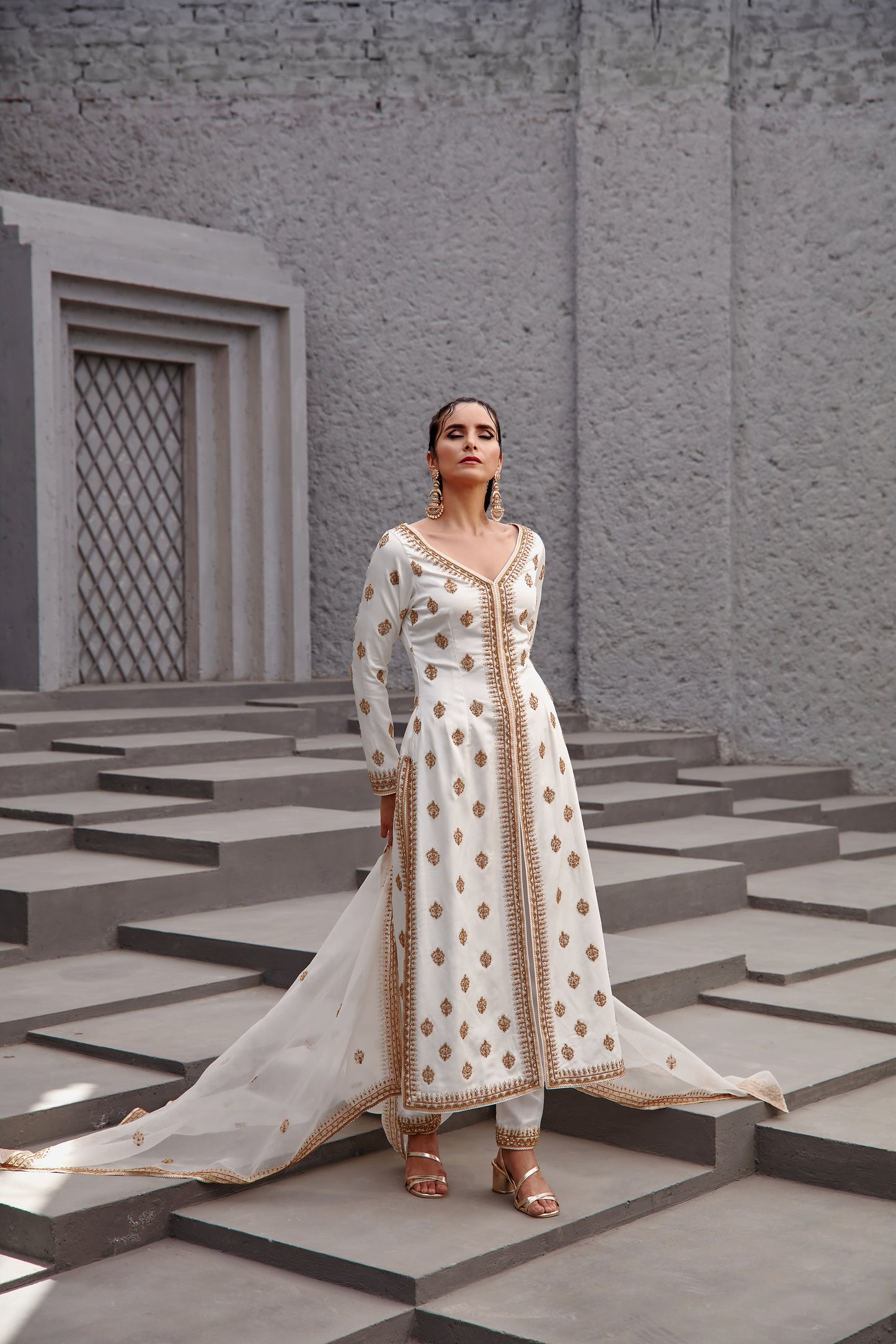 A Pear-White Straight Jacket Based On Dupion Silk Features An Array Of Gold Dori And Aari Embroidery. It Is Paired With Intricately Embroidered Pants And Organza Based Dupatta. Step Into The Spotlight And Make A Statement With This Straight Jacket Set.