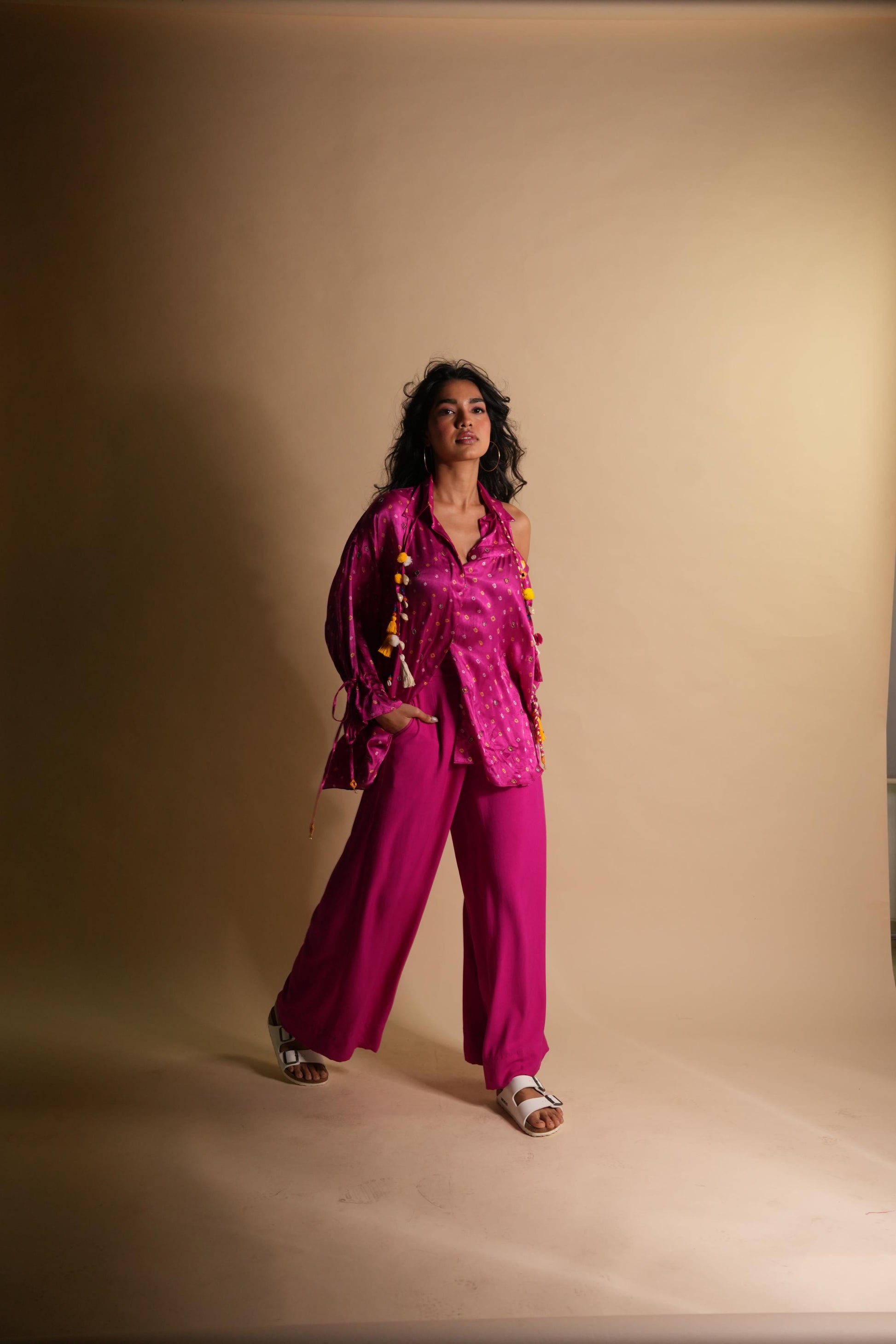Traditional Craft Meets Playful Chaos. This Oversized Silk Bandhani Shirt Stuns In A Bold Hot Pink Hue, Featuring A Slouchy Shoulder Detail, Fringe-Loaded Collar, And Tassels With Pom-Poms, Shells, And Just The Right Amount Of Drama. Wear It Loose Or Tucked — Either Way, It’s A Statement.