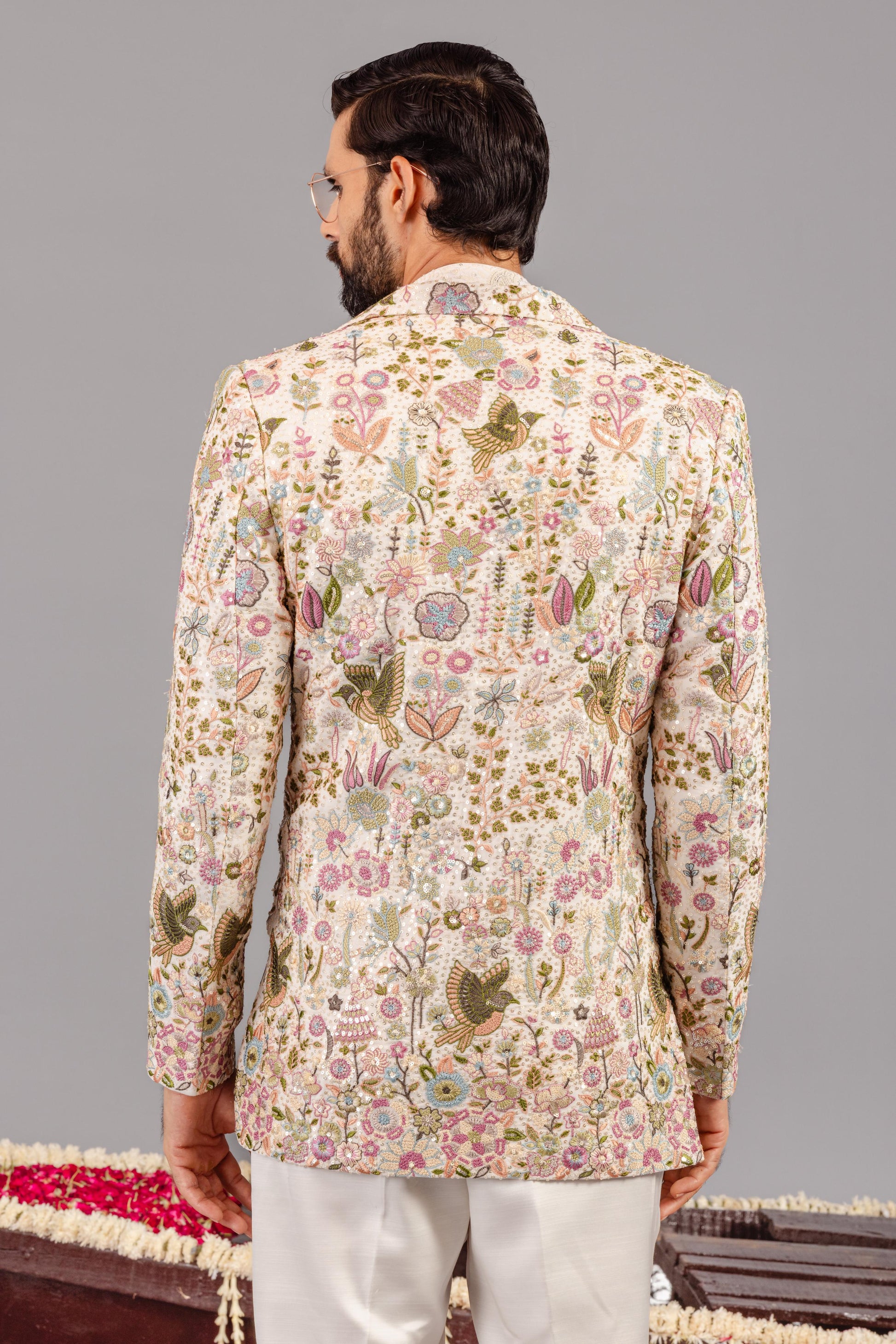 Paired With Ivory Trousers And A Textured Embroidered Shirt, It’s Tailored For Festive Royalty Who Dares To Wear Art.