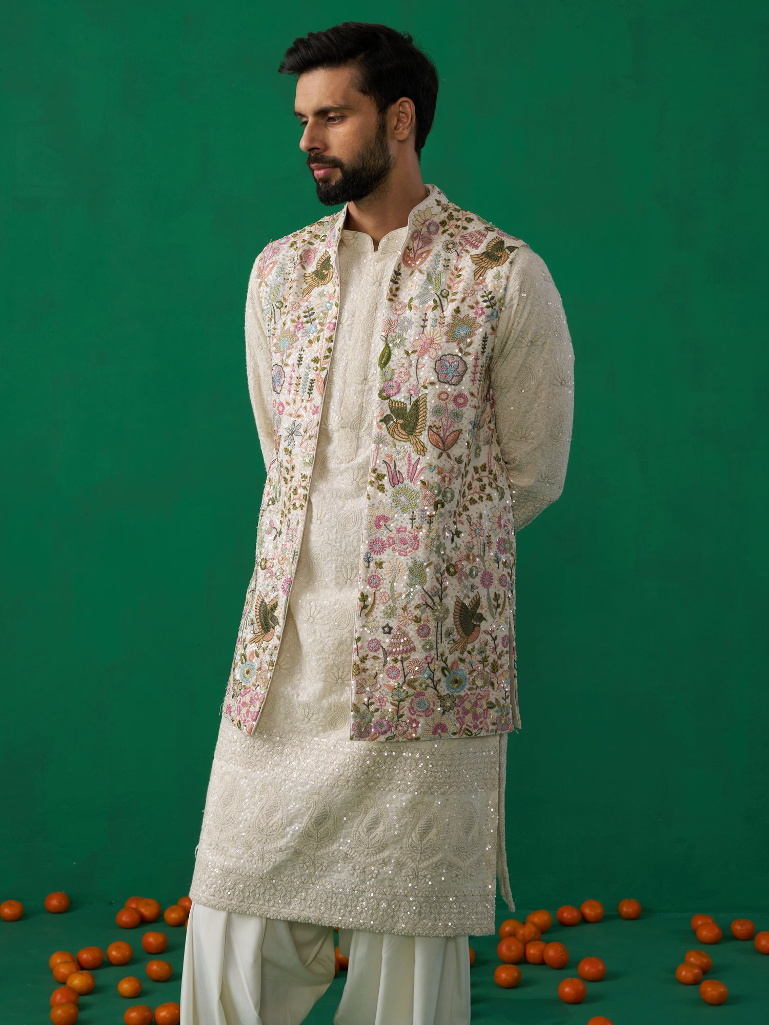The Outfit Consists Of A Long Kurta With An Embroidered Repeating Pattern. The Kurta Is Paired With Patiyala Trousers, Which Are Wide At The Top And Gathered At The Ankles, Creating A Pleated, Draped Effect. Over The Kurta, A Short, Sleeveless Jacket Is Worn, Adorned With Floral Embroidery.