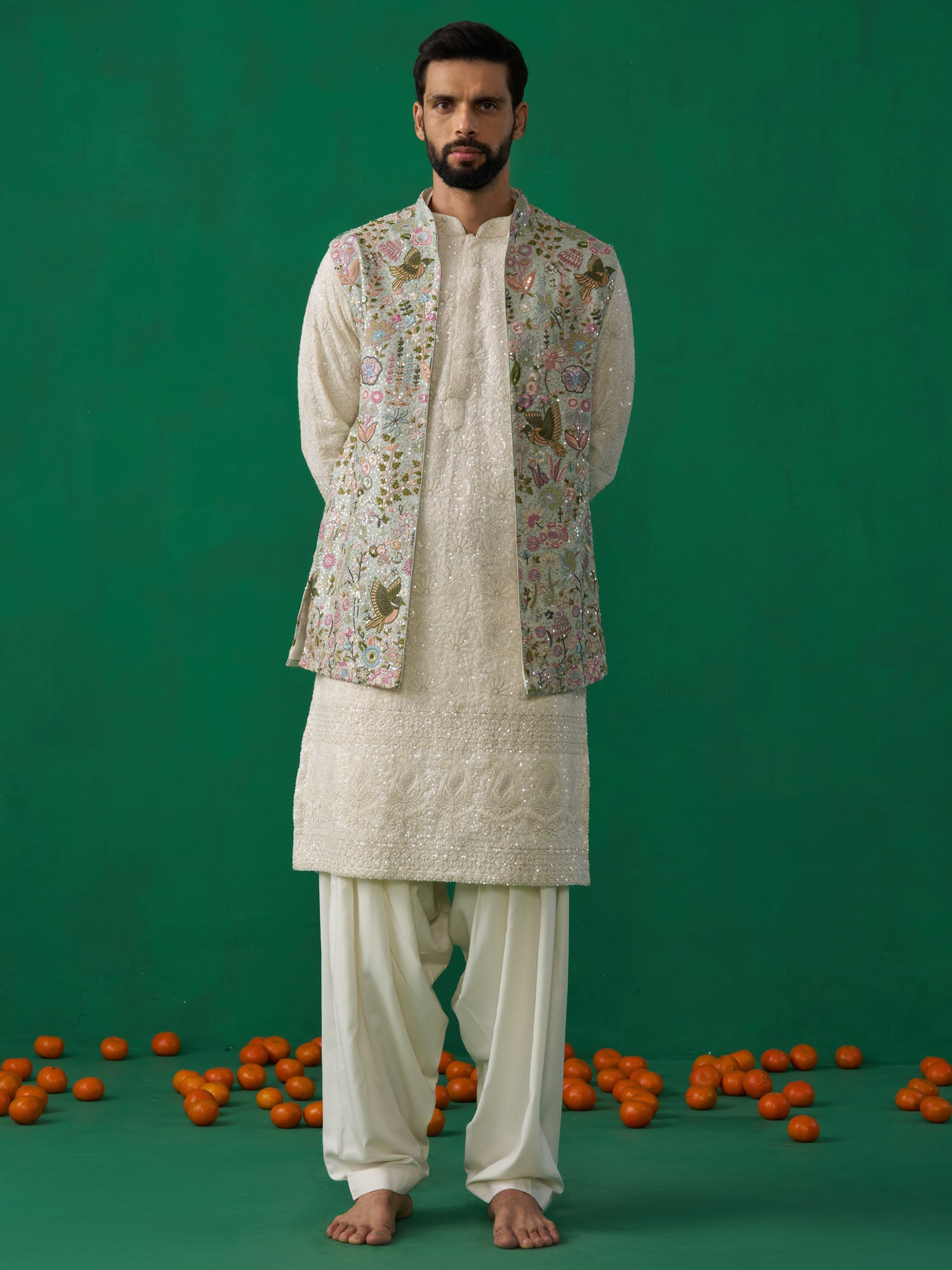 The Outfit Consists Of A Long Kurta With An Embroidered Repeating Pattern. The Kurta Is Paired With Patiyala Trousers, Which Are Wide At The Top And Gathered At The Ankles, Creating A Pleated, Draped Effect. Over The Kurta, A Short, Sleeveless Jacket Is Worn, Adorned With Floral Embroidery.