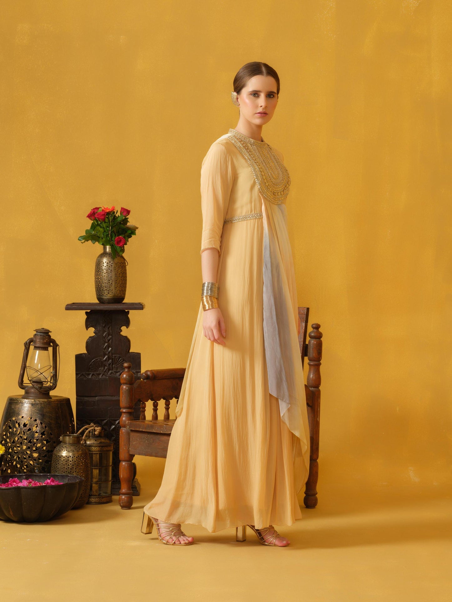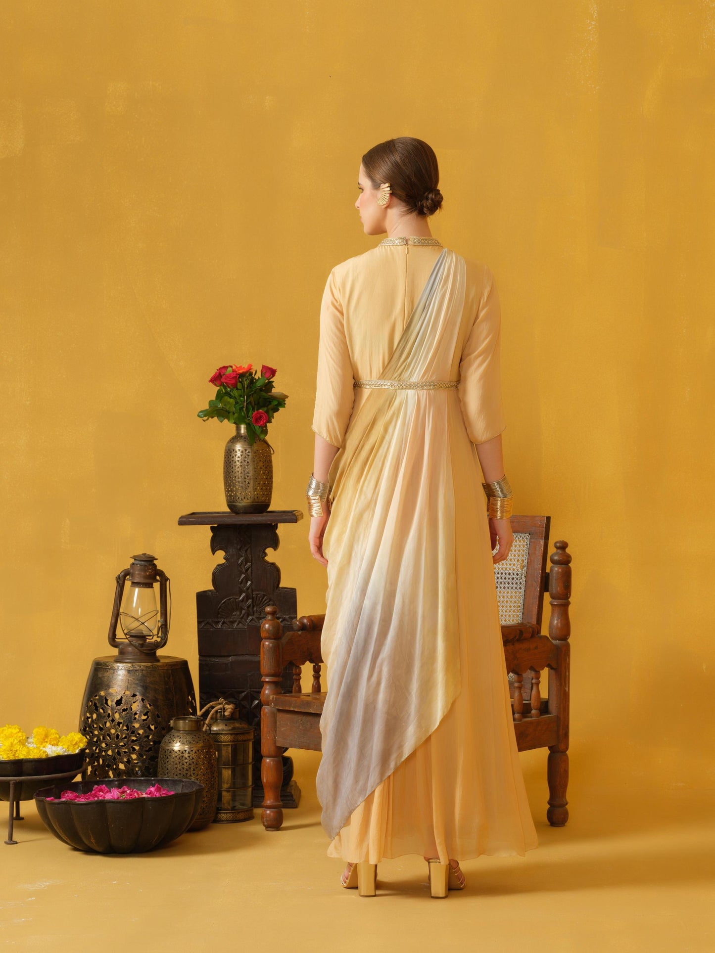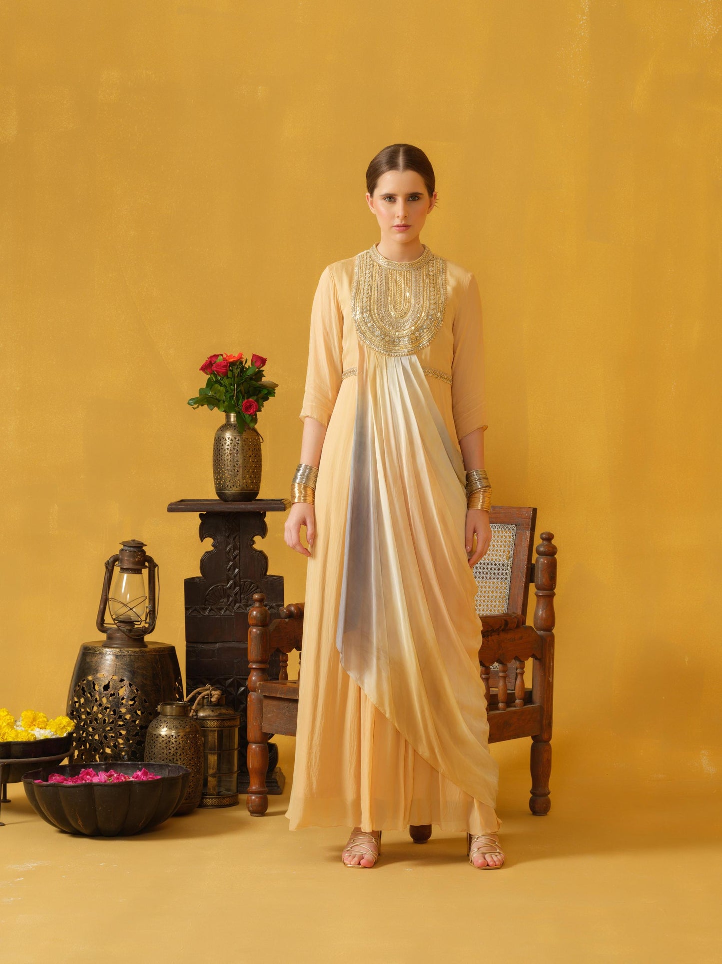 Featuring A Full-Length, Mandarin Collar, 3/4 Sleeve Dress With Embellishment On The Yoke & Waist Having An Ombre Drape.
