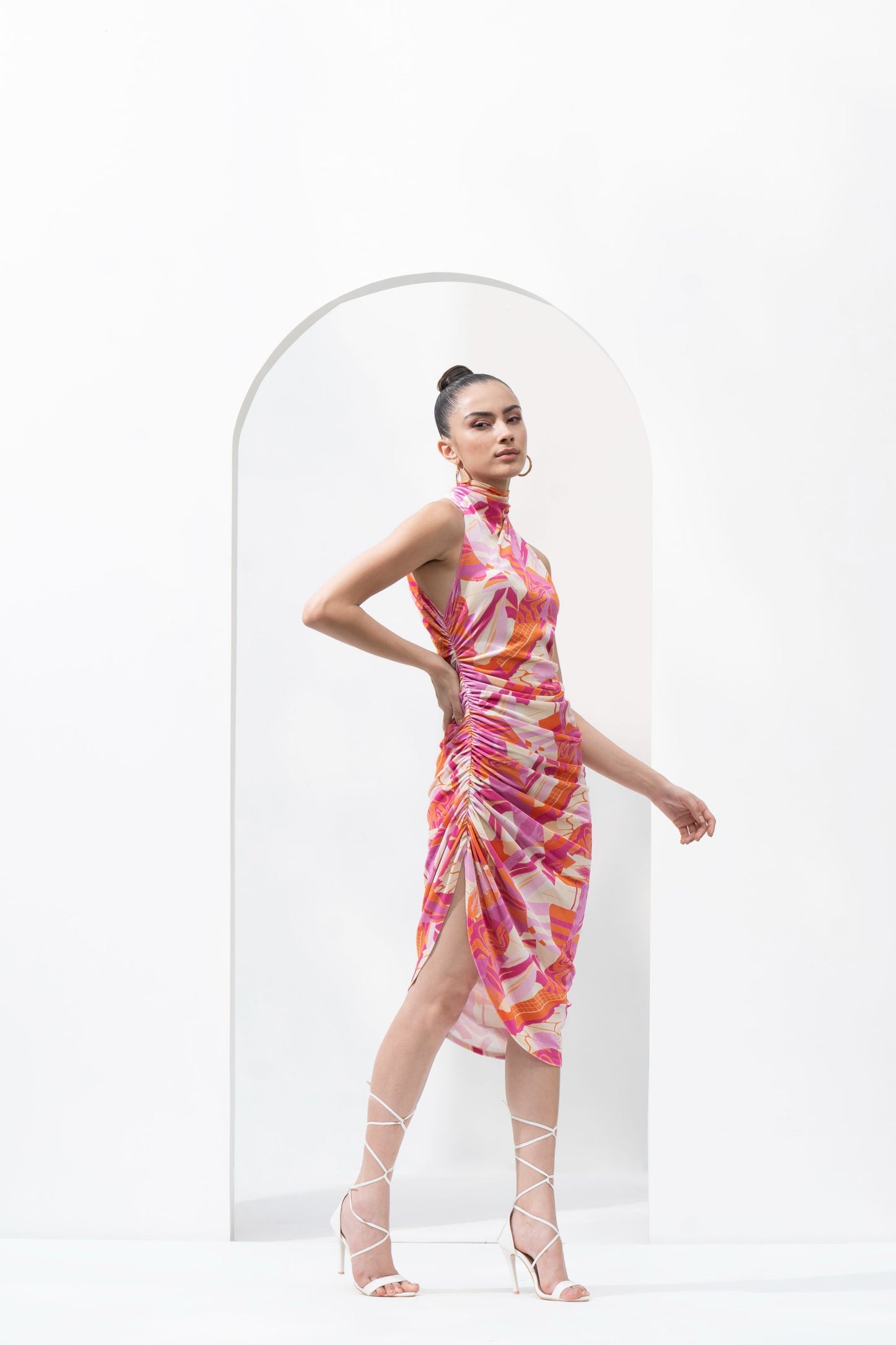 The Pink Abstract Print Adds A Touch Of Artistry And Allure, With Its Vibrant And Captivating Design That Is Sure To Turn Heads And Make A Statement. The Ruched Detailing Further Enhances The Dress'S Elegance, Adding Texture And Dimension To The Overall Look.