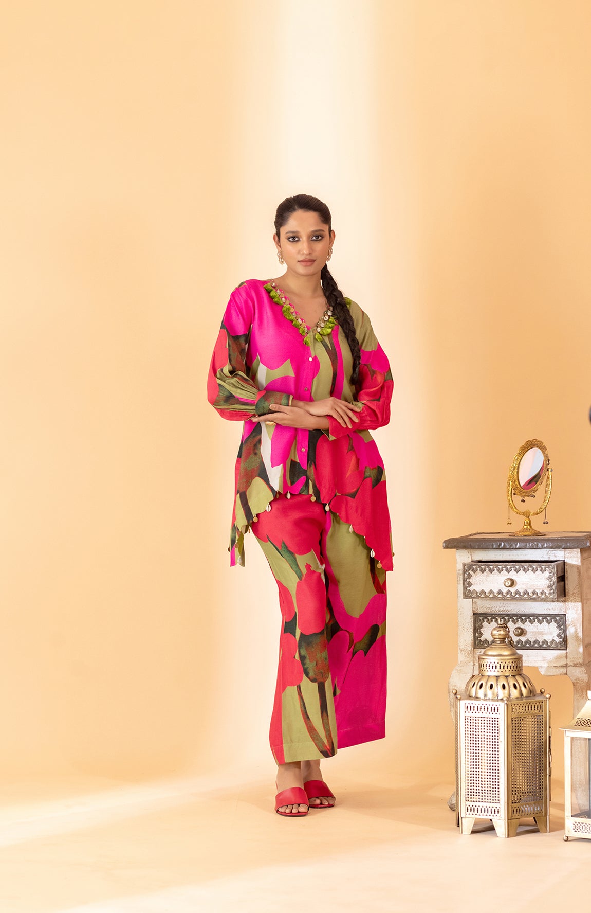 An Outfit Set In Pink With A Colorful Abstract Print And Small Hanging Decorations.