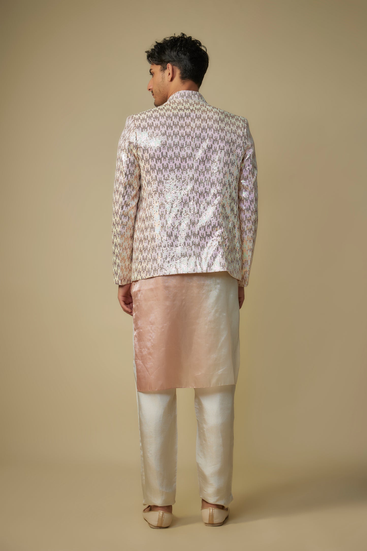 Featuring Pink Rosegold Sequence Jacket With Zimichu Ombre Kurta With Tissue Pant.