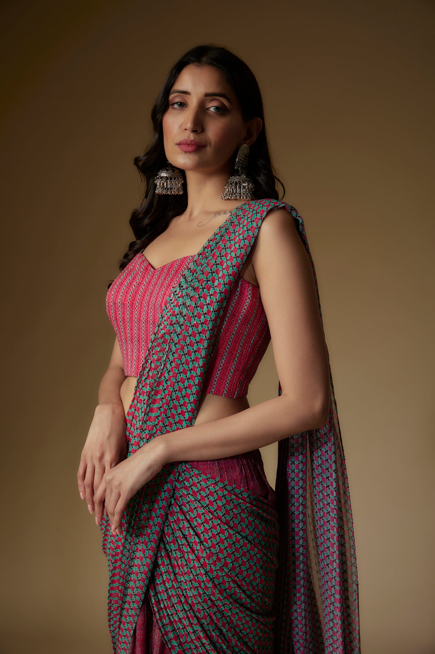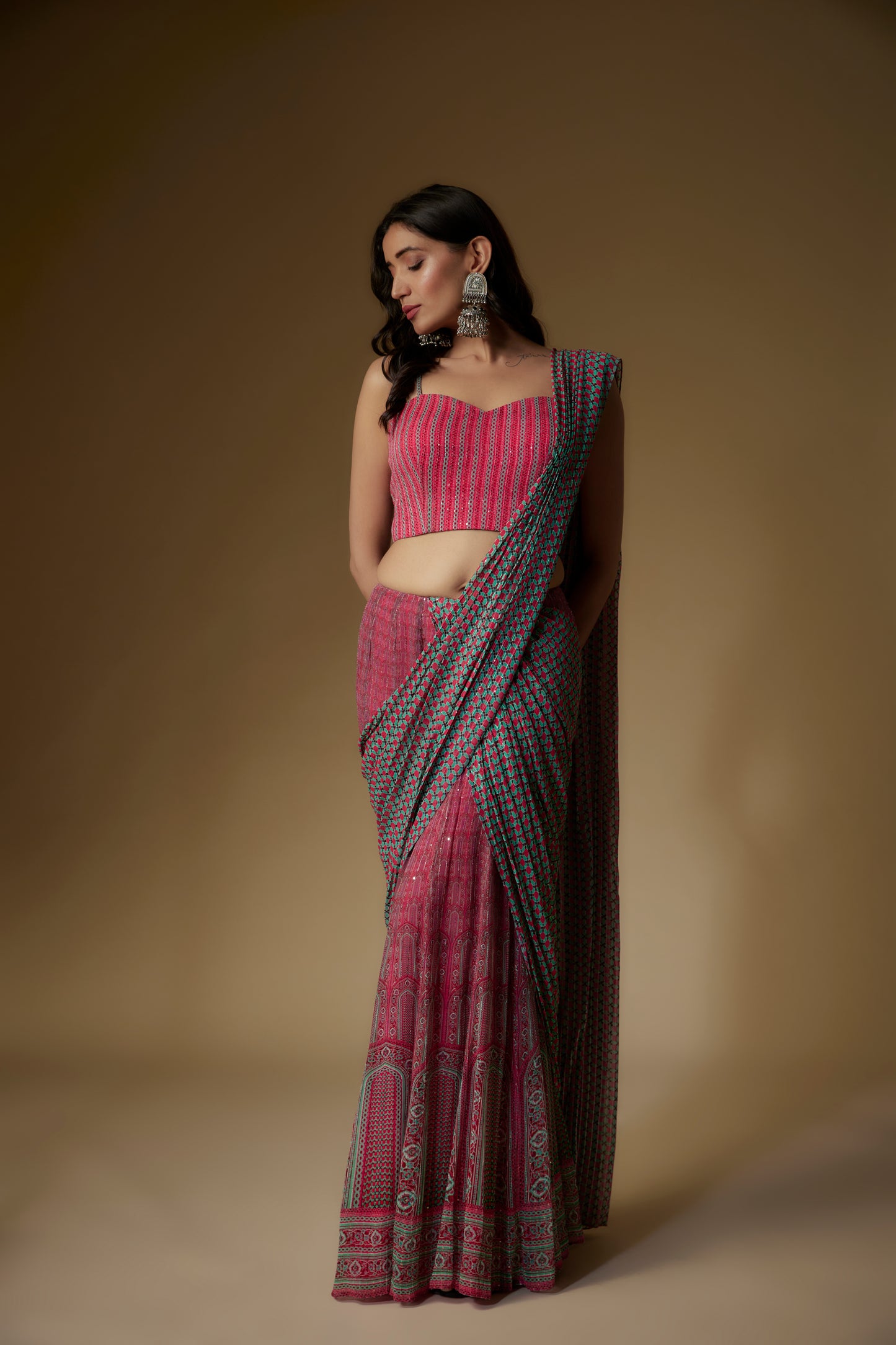 Pink Printed Drape Saree In Georgette Base With Sequins Detail. It Is Paired With Matching Printed Blouse.