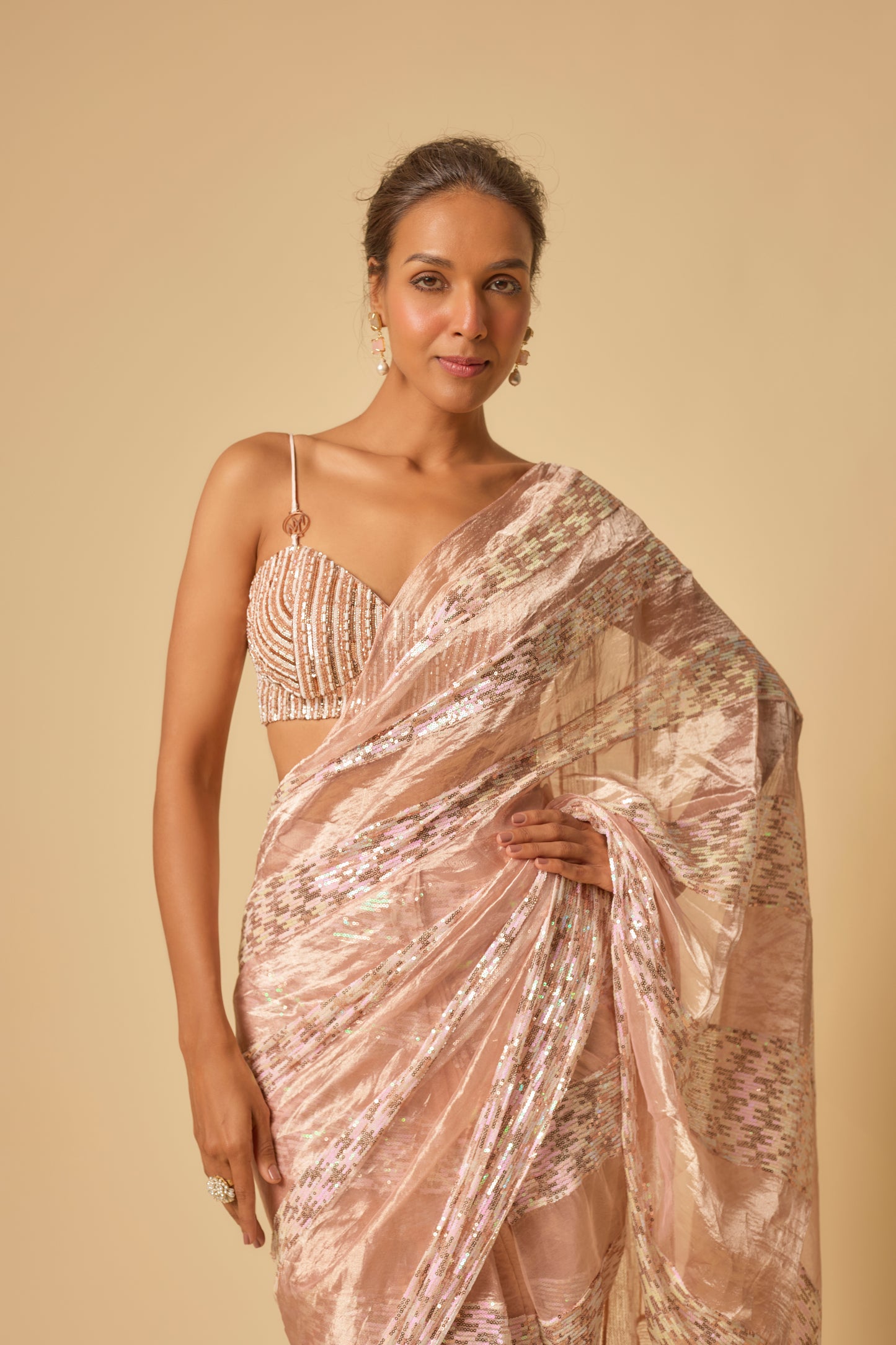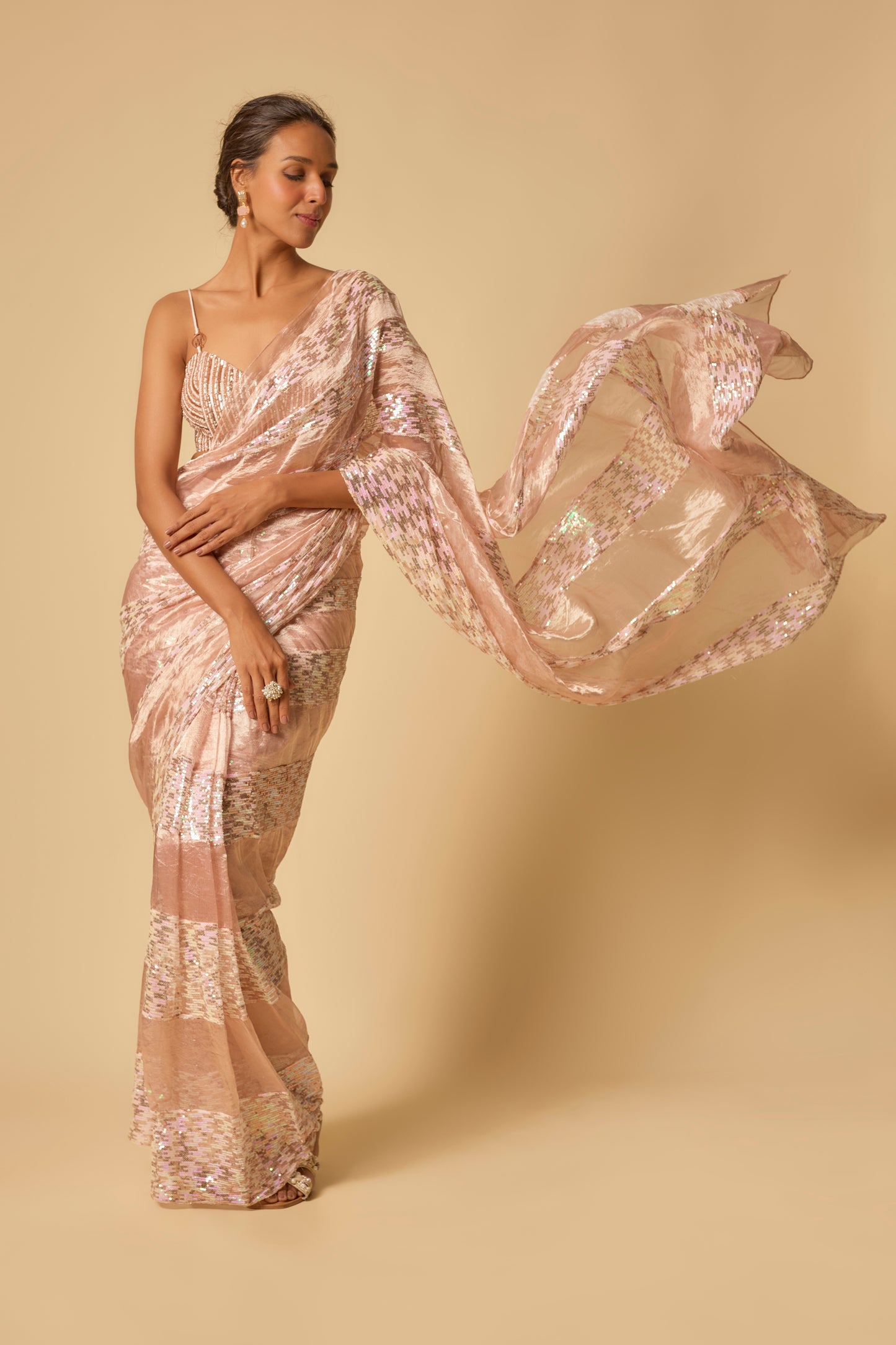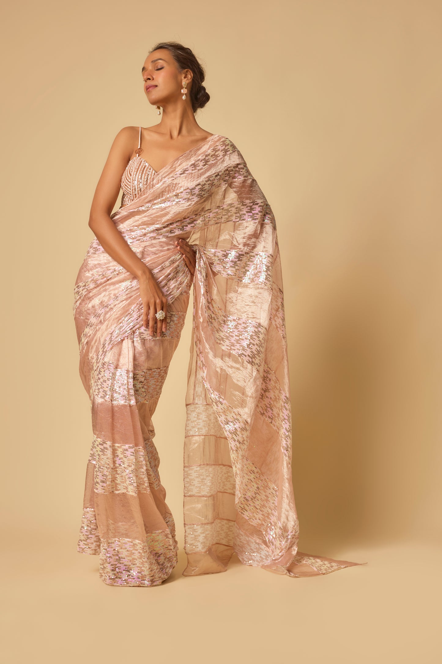 Featuring Tissue And Sequin Block Saree With Embroidered Blouse In Mashroo Silk.