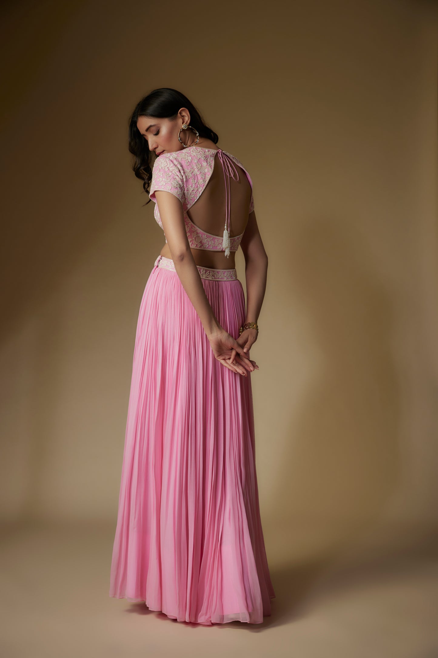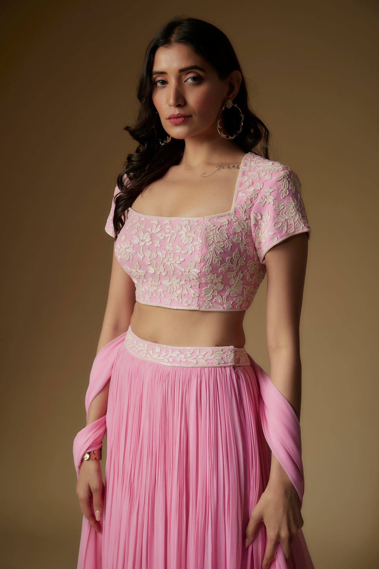 Baby Pink Blouse In Georgette Base With Thread And Bead Work. It Is Paired With Matching Skirt And Embroidered Dupatta.