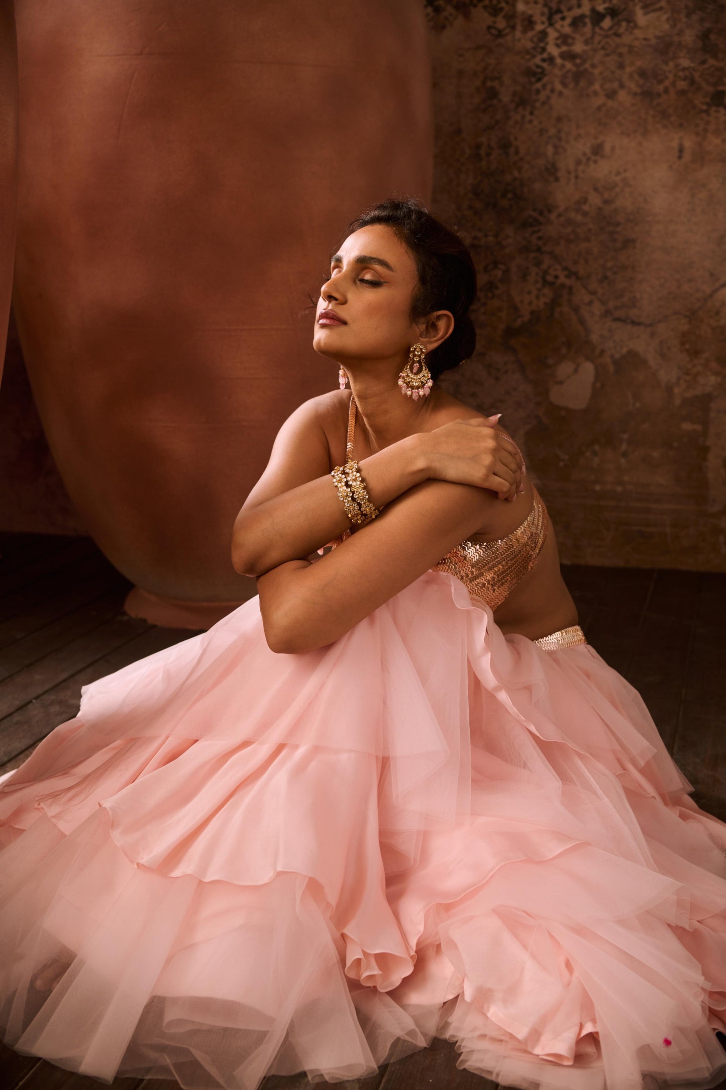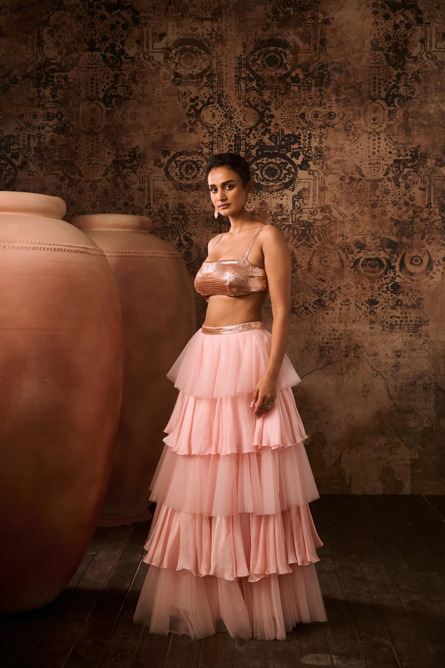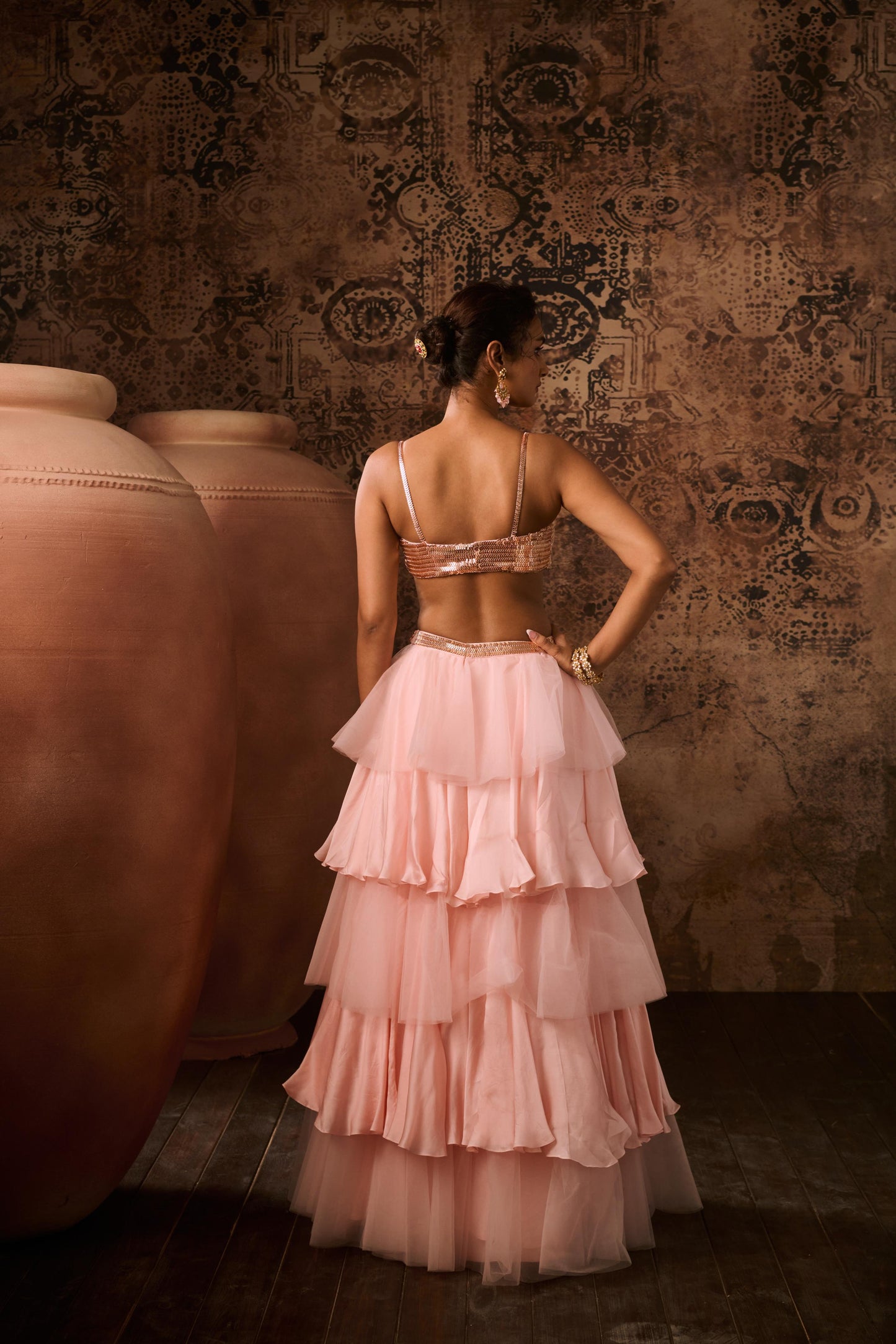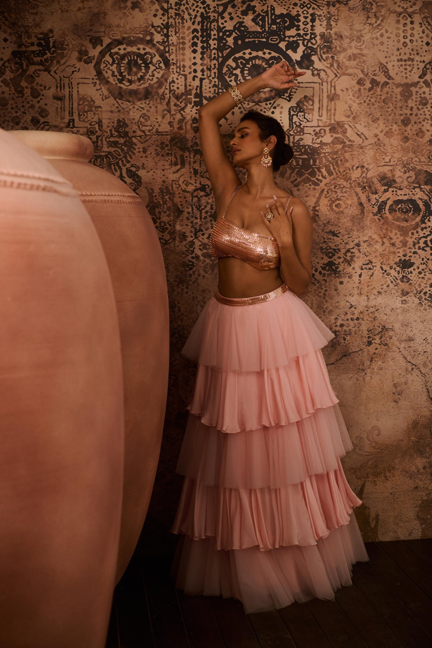 Rose Gold Embroidered Top With Pink Layered Skirt.