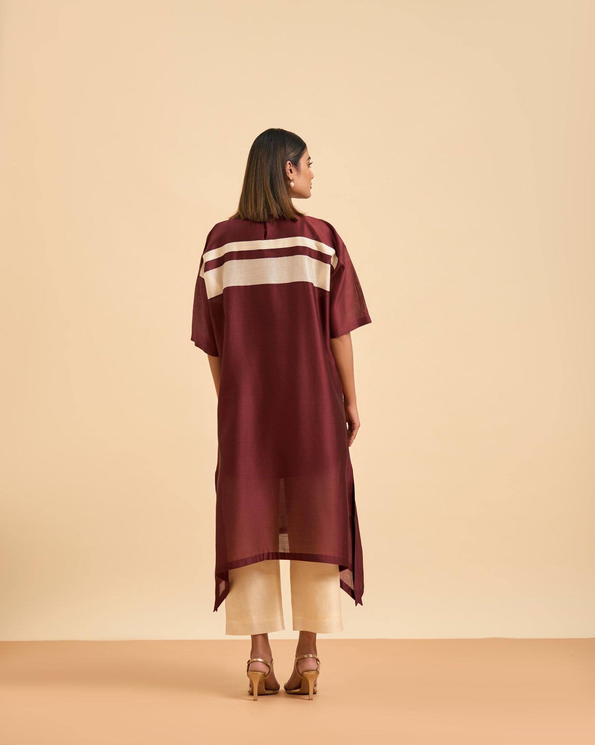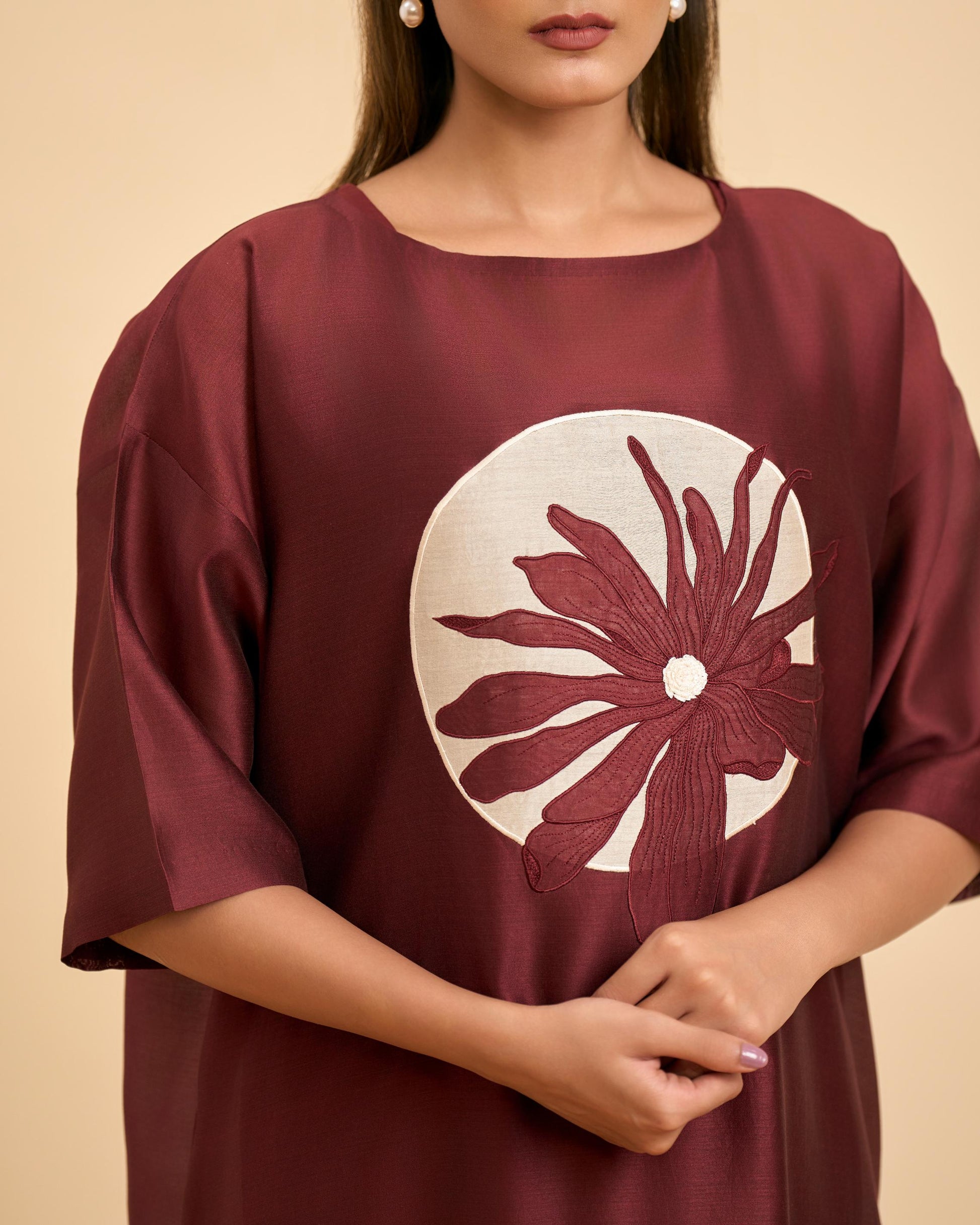 Maroon Coloured Long Kurta With A Dipped Hemline And Elegant Boat Neck Exudes Effortless Style. The Dropped Shoulder Design, 3/4Th Sleeves, And Front Panel Appliqué Add A Modern Touch. Paired With Ankle-Length Straight-Fit Pants, This Ensemble Blends Comfort With Sophistication.