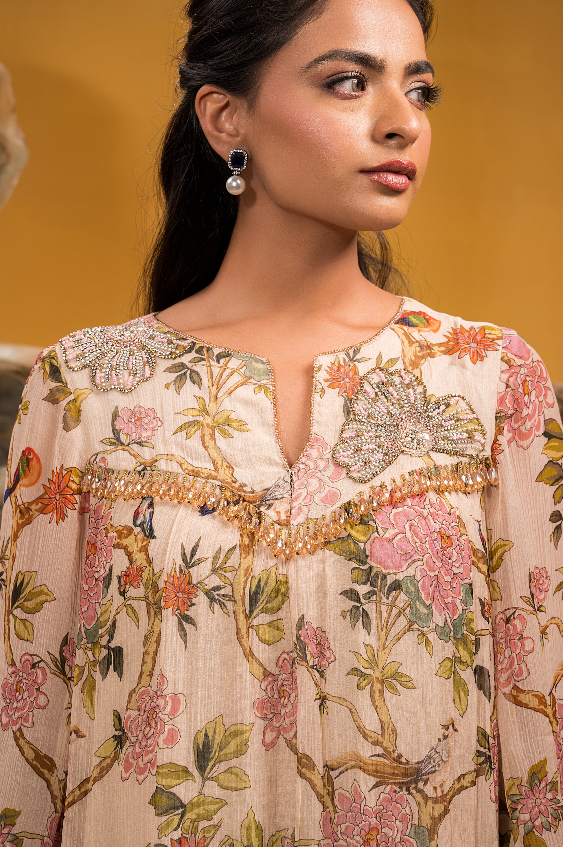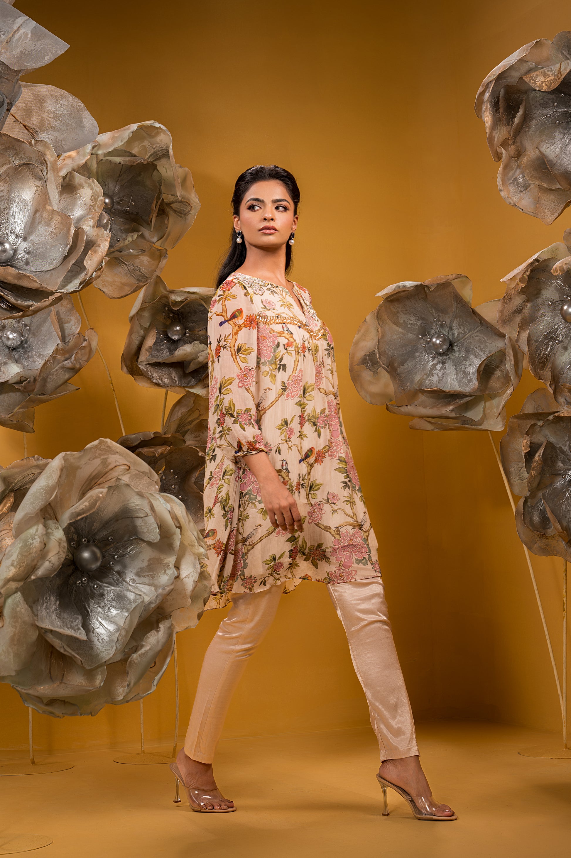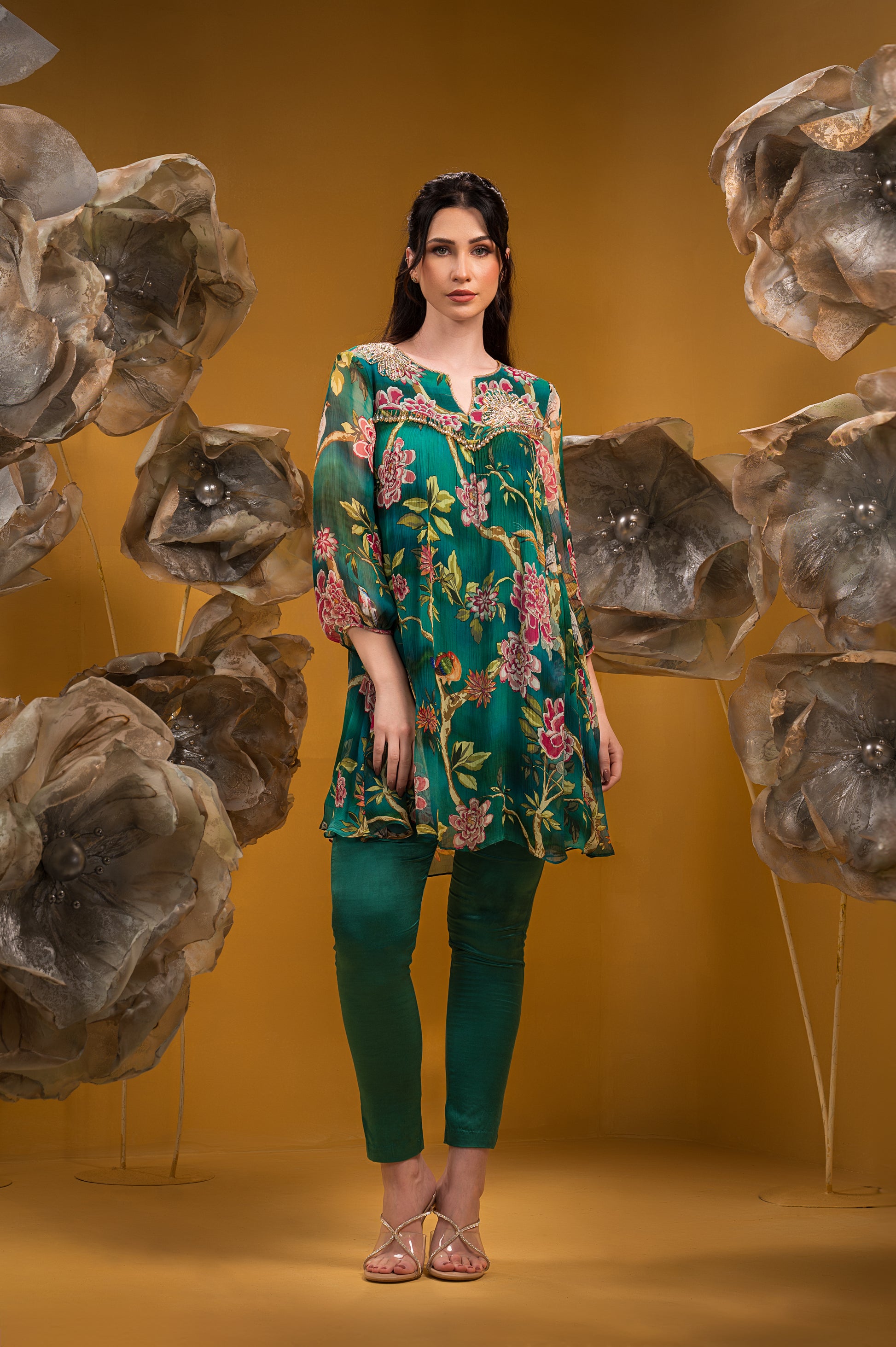 Chiffon Printed A Line Kurta With Embroidery Teamed With Satin Lycra Pant.