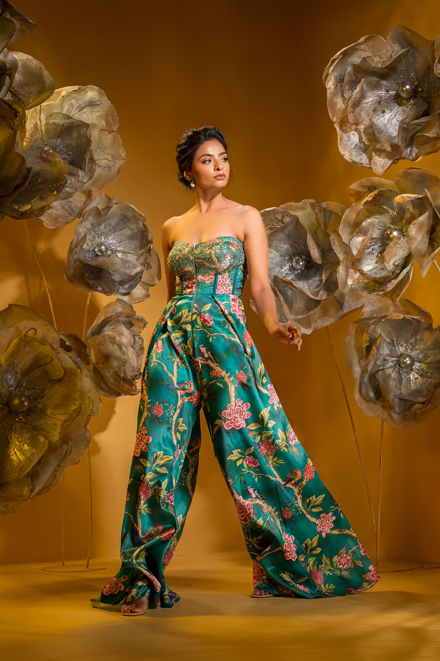 Printed Taffeta Corset Jumpsuit Yoke Full Swarovski.