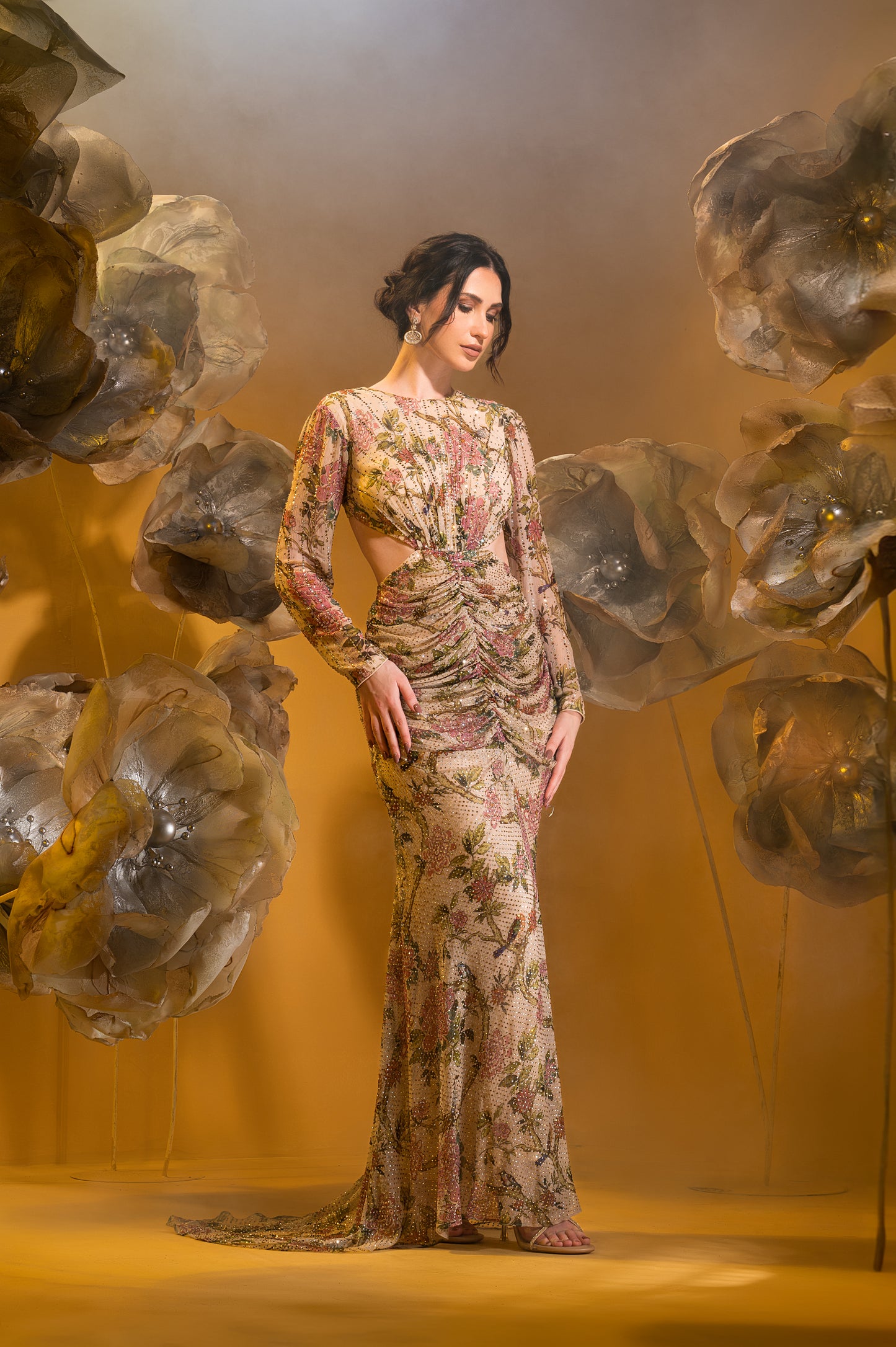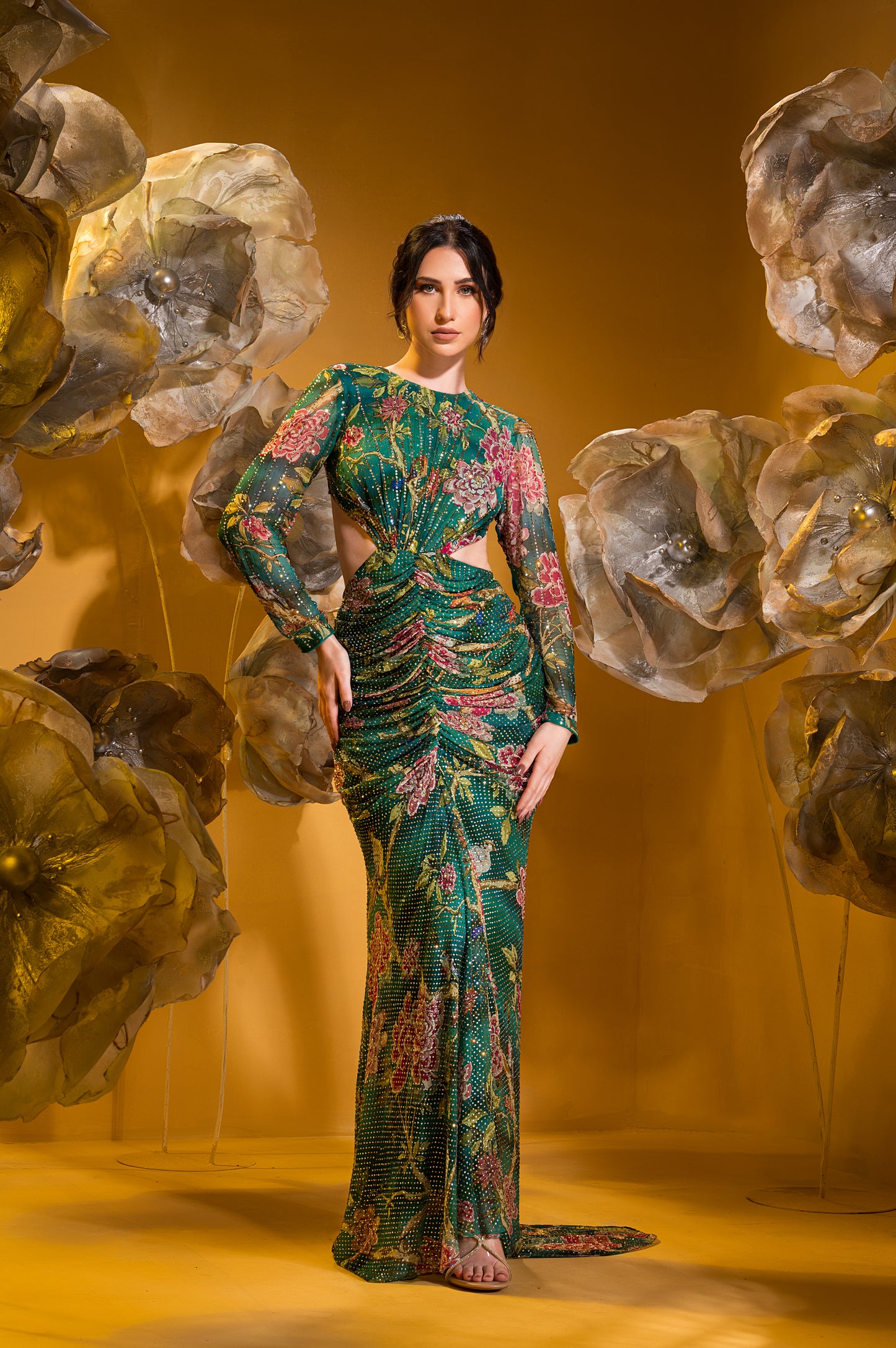 Very Chic Long Evening Red Carpet Gown With Back Trail Full Swarovski On Printed Chiffon