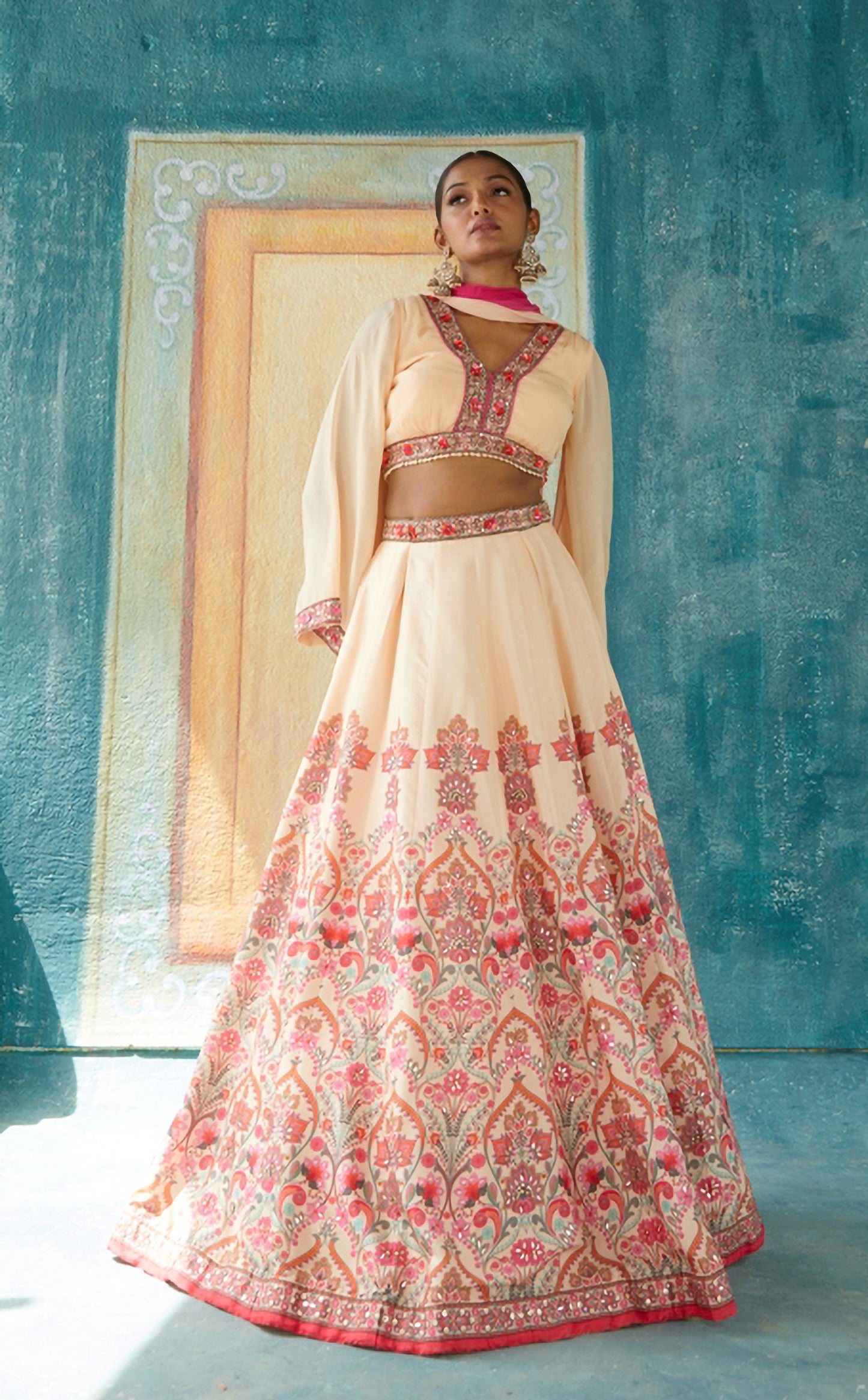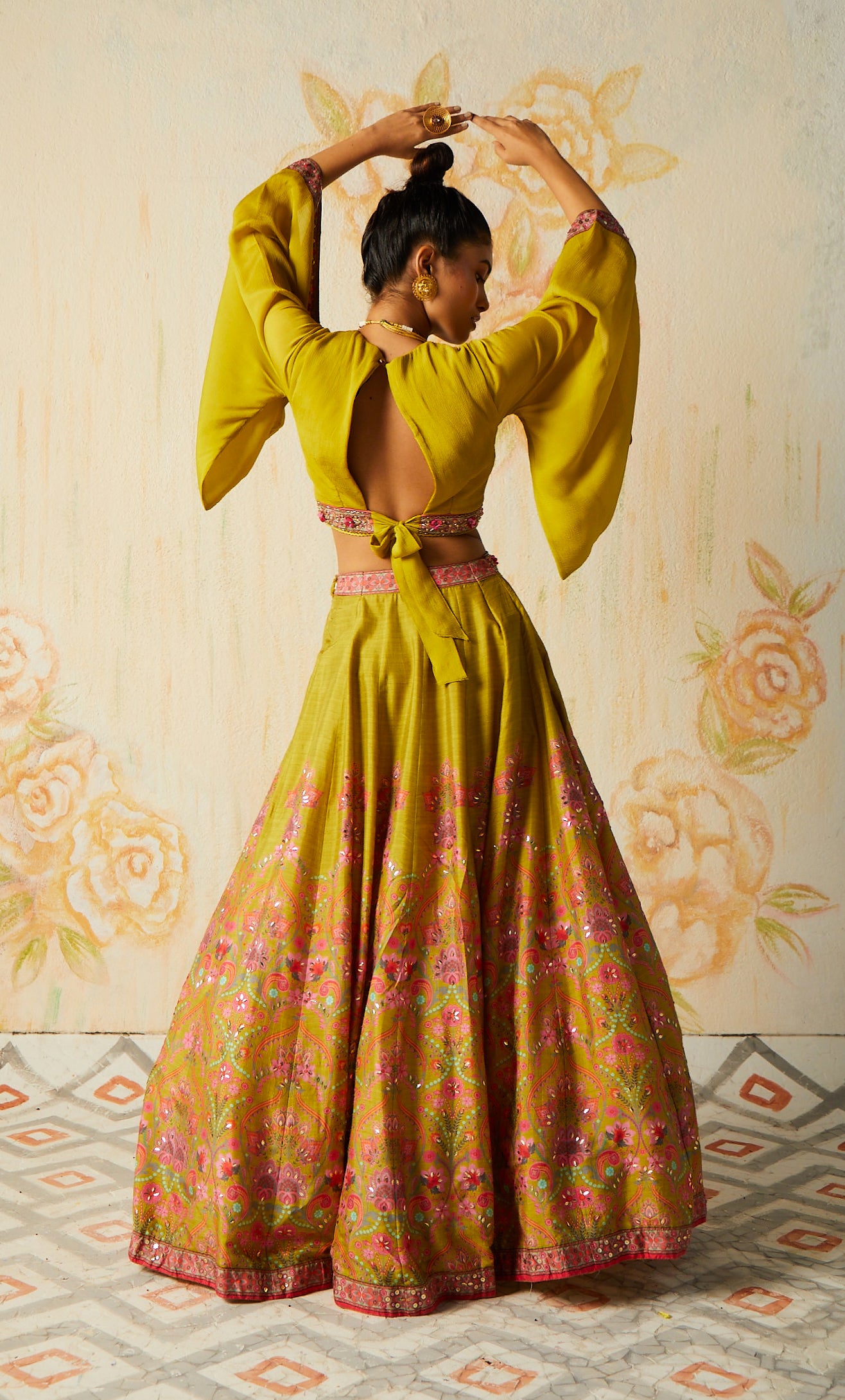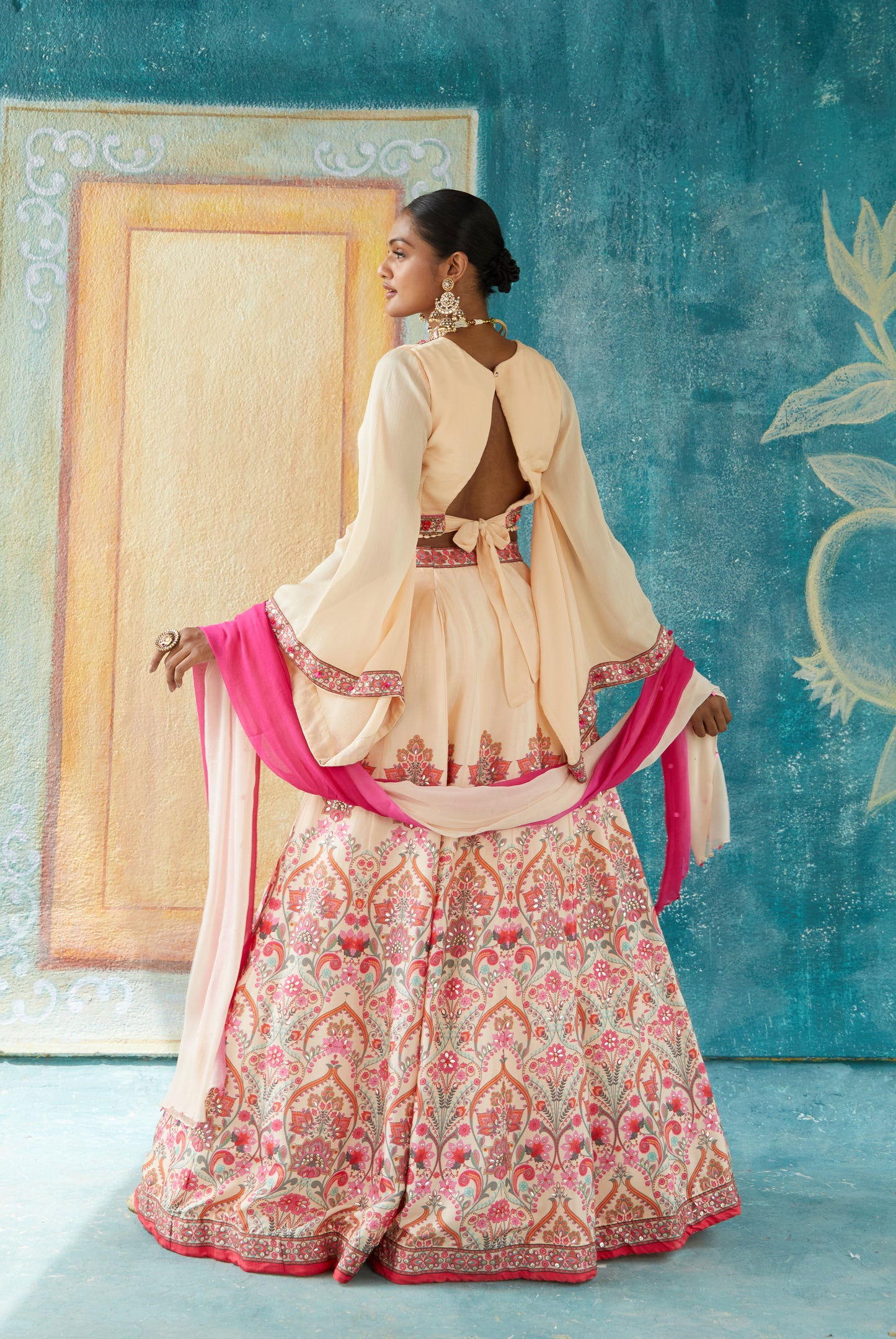 Wine Printed Lehenga Set With Hand Embroidery V- Neckline, Chiffon Flared Sleeves And Shaded Chiffon Dupatta.